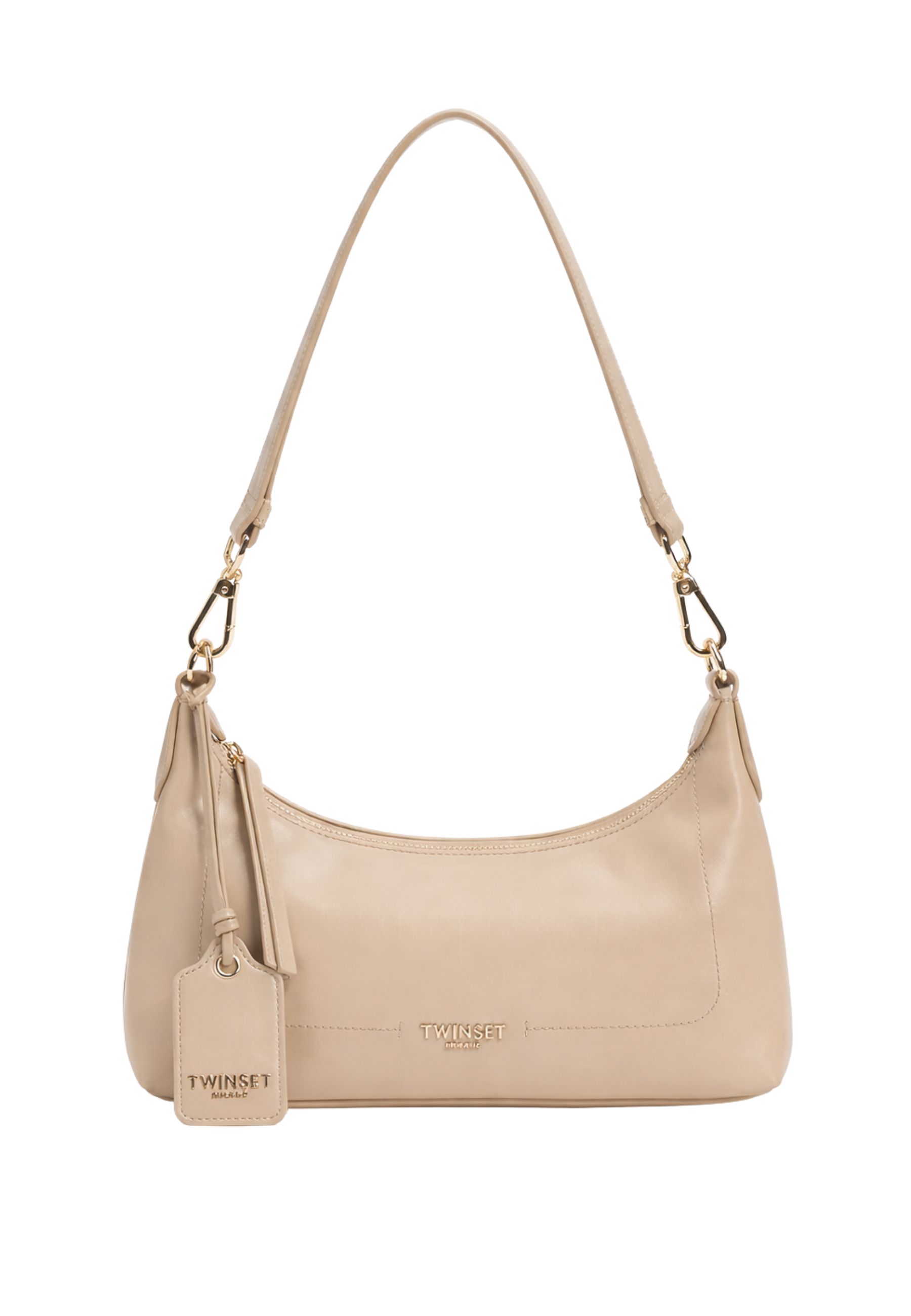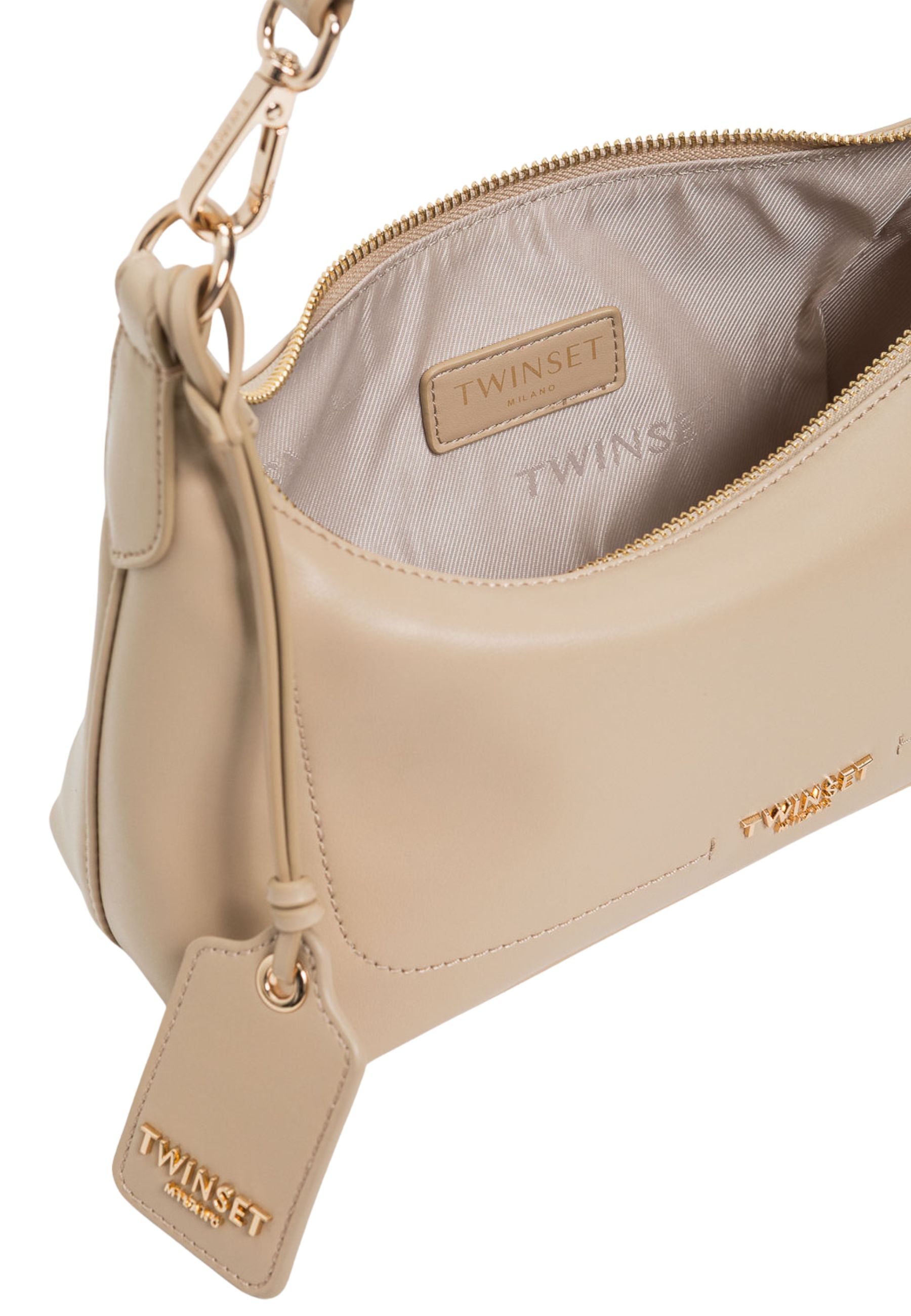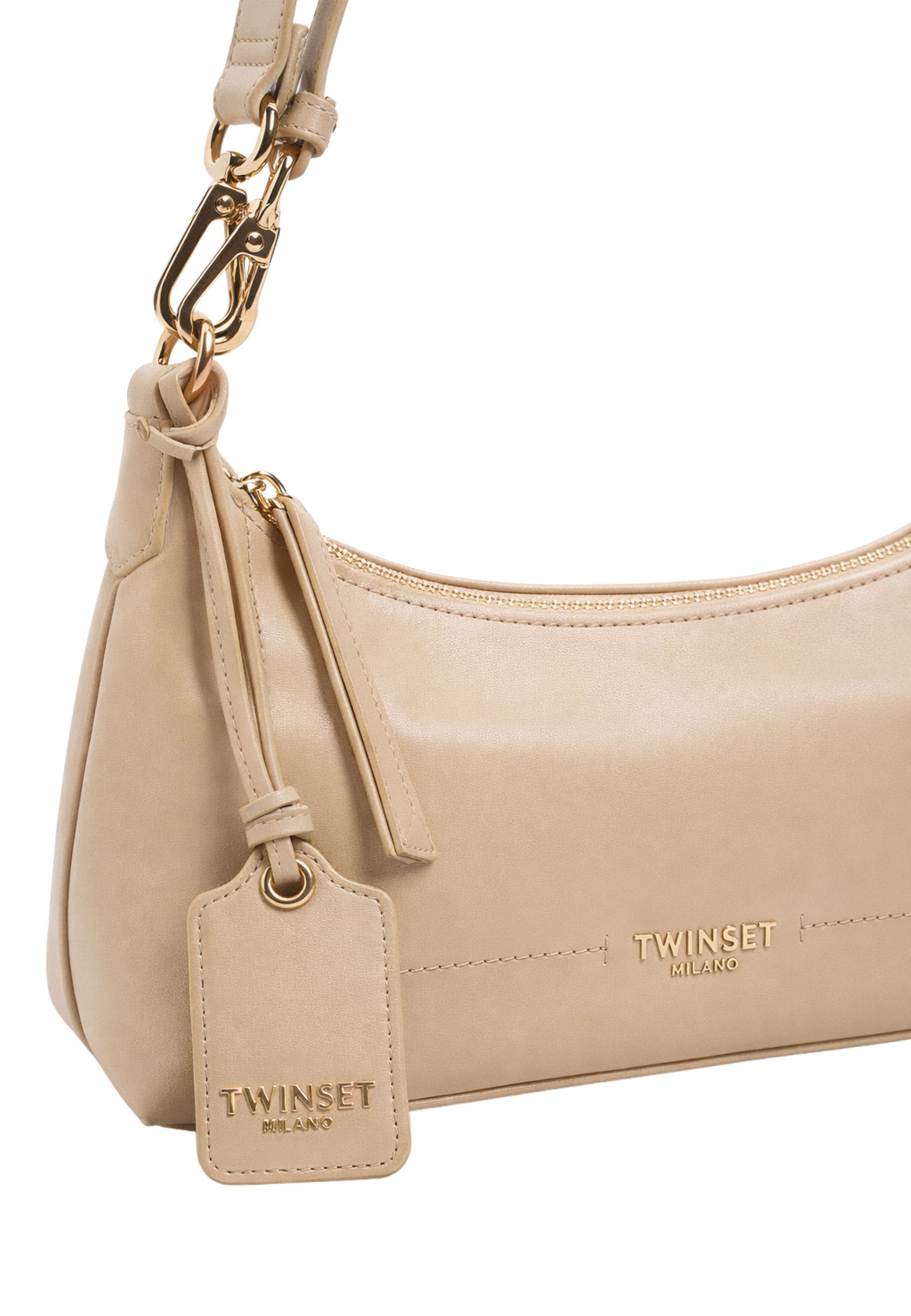 Il modello è impreziosito dal logo Twinset Milano in metallo sul davanti, dettaglio distintivo che conferisce un tocco iconico. La borsa è dotata di doppia tracolla removibile, una più corta per portarla a spalla e una regolabile più lunga per indossarla anche crossbody, offrendo massima versatilità. Gli accessori metallici completano il design con un elegante finish luminoso.