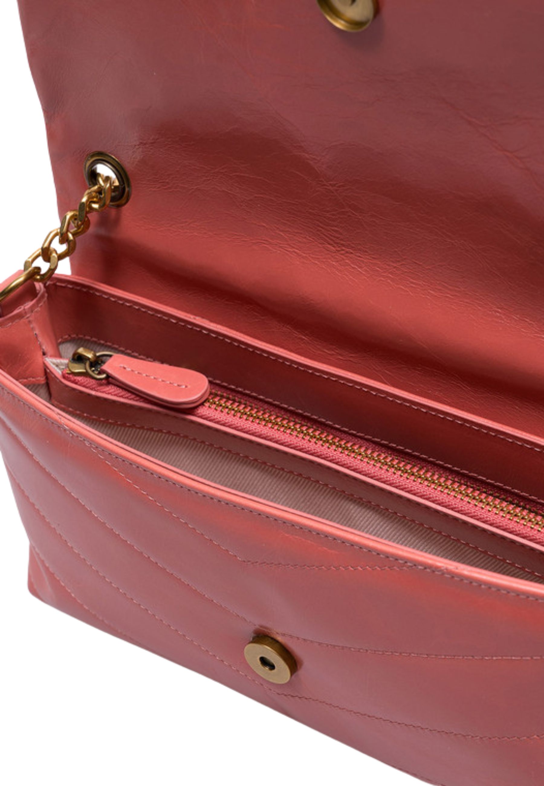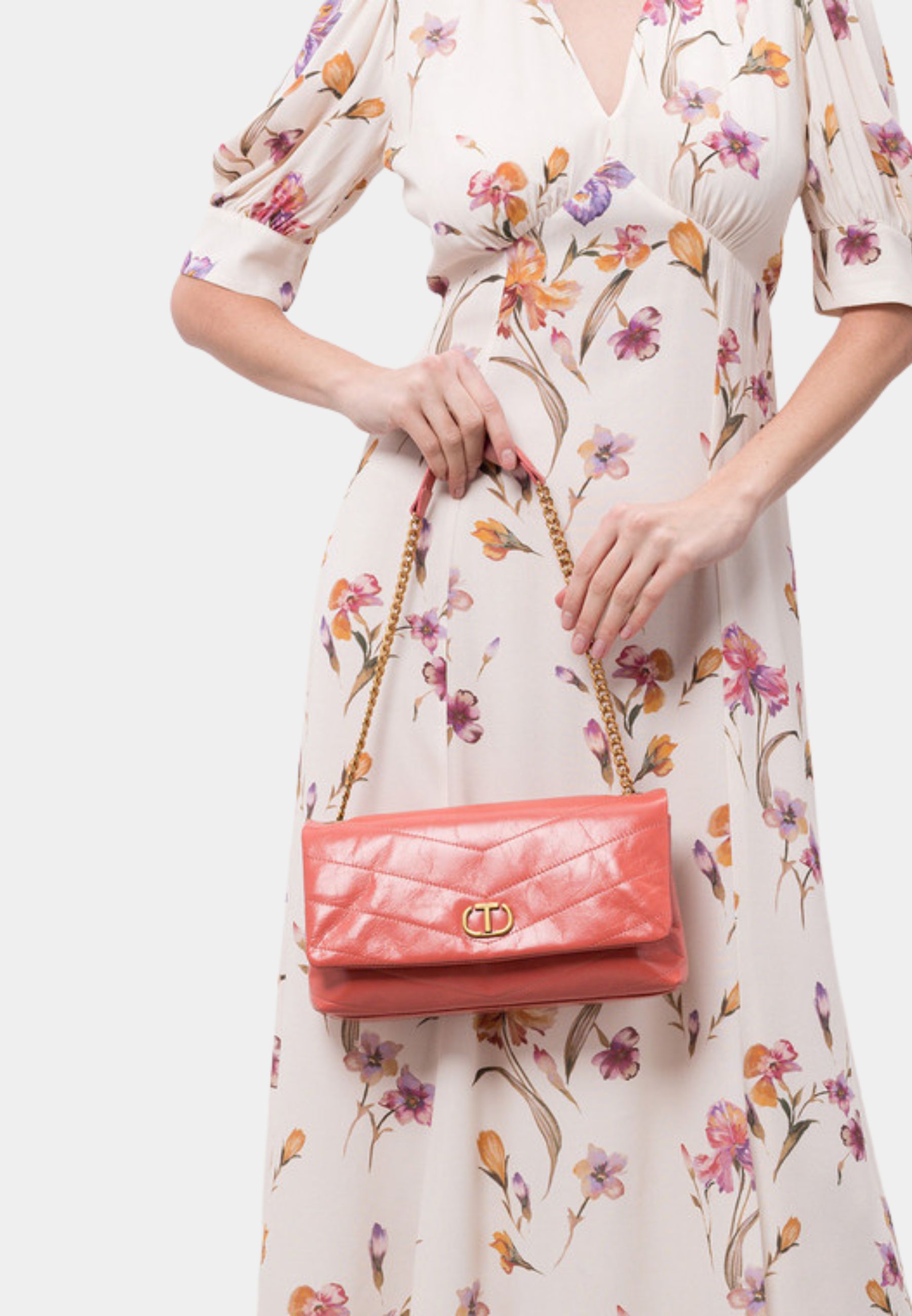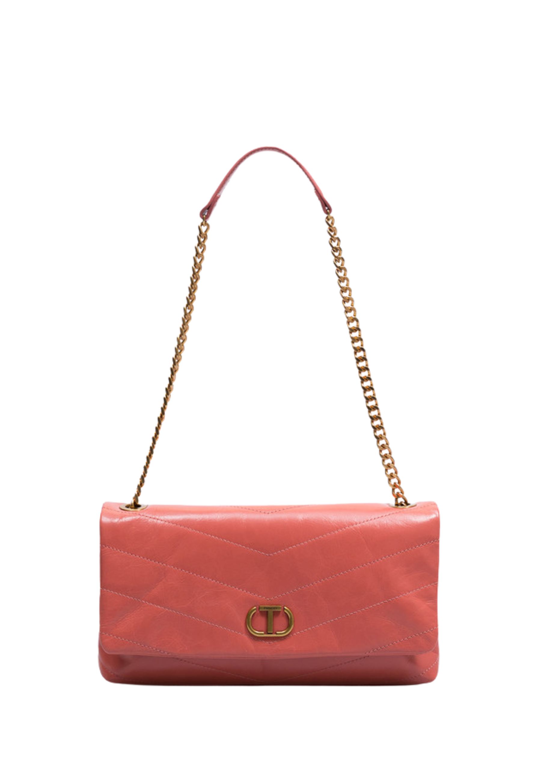 Borsa a tracolla Madison made in Italy in pelle di vitello pieno fiore con impuntura a ricamo effetto quilted, senza imbottitura. Ha la chiusura con patta e magnete, la tracolla a spalla in catena con spallaccio in pelle per un maggiore comfort, il logo Oval T davanti, le galvaniche color ottone, foderata.