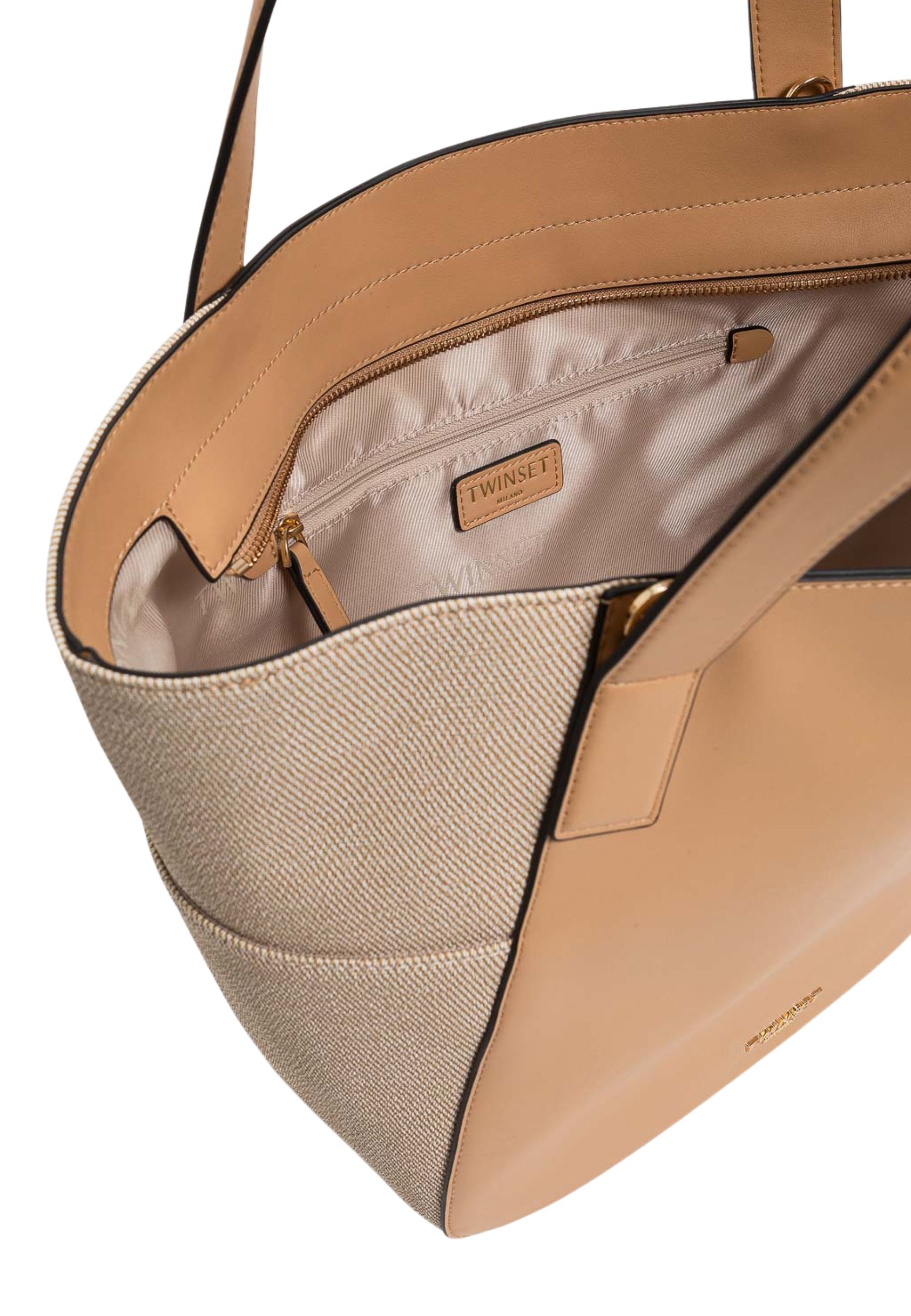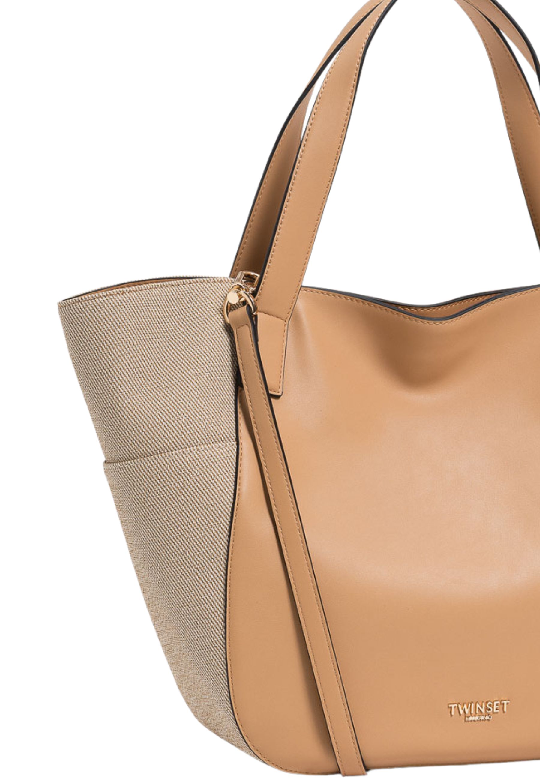 Borsa da donna modello HOBO dal design contemporaneo e funzionale, caratterizzata da una silhouette morbida e capiente, ideale per luso quotidiano. Il modello presenta doppi manici per portabilità a spalla e tracolla regolabile e removibile, che consente una vestibilità versatile. Il corpo della borsa combina materiale effetto pelle con inserti laterali in tessuto, valorizzati da finiture curate e profili rifiniti a contrasto. Chiusura superiore con zip, interno foderato e dotato di tasca con zip per una migliore organizzazione degli spazi. Logo Twinset applicato sul davanti in metallo tono su tono.