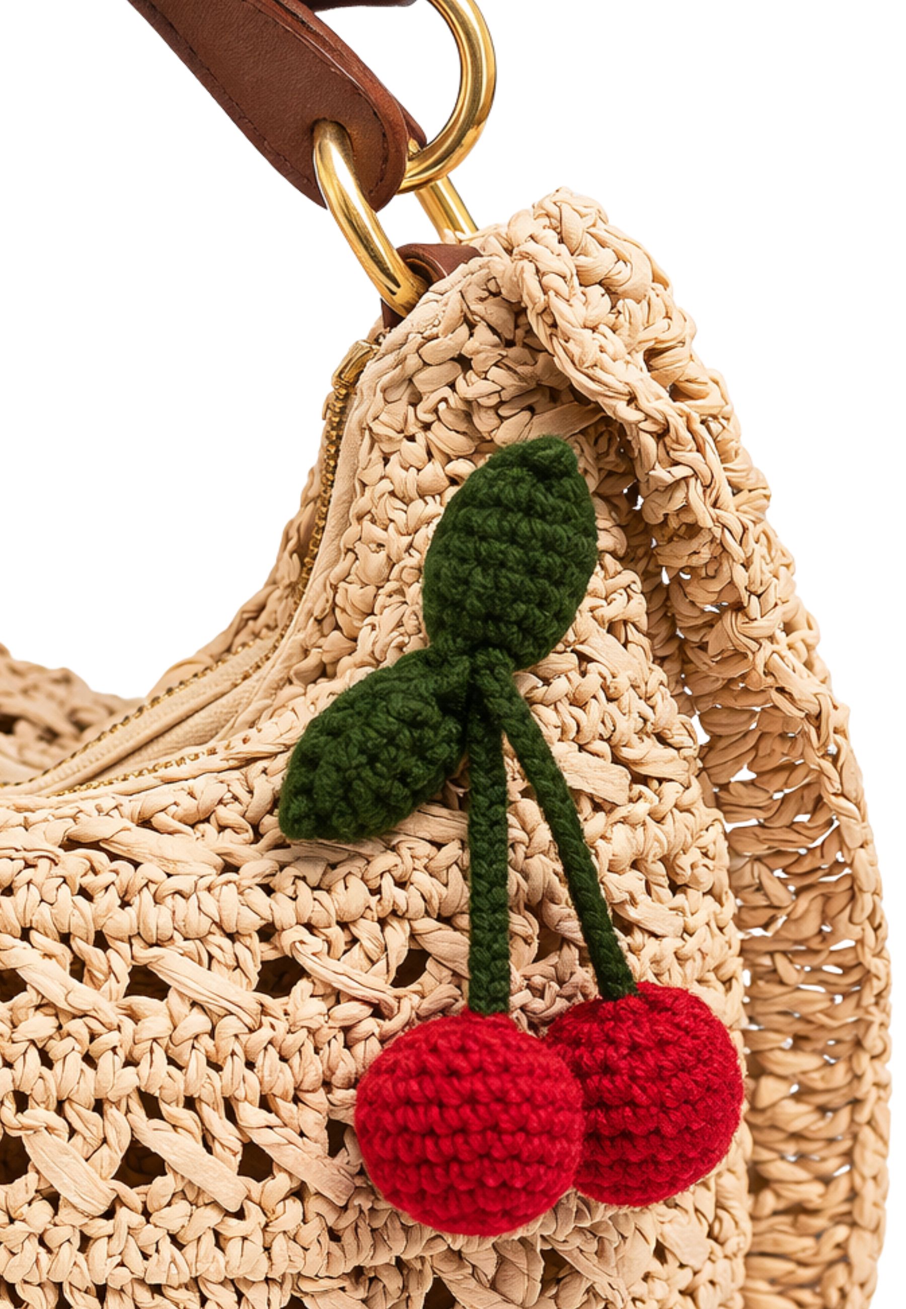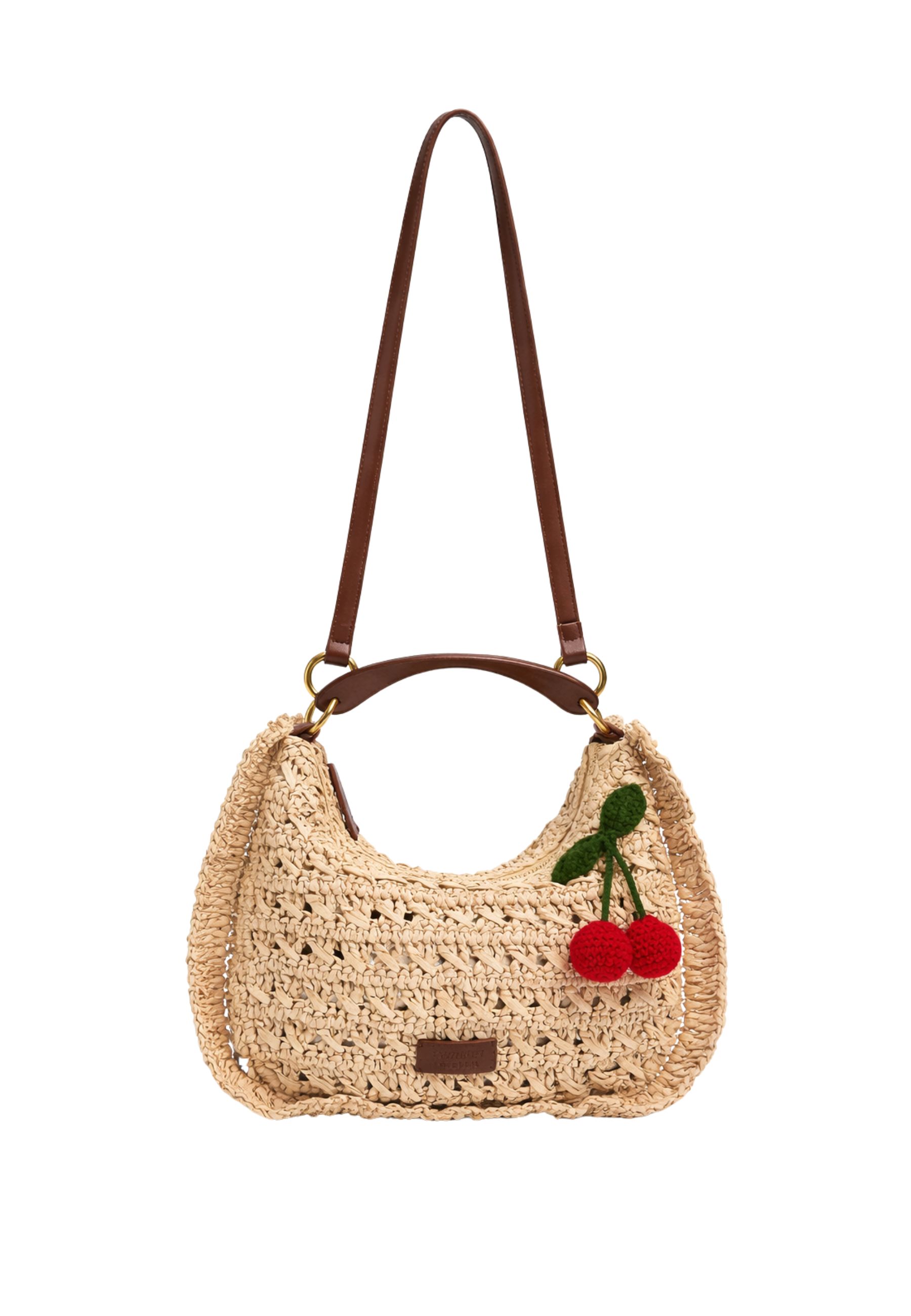 La struttura è impreziosita da dettagli in effetto pelle color cuoio e accessori metallici che donano un tocco elegante. Il manico lungo permette di indossarla comodamente a spalla, mentre il charm decorativo a forma di ciliegie aggiunge un elemento distintivo e giocoso al design. Linterno è foderato per garantire maggiore praticità e resistenza nelluso quotidiano.