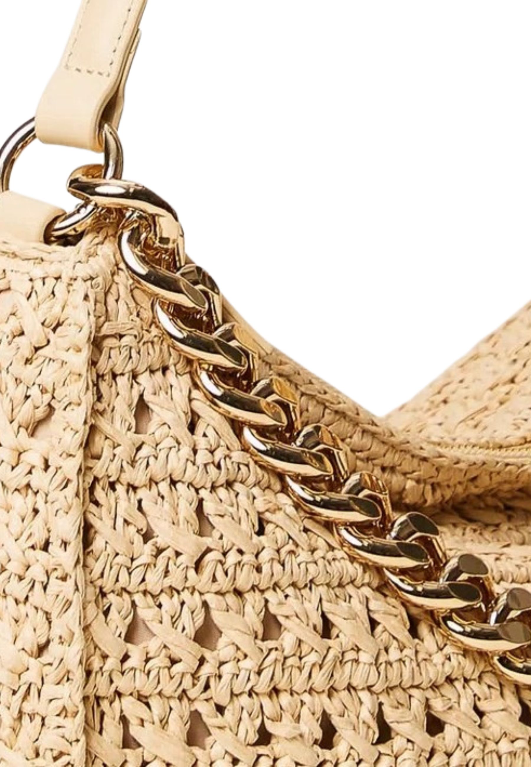 La borsa hobo Liliane grande interpreta lestetica estiva con un equilibrio raffinato tra artigianalità e dettagli contemporanei. Realizzata in rafia di cellulosa lavorata interamente a mano a crochet, presenta una texture ricercata che valorizza la leggerezza del materiale e la qualità della lavorazione.