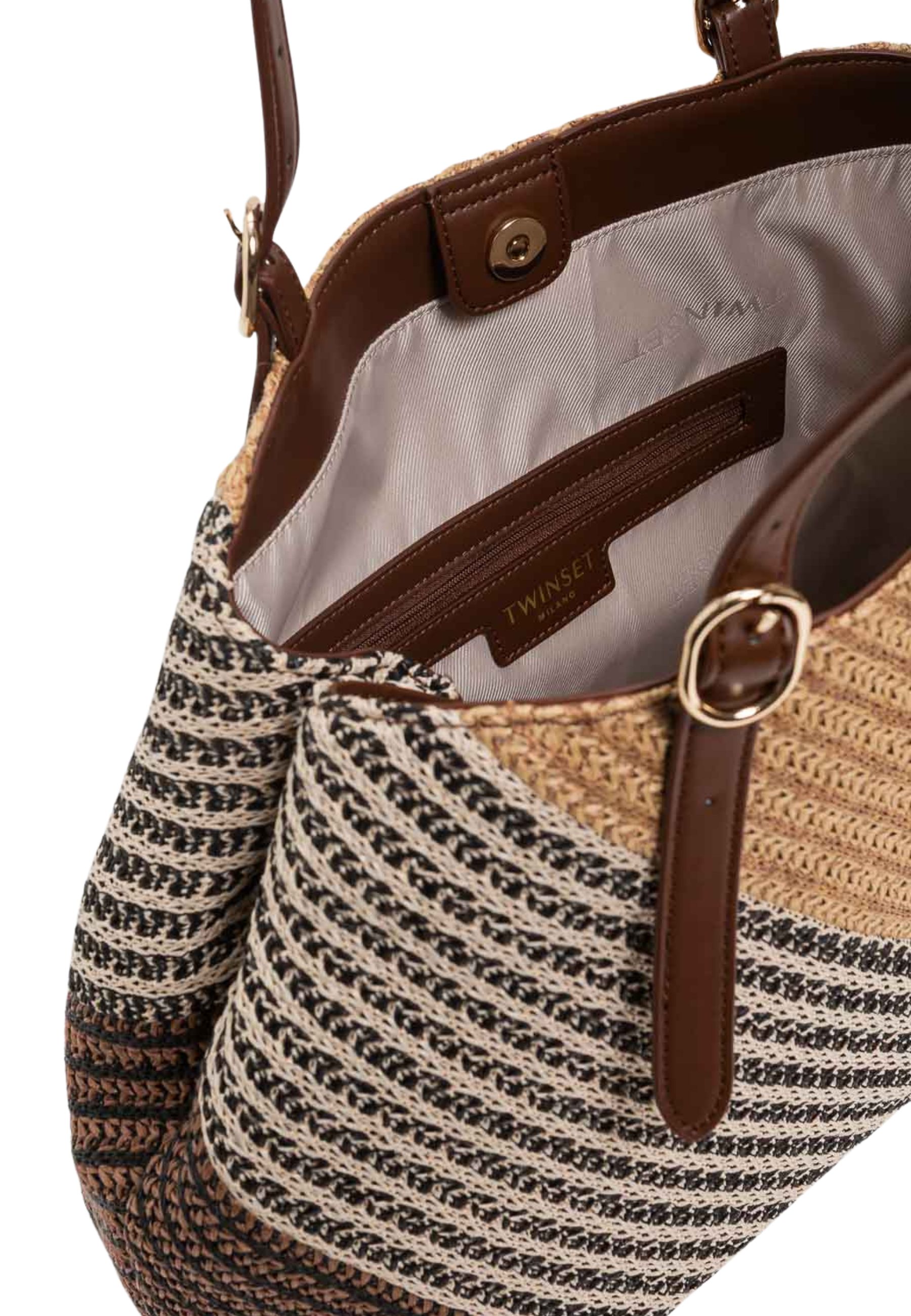 Borsa Twinset Milano dallo stile raffinato e contemporaneo, realizzata in tessuto intrecciato con motivo geometrico multicolore che dona carattere e personalità al modello. Il design capiente e strutturato la rende perfetta per accompagnare con eleganza i look quotidiani e le occasioni estive.