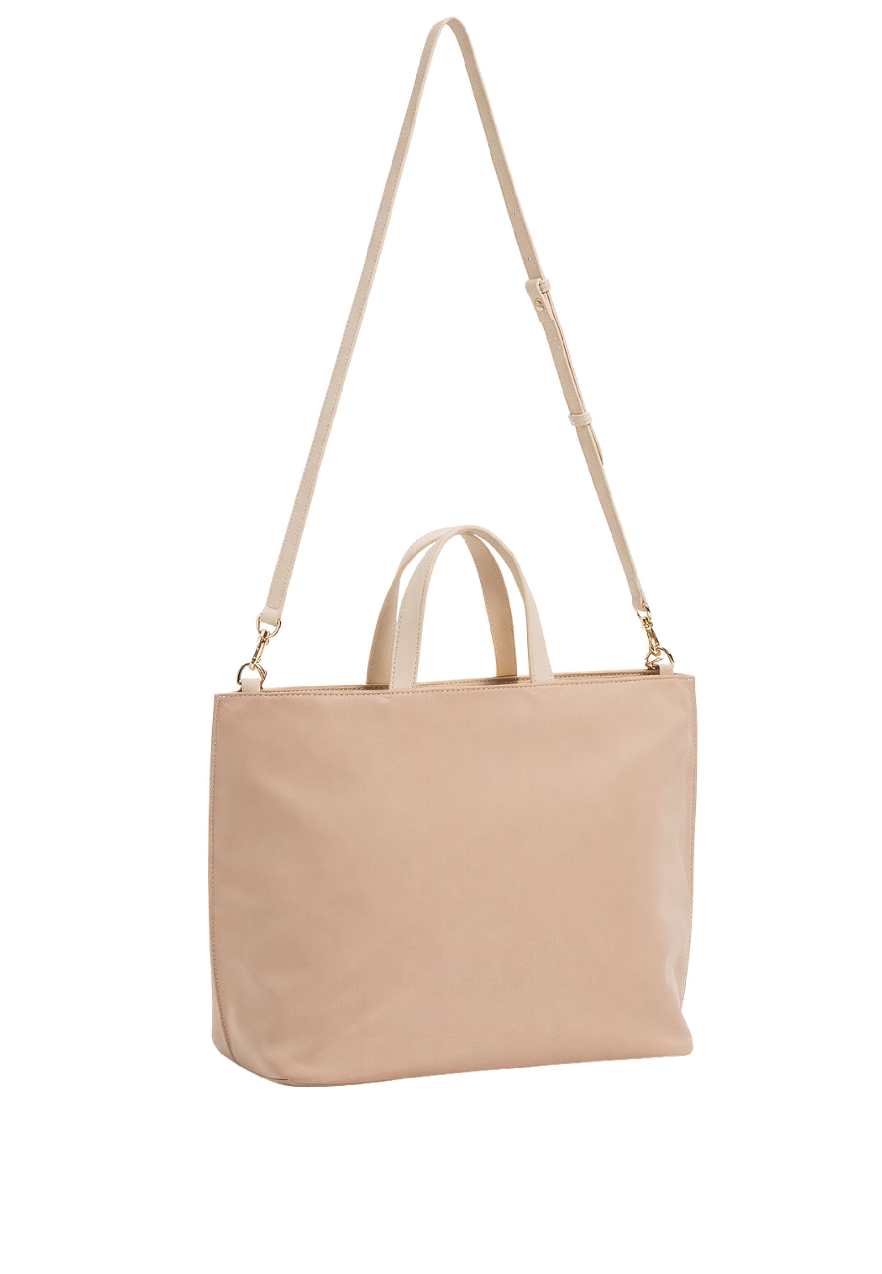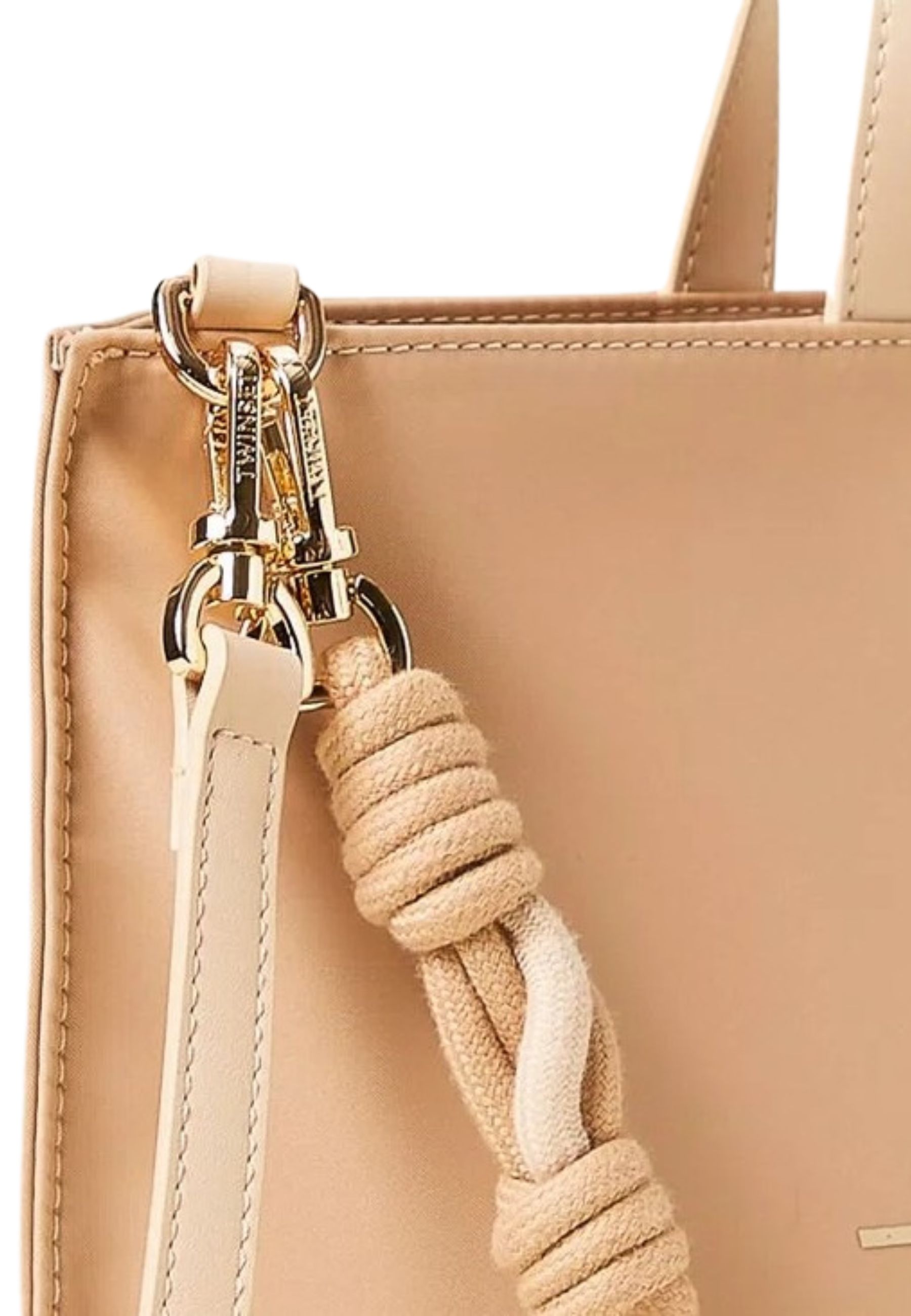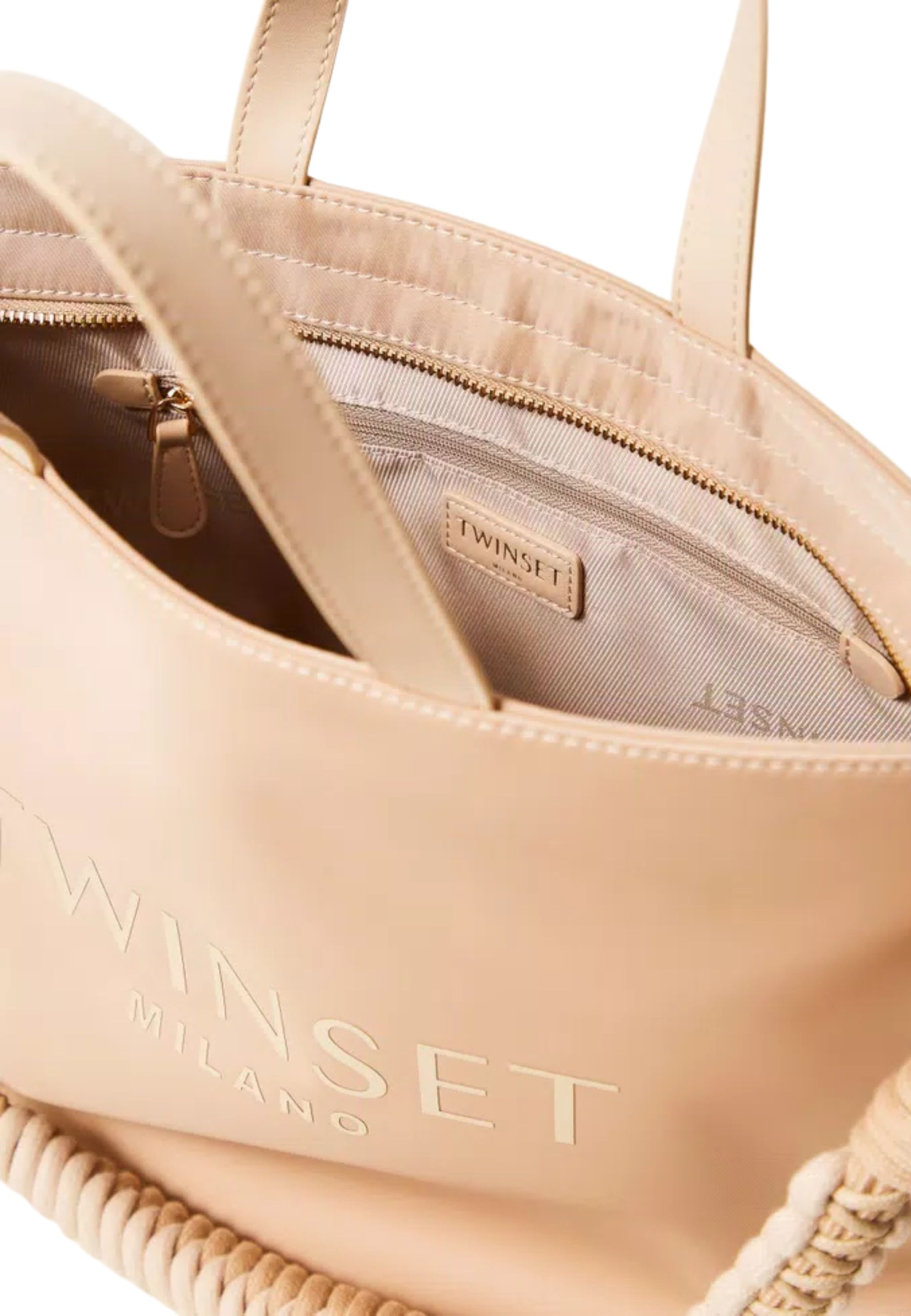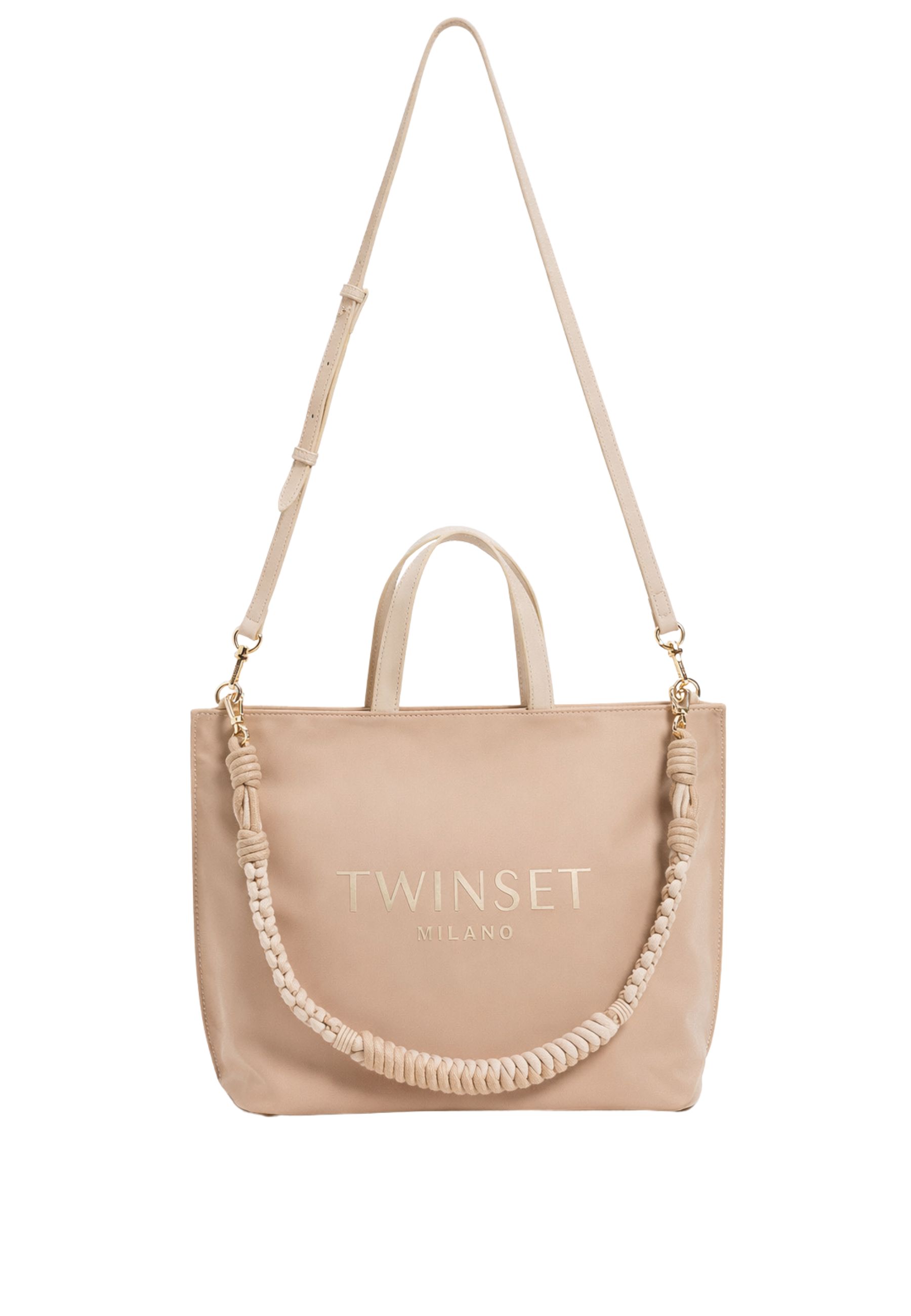 Borsa shopper Twinset realizzata in tessuto tecnico strutturato, impreziosita da rifiniture in materiale effetto pelle di vitello che conferiscono eleganza e resistenza al design. Il modello è personalizzato dal logo lettering Twinset stampato a spessore sul fronte, elemento iconico e distintivo.
