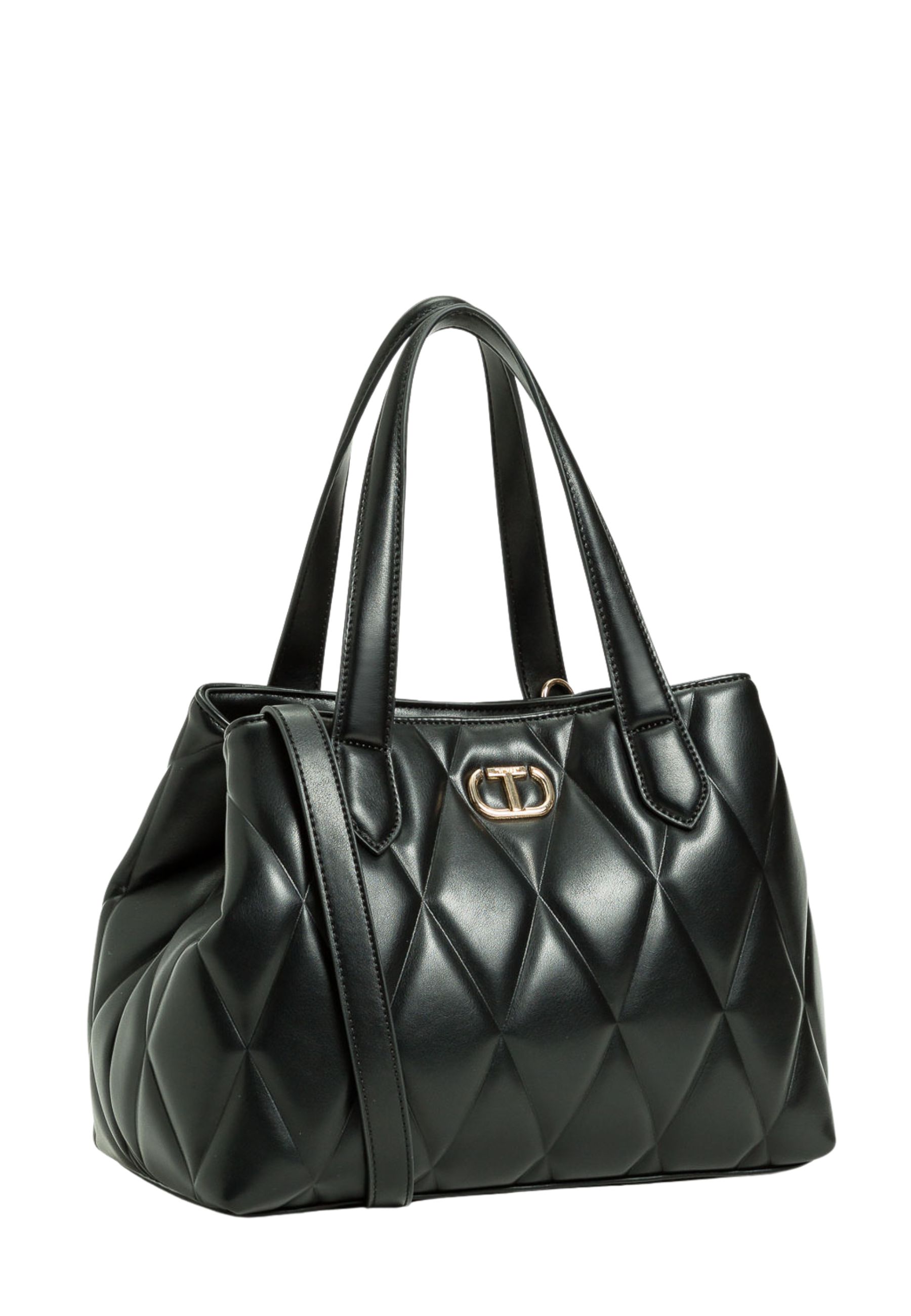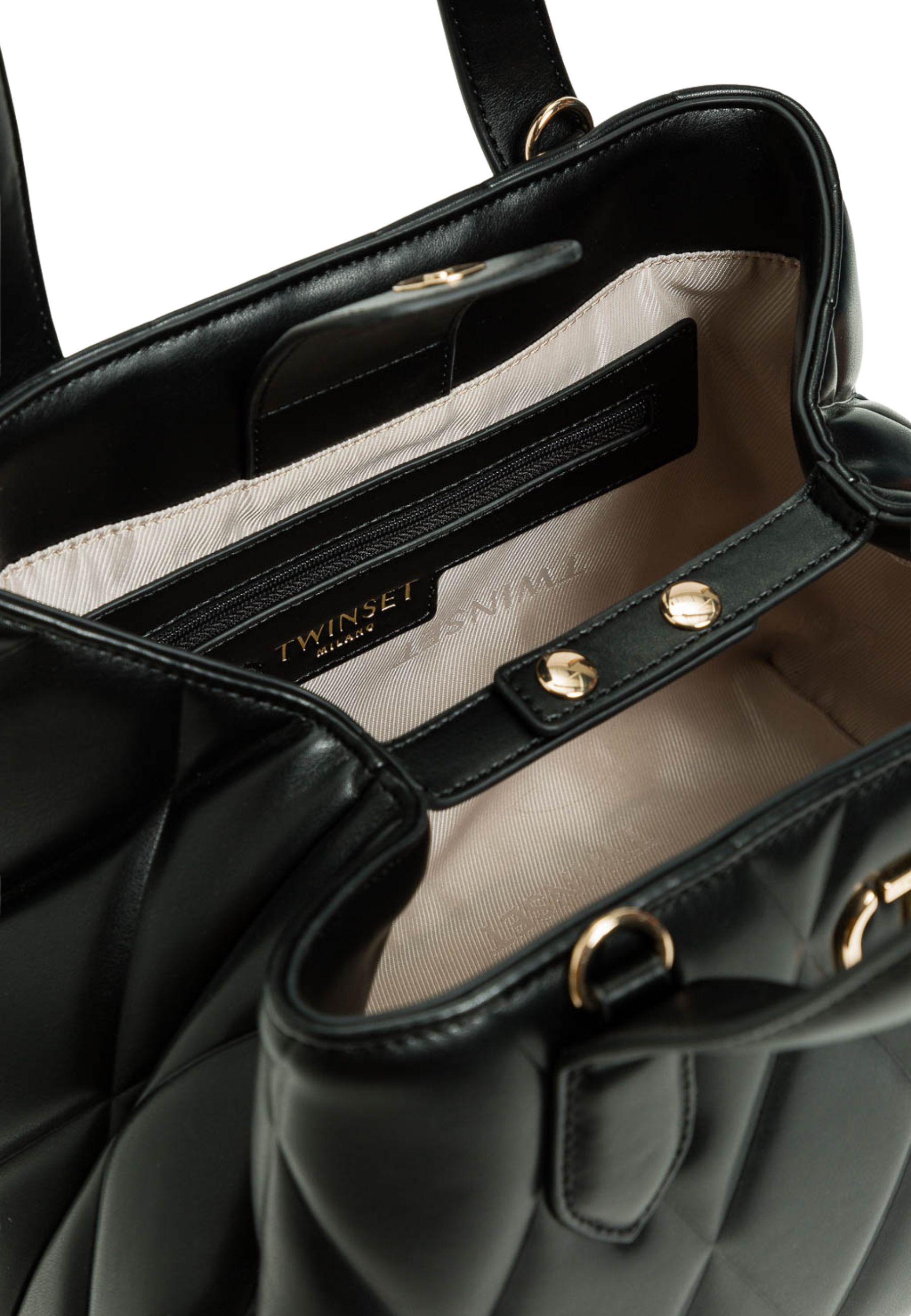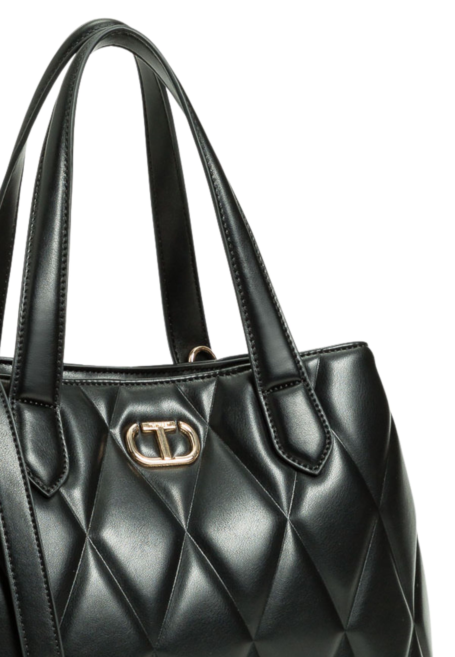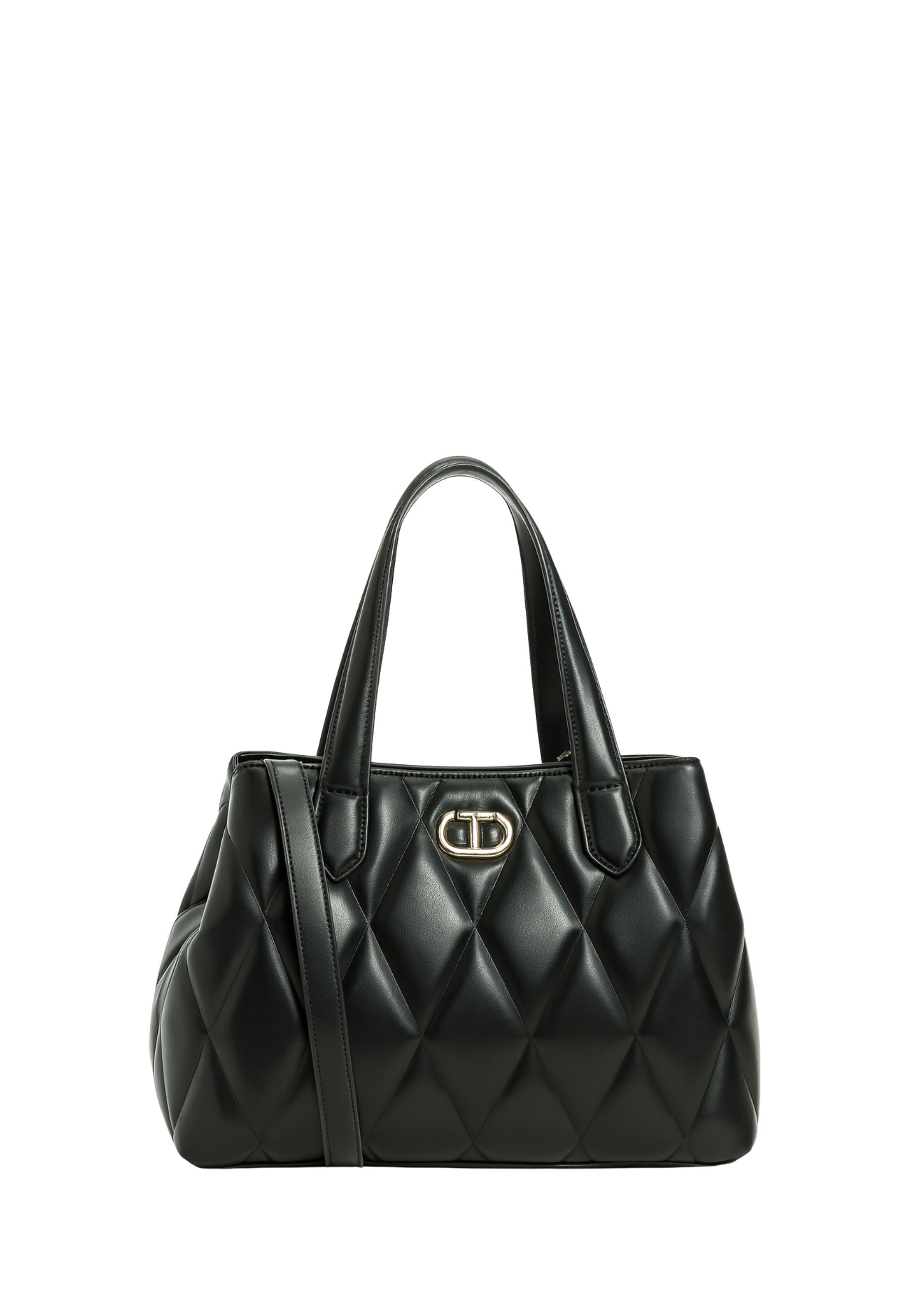 Elegante e versatile, questa borsa shopper Twinset è realizzata in materiale sintetico effetto pelle con motivo trapuntato a rombi. Il design morbido e strutturato è valorizzato dal logo metallico frontale e dalla pratica tracolla regolabile e removibile. I doppi manici consentono un comodo trasporto a mano o a spalla.