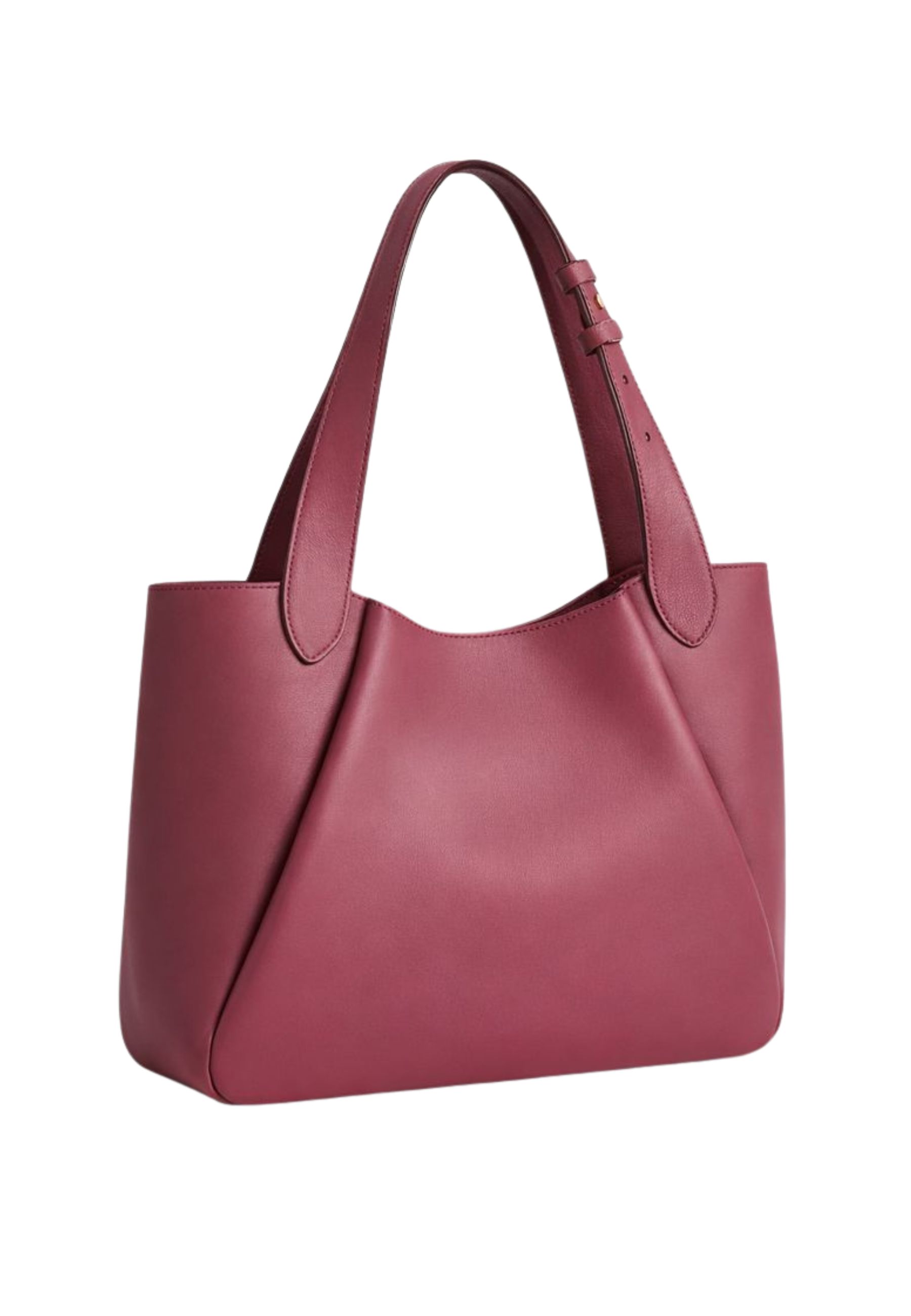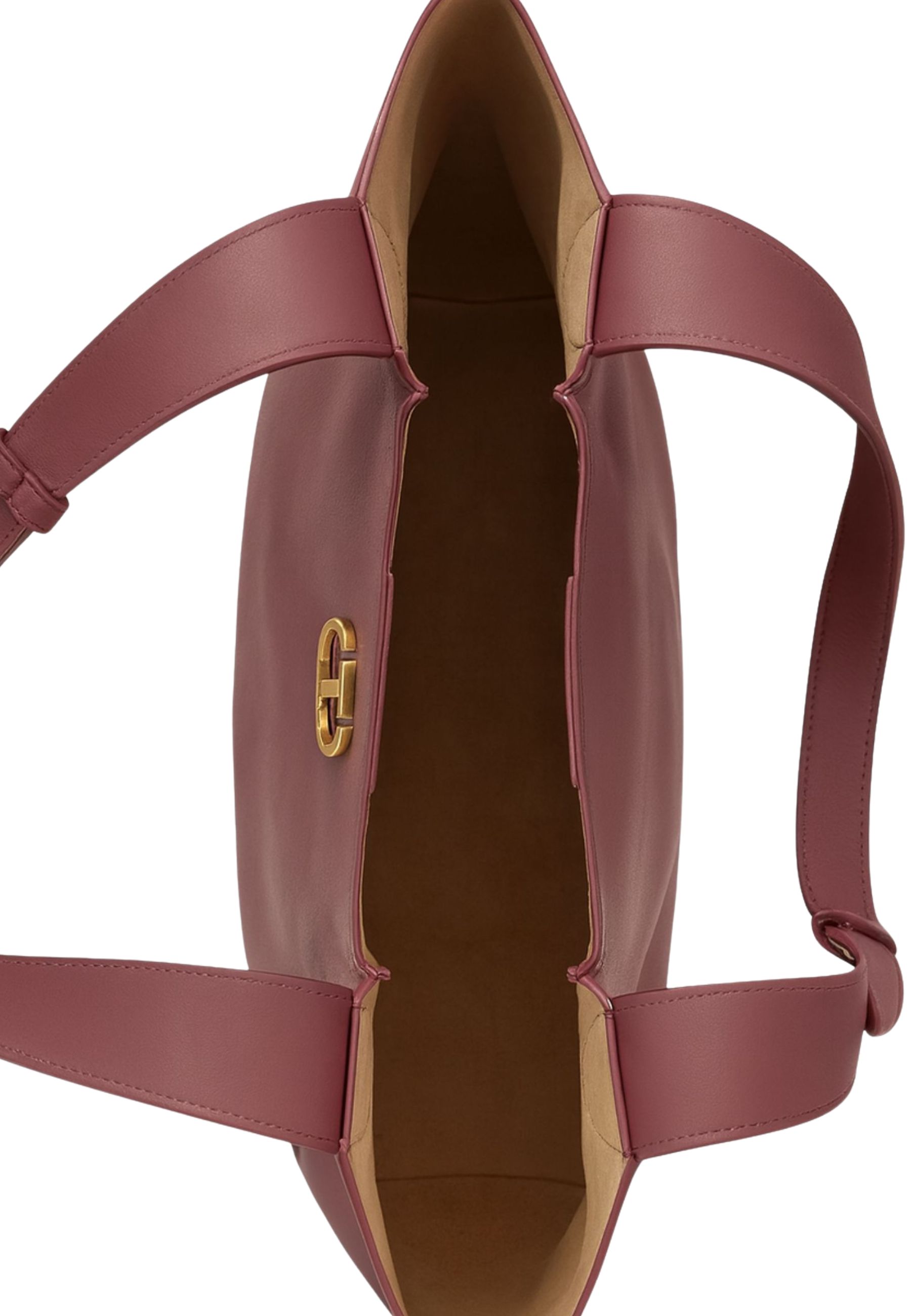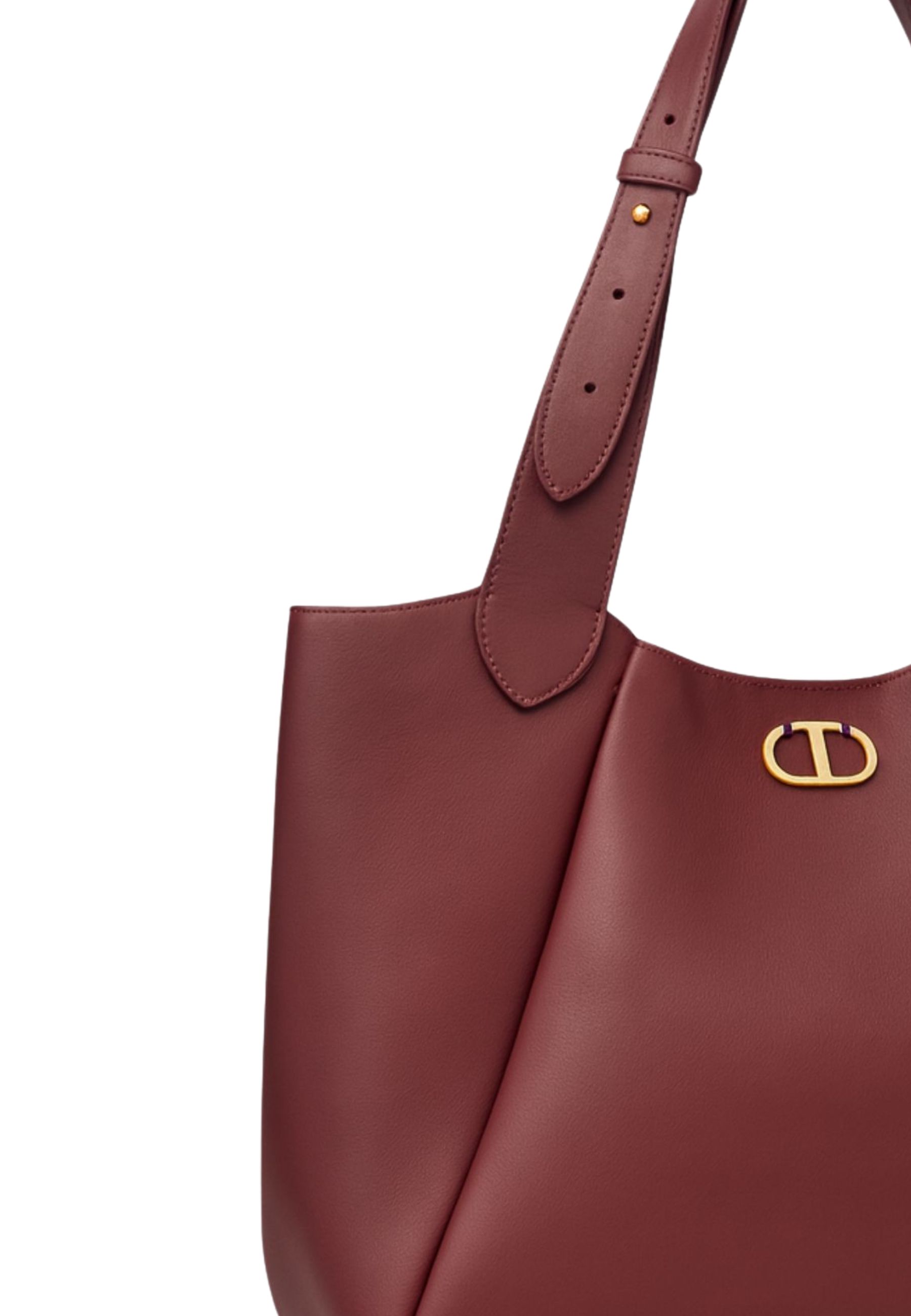 Raffinata ed essenziale, questa borsa shopping Twinset è realizzata in morbida pelle bovina di alta qualità, caratterizzata da una texture liscia e unelegante tonalità burgundy. Le pieghe laterali valorizzano la struttura del modello donandogli un look contemporaneo e sofisticato, mentre il logo metallico dorato frontale aggiunge un tocco iconico e luminoso.