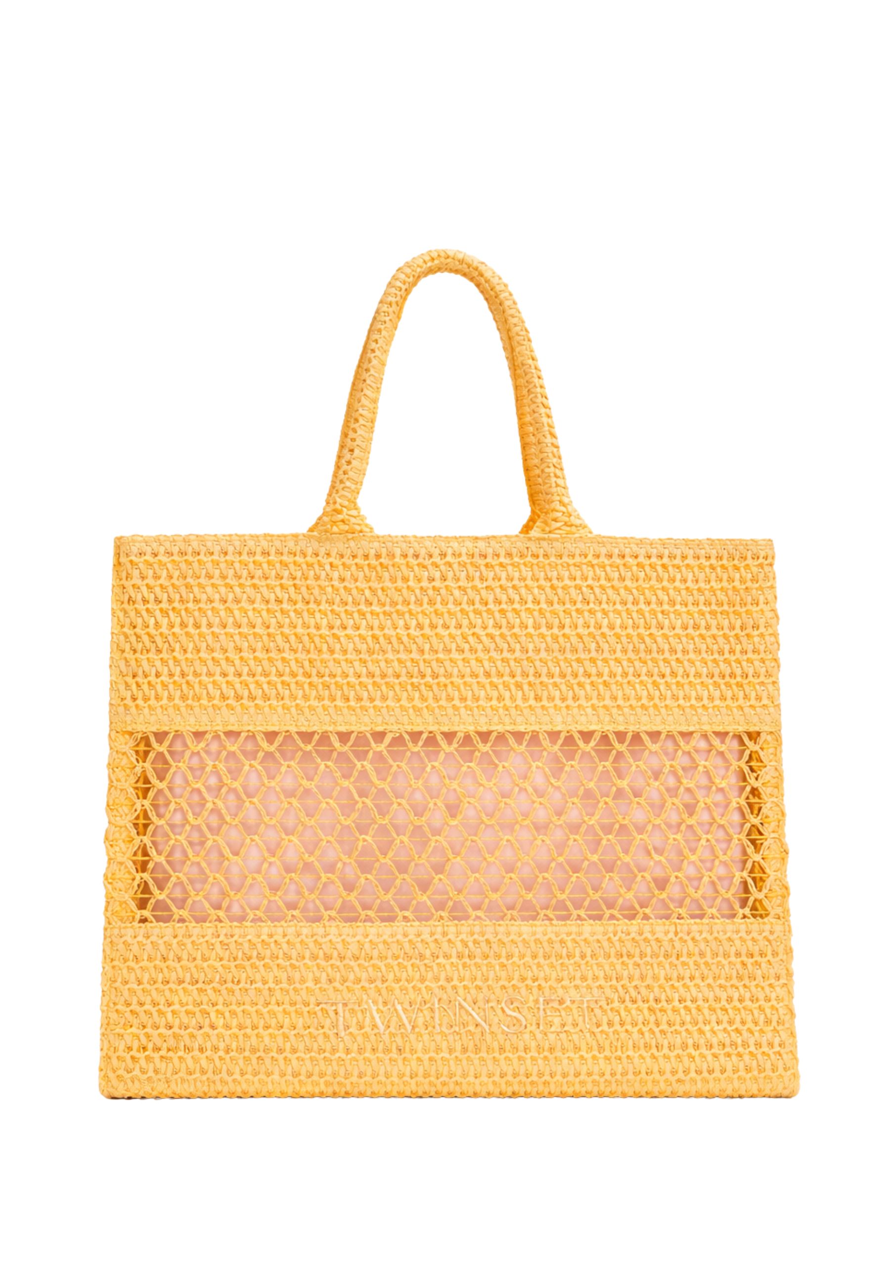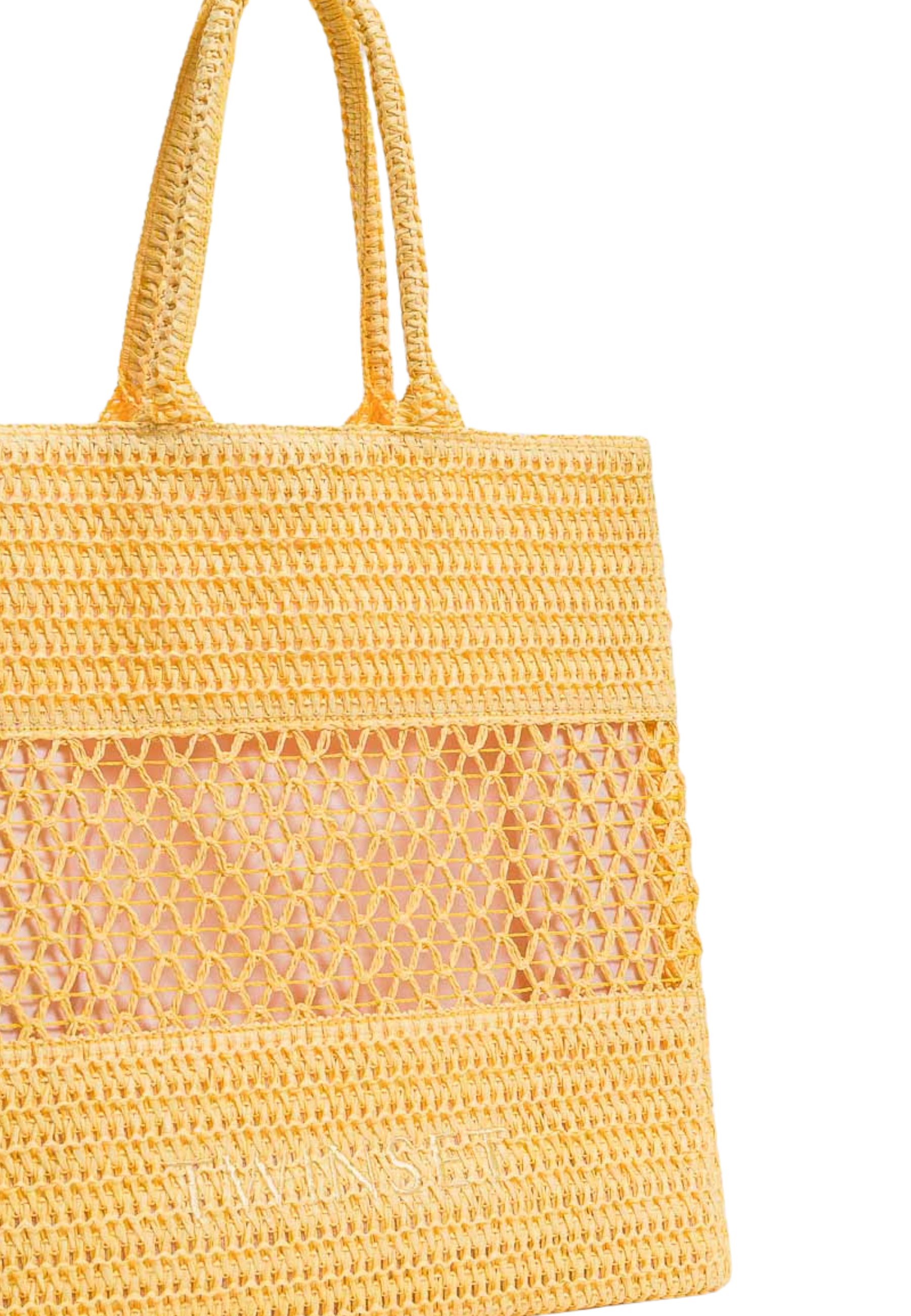 Borsa Twinset dal design strutturato, caratterizzata da lavorazione effetto intrecciato che dona texture e profondità alla superficie. Il modello presenta doppio manico superiore per un utilizzo pratico a mano e costruzione rigida che mantiene la forma.