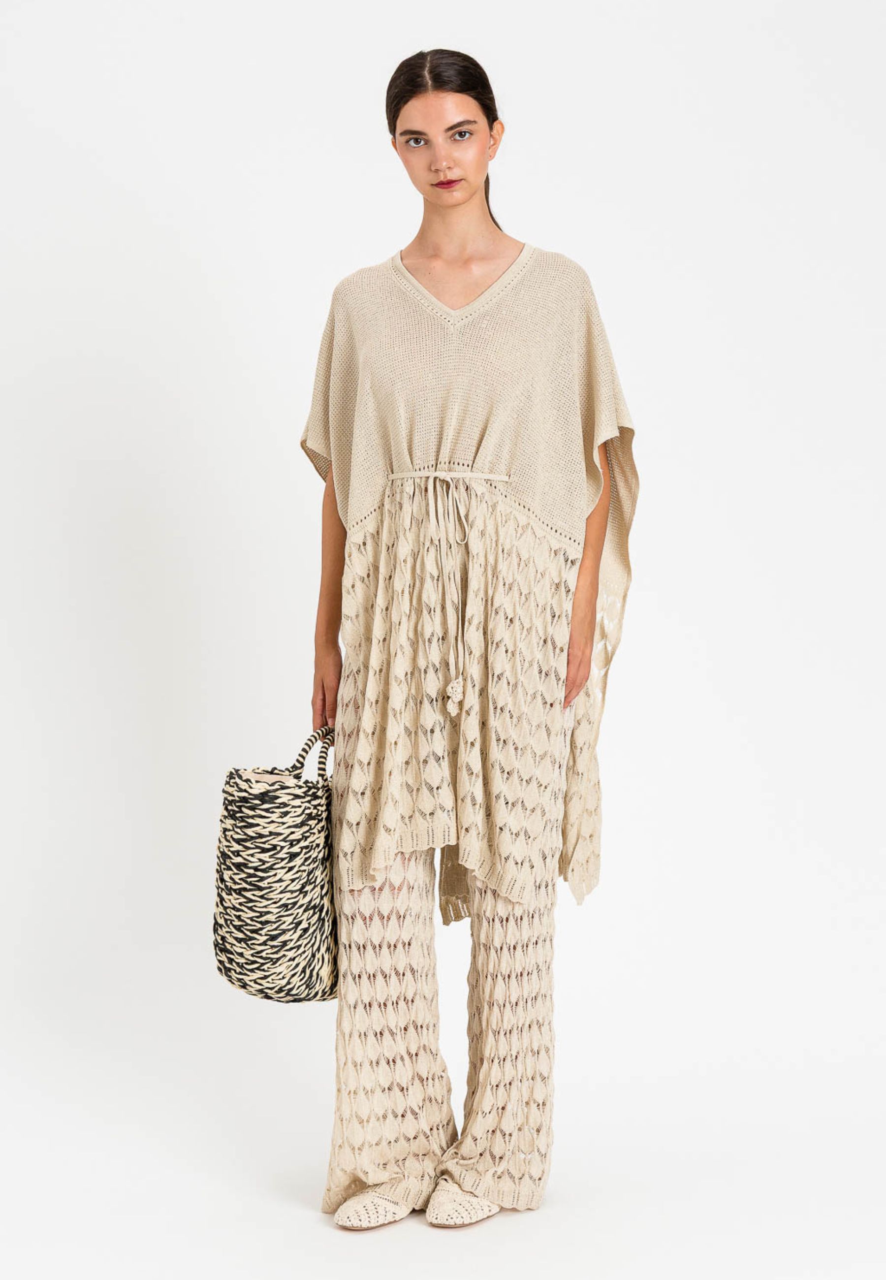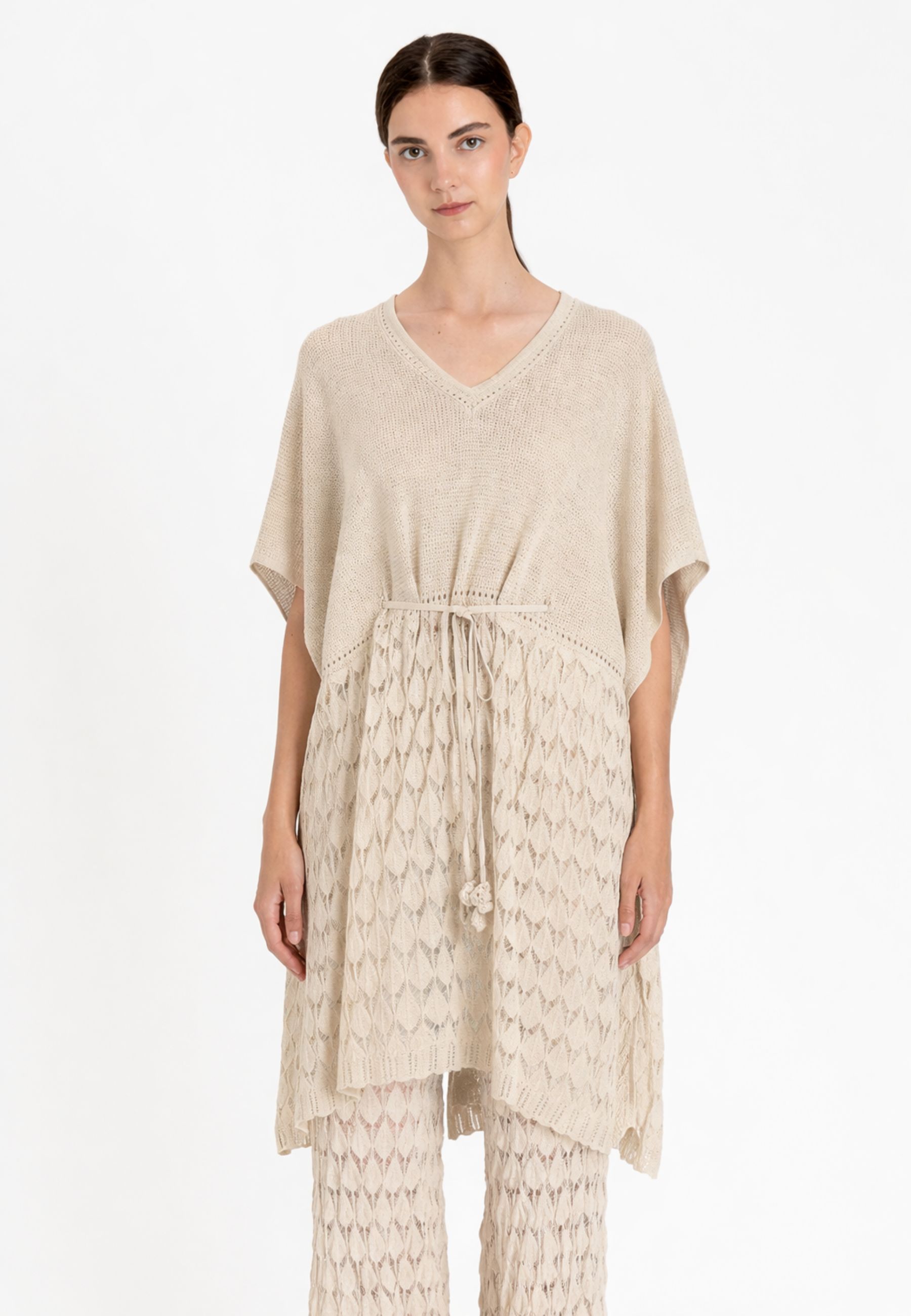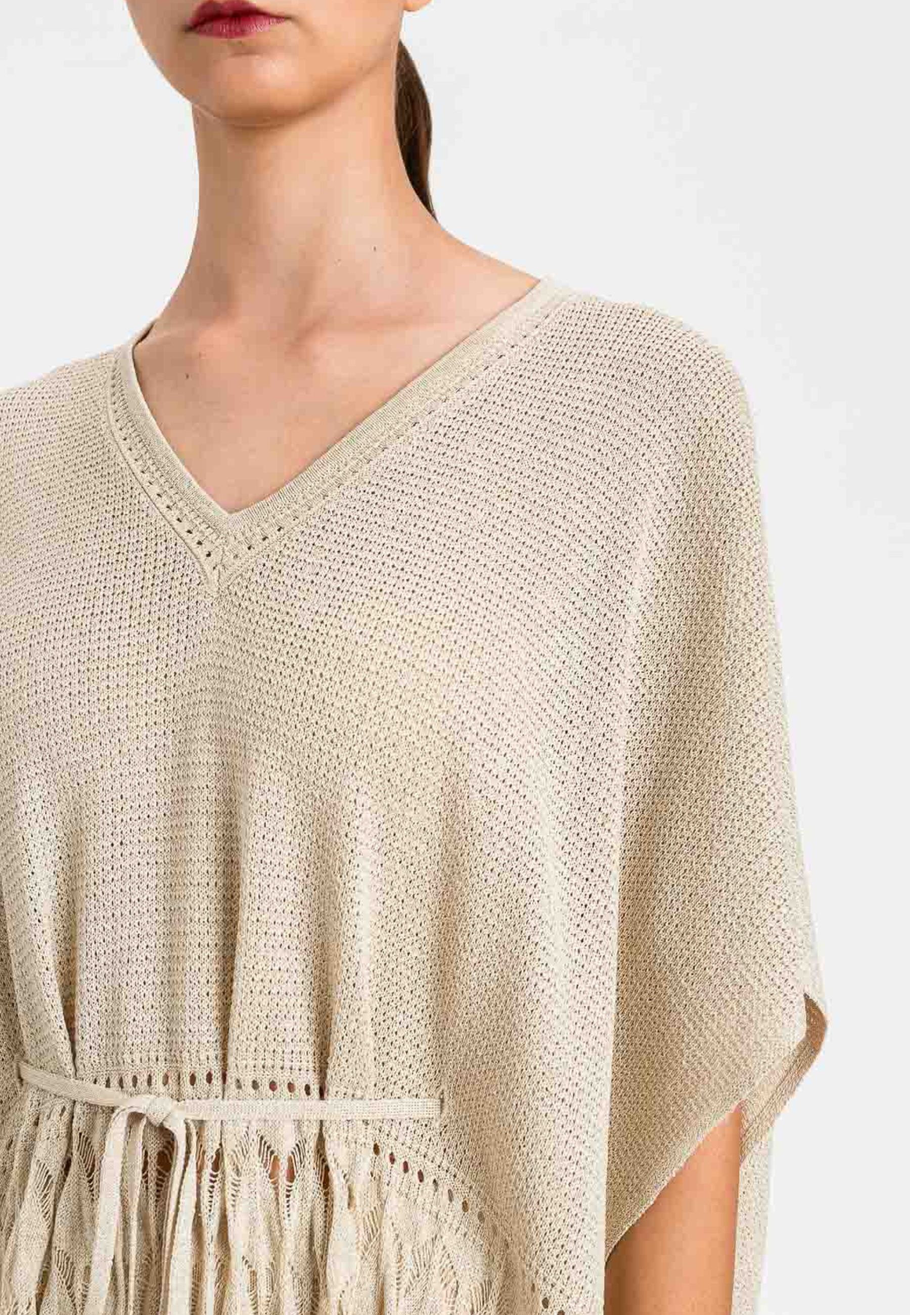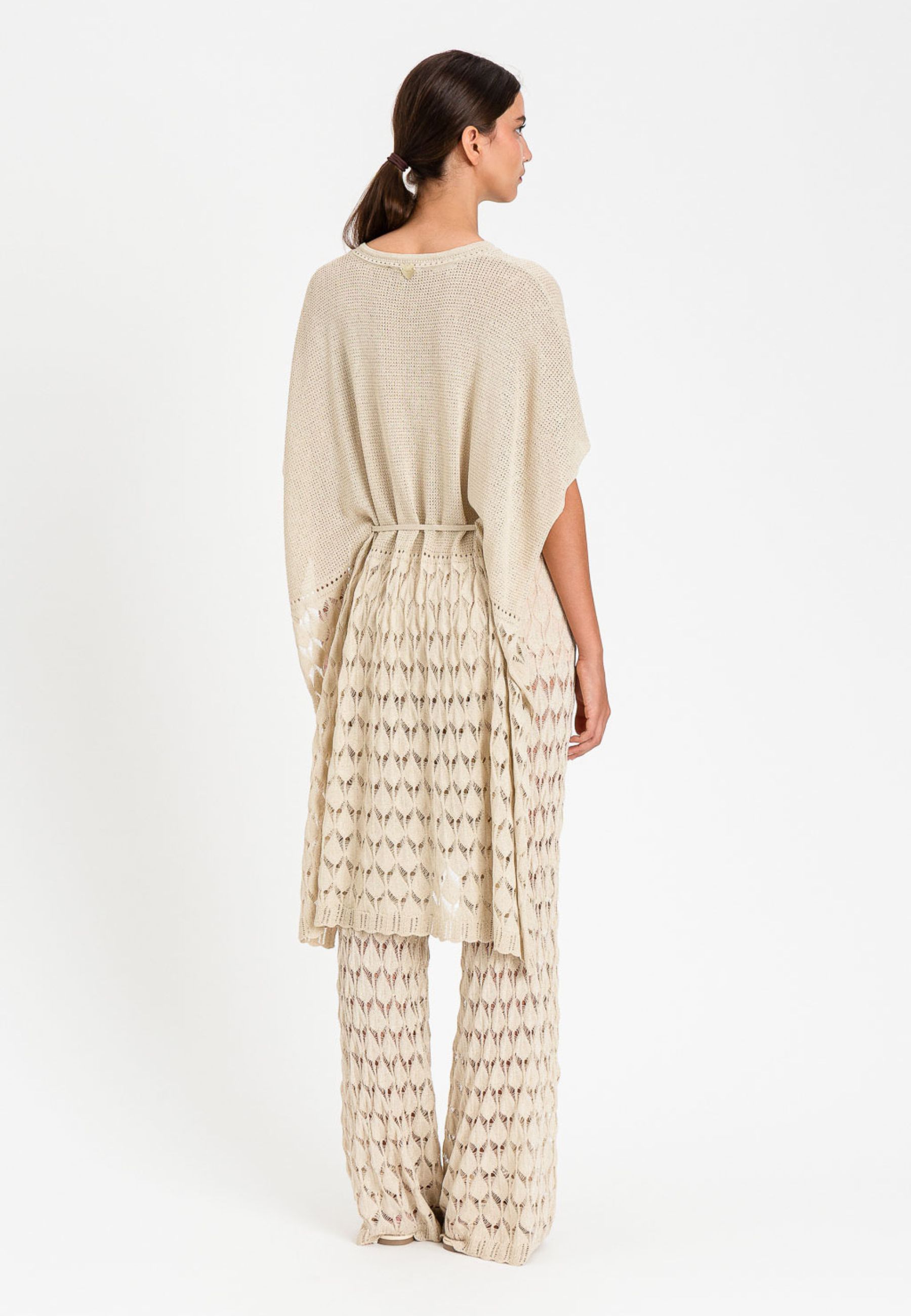 Cappa in maglia leggera dal design morbido e contemporaneo, caratterizzata da scollo a V rifinito e linea ampia con maniche fluide. La lavorazione traforata dona leggerezza e trasparenze sofisticate, valorizzando il capo con un effetto materico elegante e ricercato.