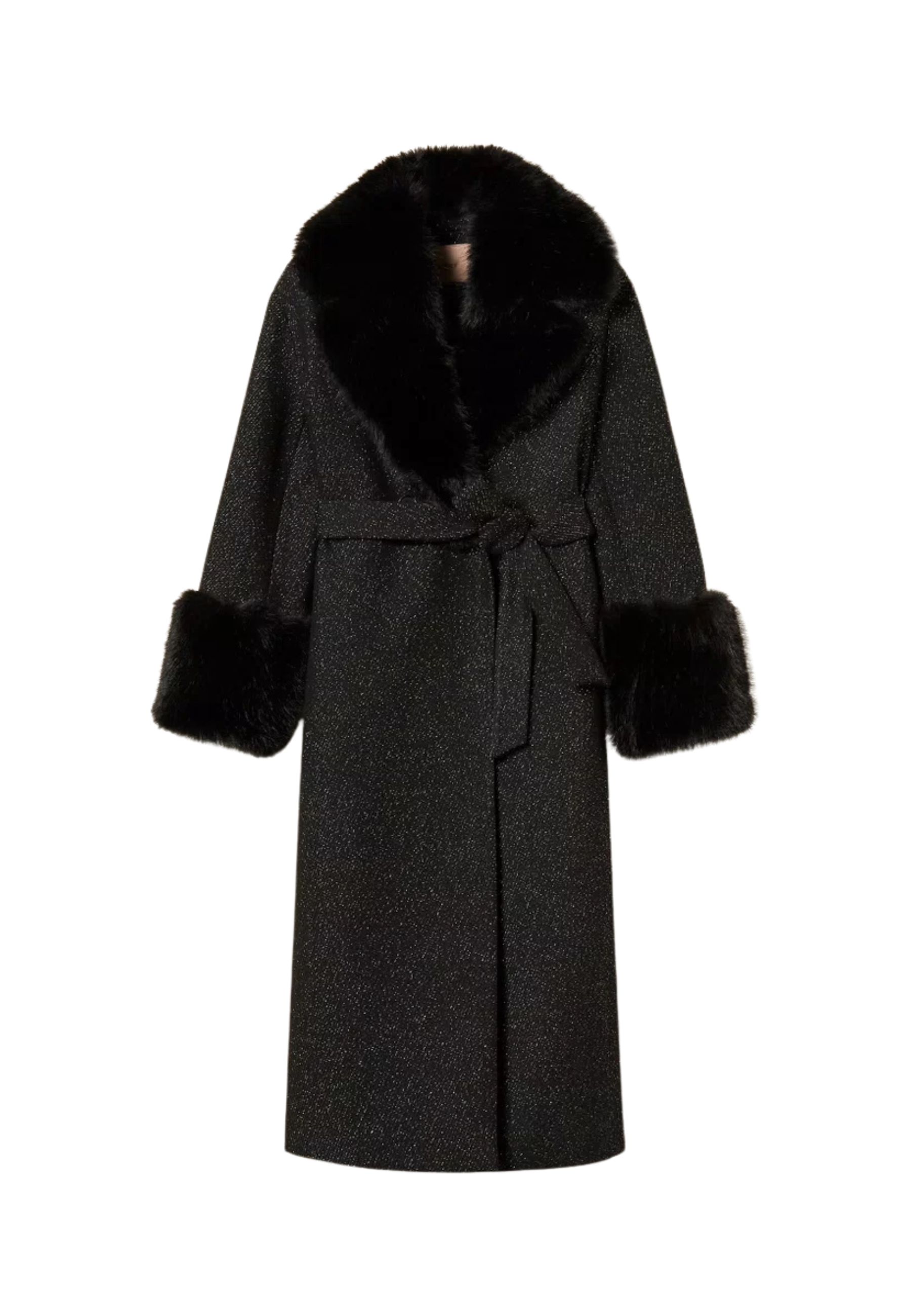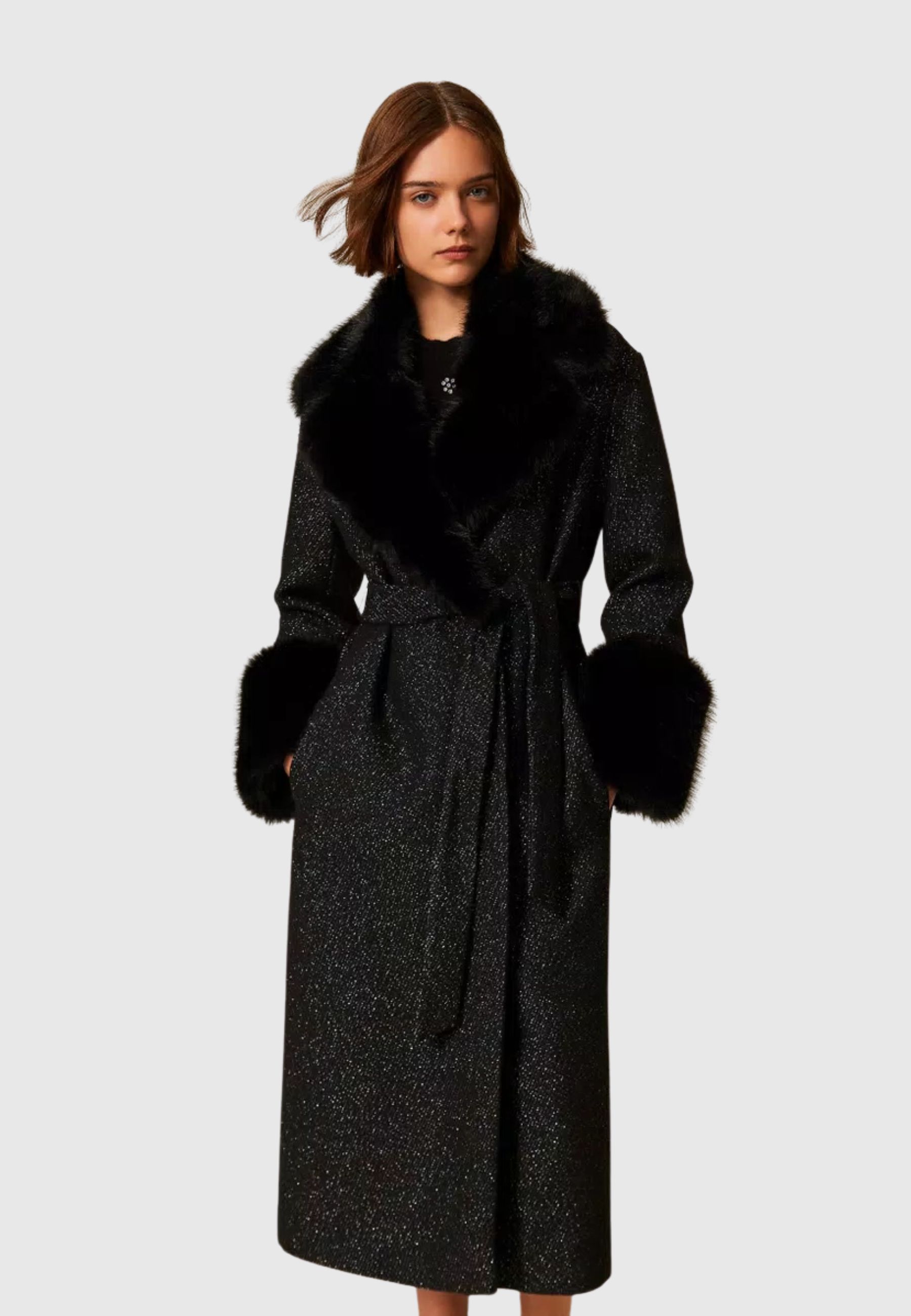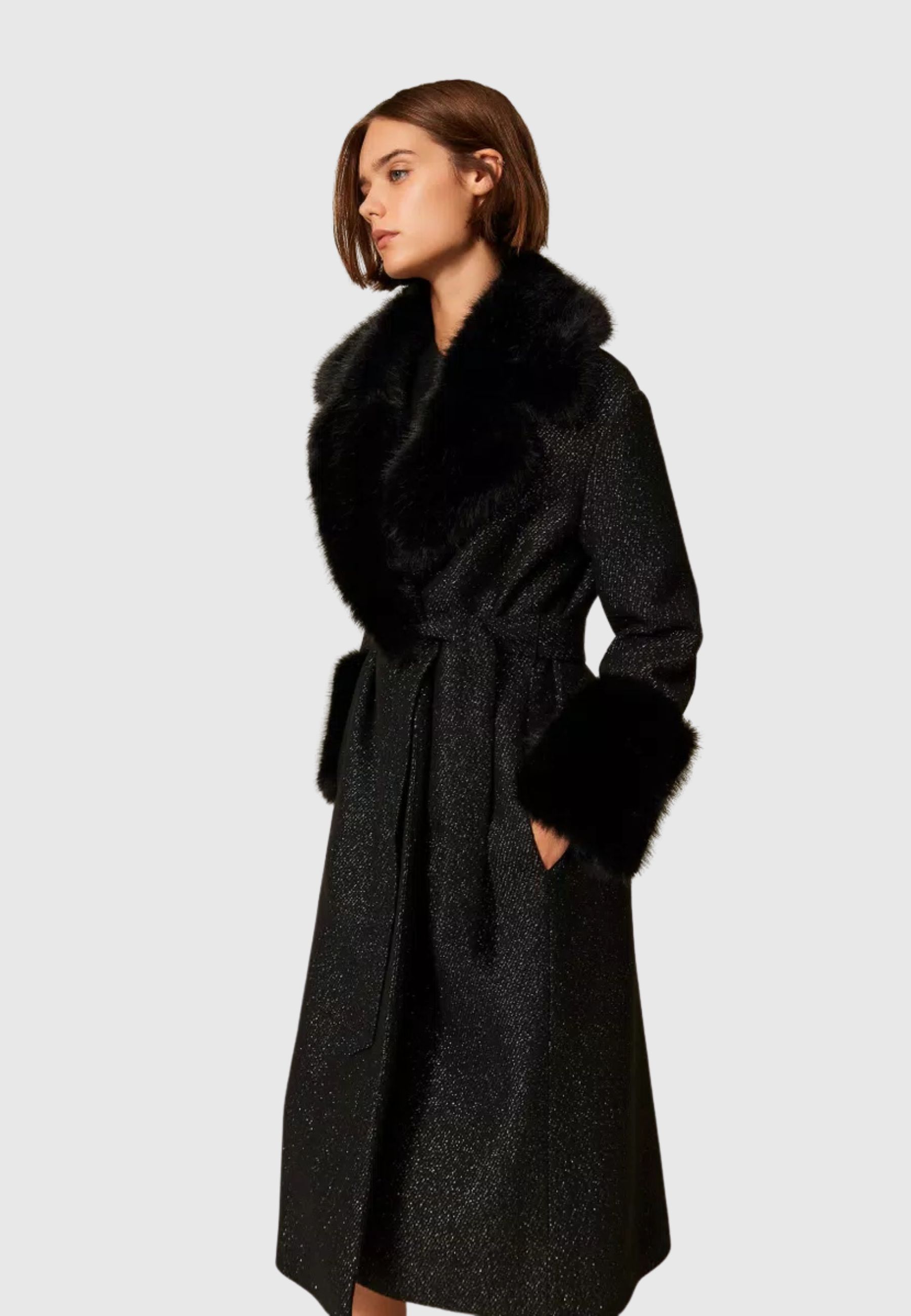 Elegante cappotto lungo a fantasia con filo lurex, impreziosito da collo e polsi rimovibili in pelliccia sintetica. Il modello presenta revers classici, chiusura doppiopetto con bottoni, maniche lunghe e tasche inserite nei fianchi. Lo spacco centrale sul retro e la cintura coordinata valorizzano la linea dritta, mentre la fodera trapuntata garantisce comfort e calore. Sul retro è applicata la placchetta logo Oval T.