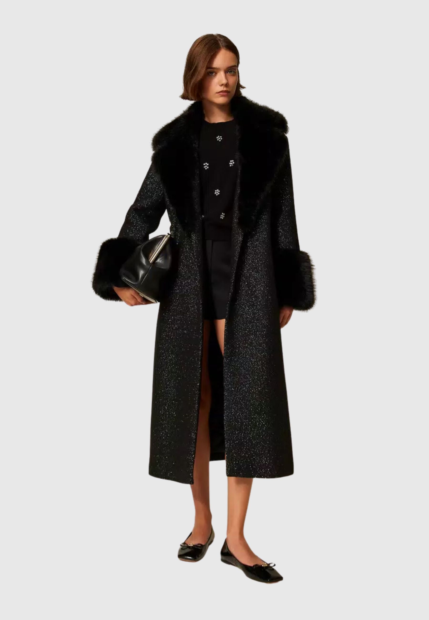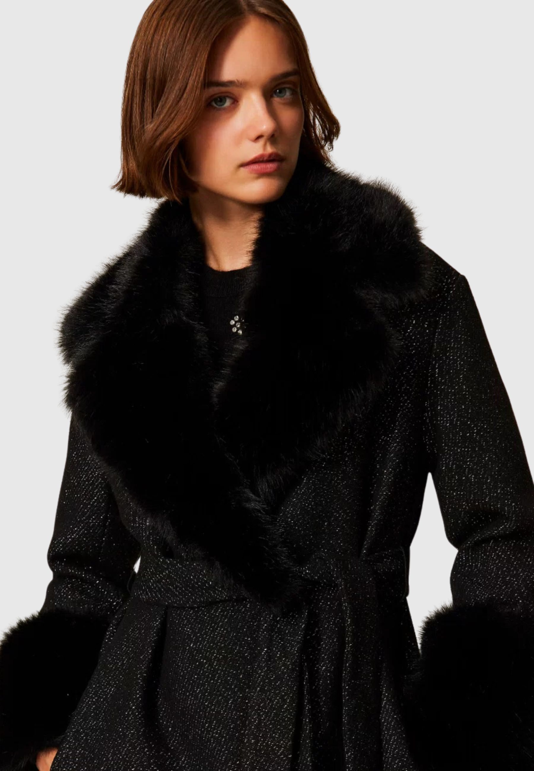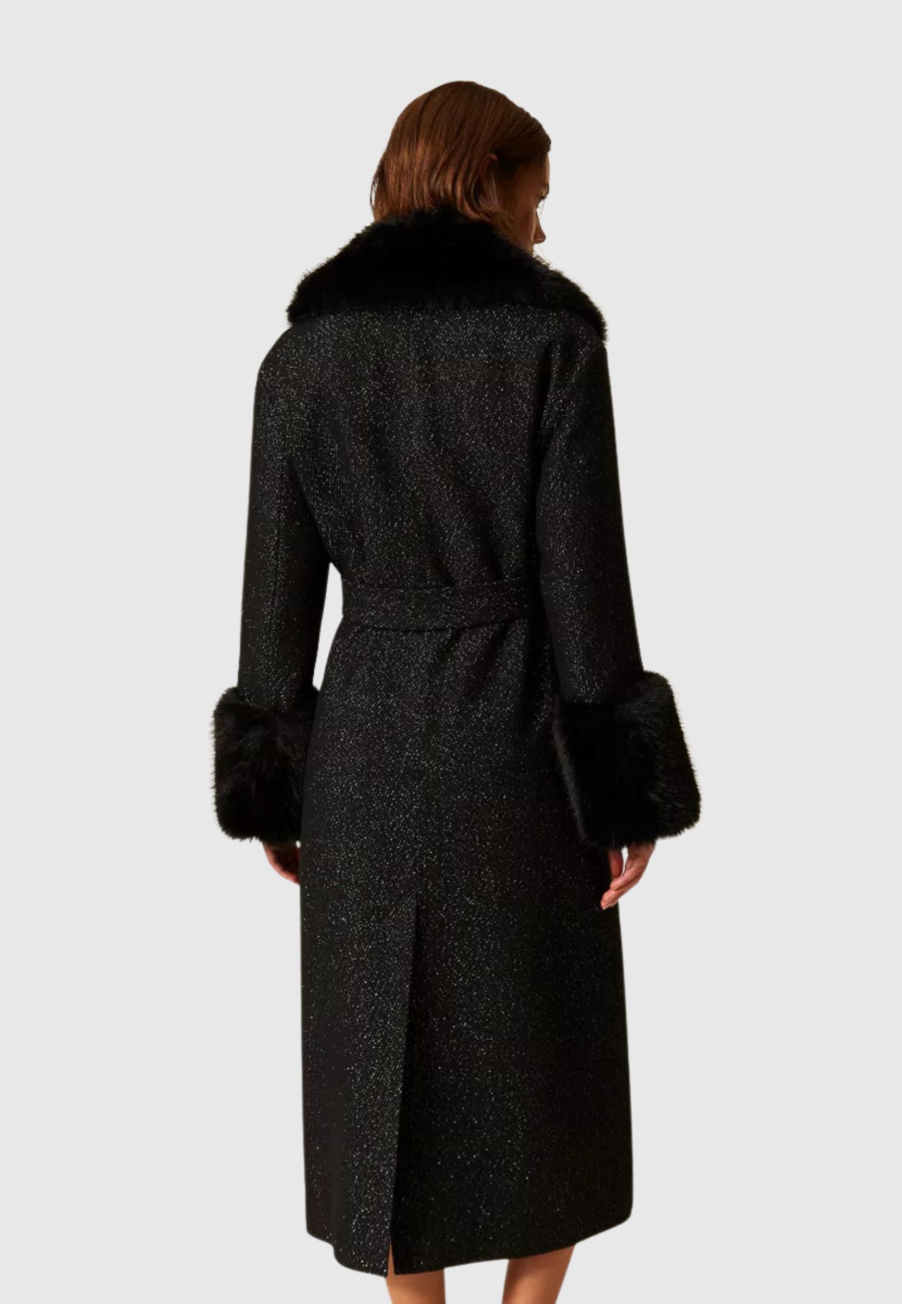 Elegante cappotto lungo a fantasia con filo lurex, impreziosito da collo e polsi rimovibili in pelliccia sintetica. Il modello presenta revers classici, chiusura doppiopetto con bottoni, maniche lunghe e tasche inserite nei fianchi. Lo spacco centrale sul retro e la cintura coordinata valorizzano la linea dritta, mentre la fodera trapuntata garantisce comfort e calore. Sul retro è applicata la placchetta logo Oval T.