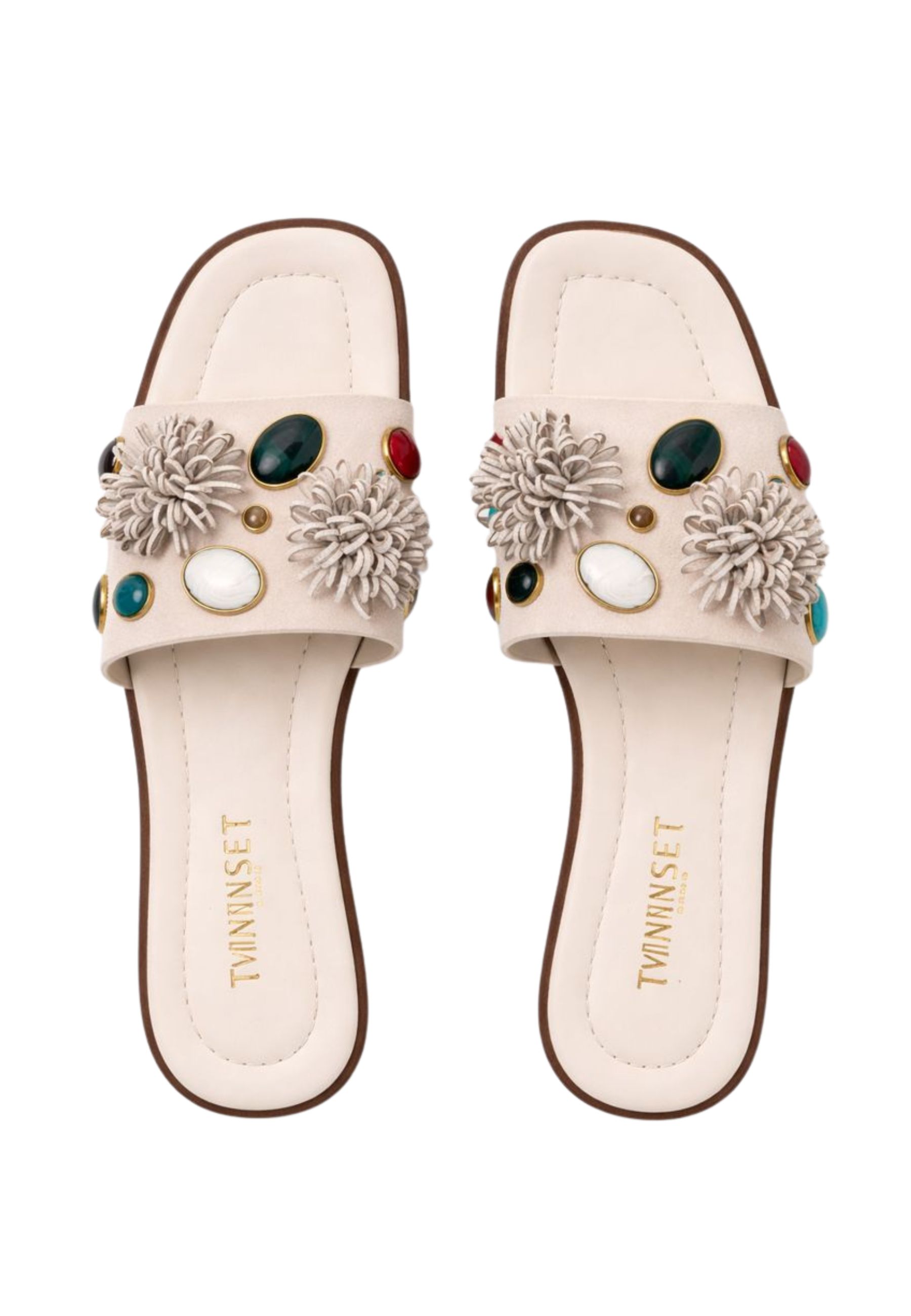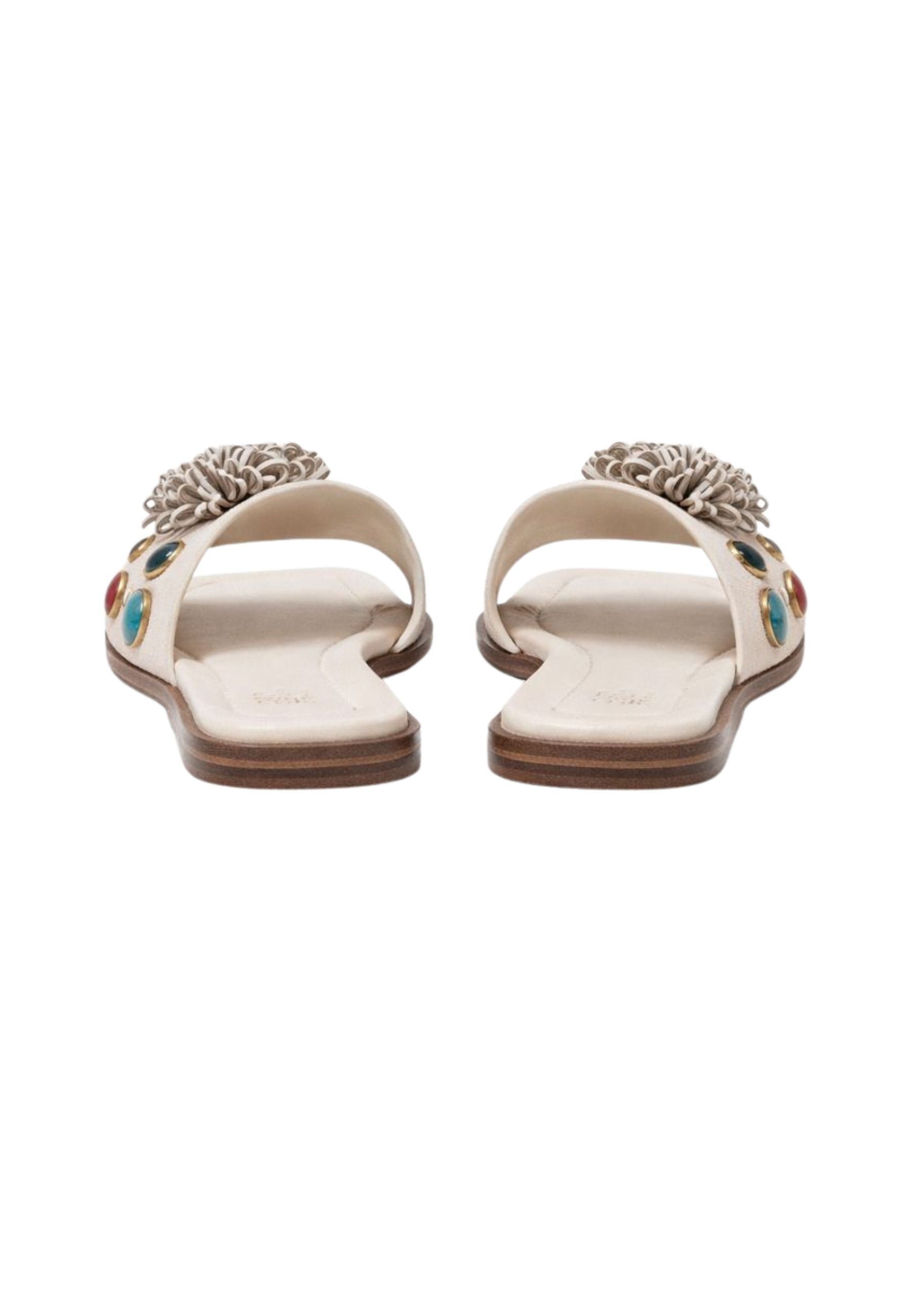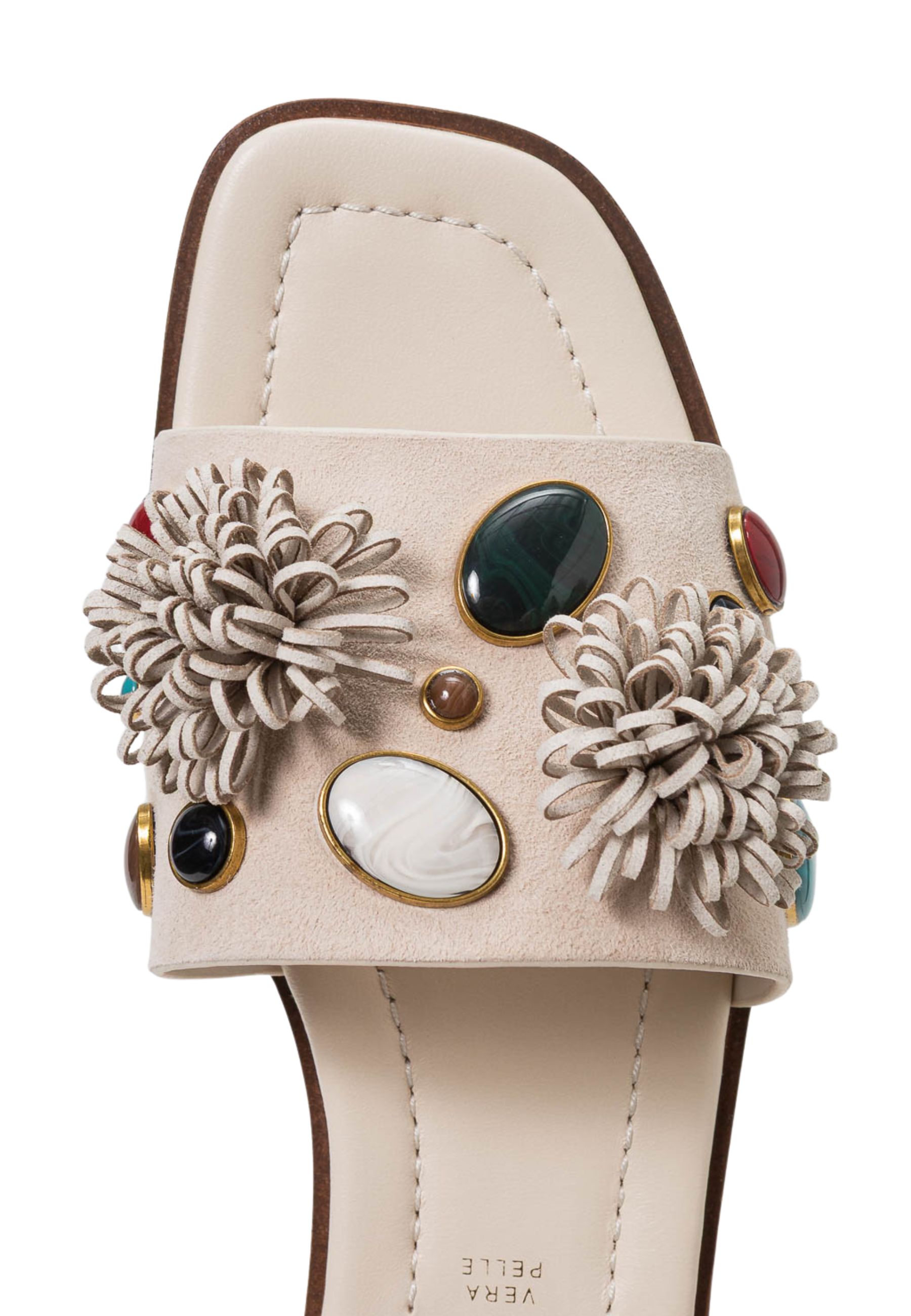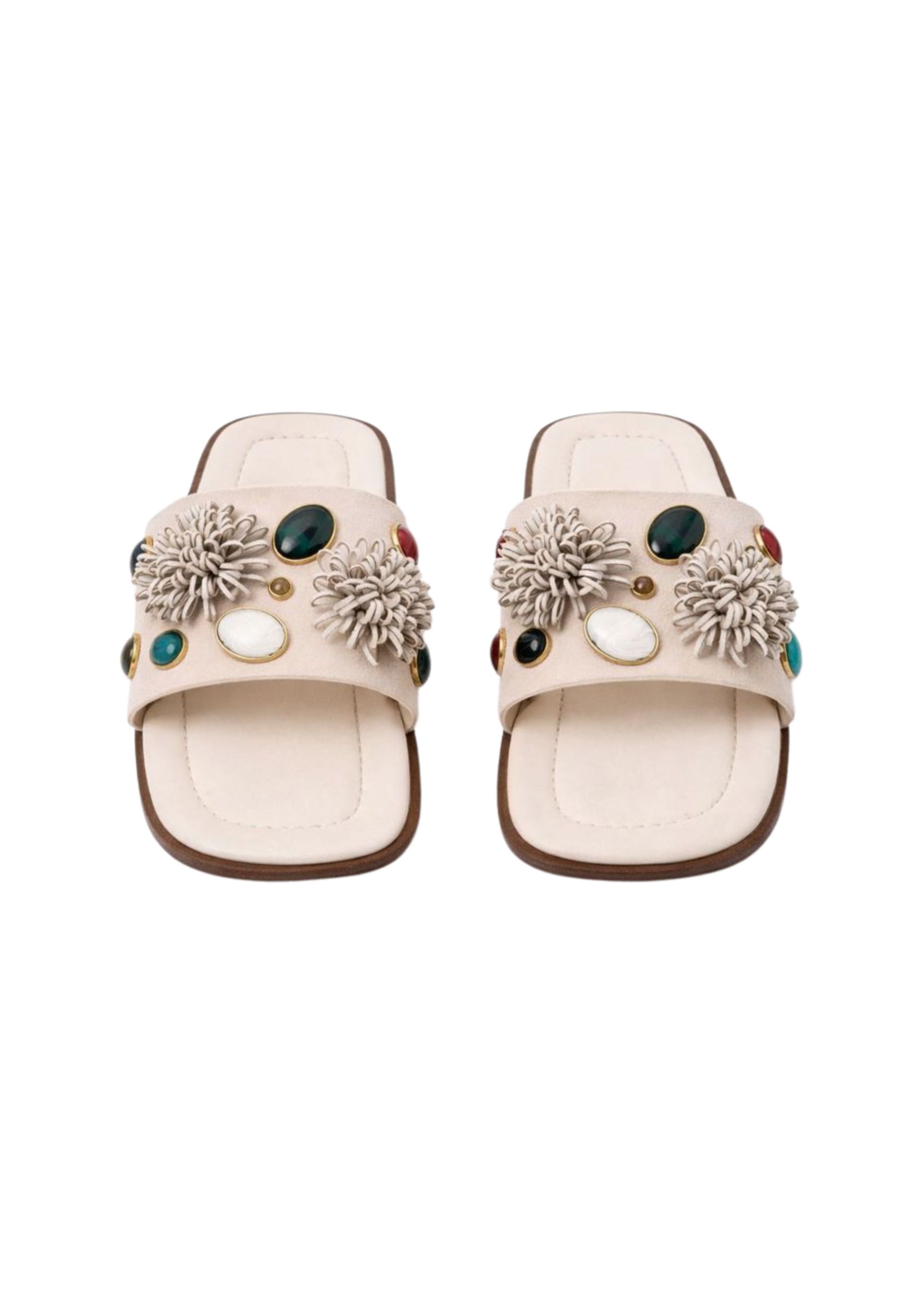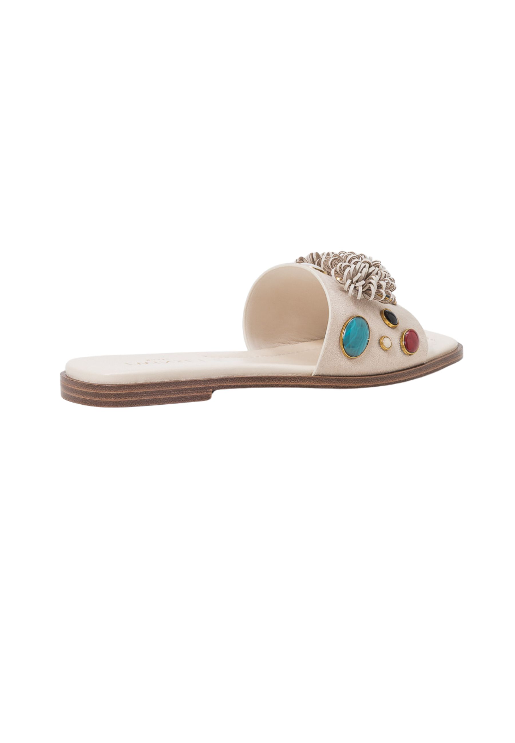 Ciabattina flat dal design elegante e femminile, ideale per completare look estivi e da vacanza con uno stile raffinato. La fascia ampia è impreziosita da applicazioni decorative effetto gioiello, con pietre multicolore incastonate e dettagli floreali tridimensionali che conferiscono luminosità e carattere al modello.