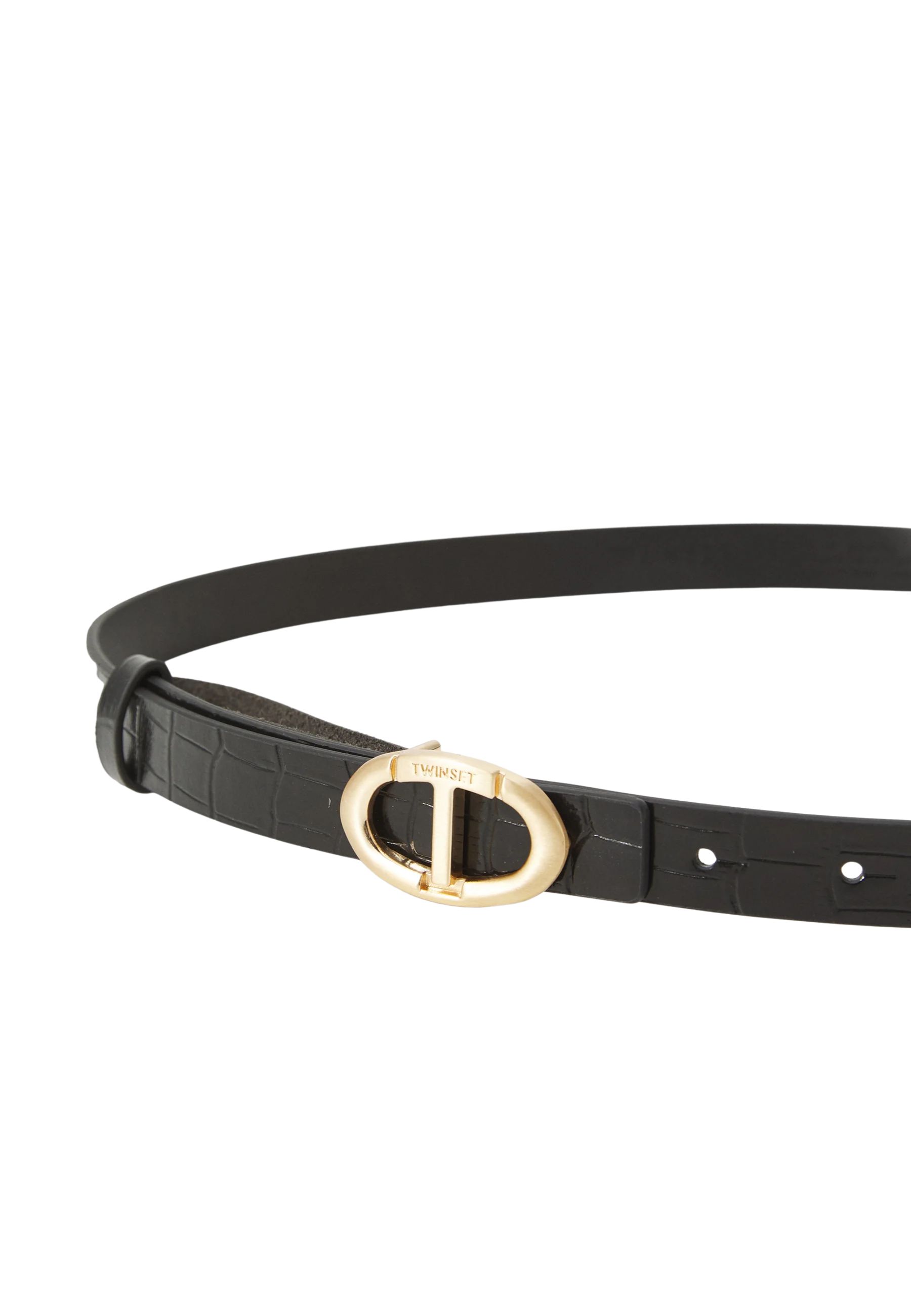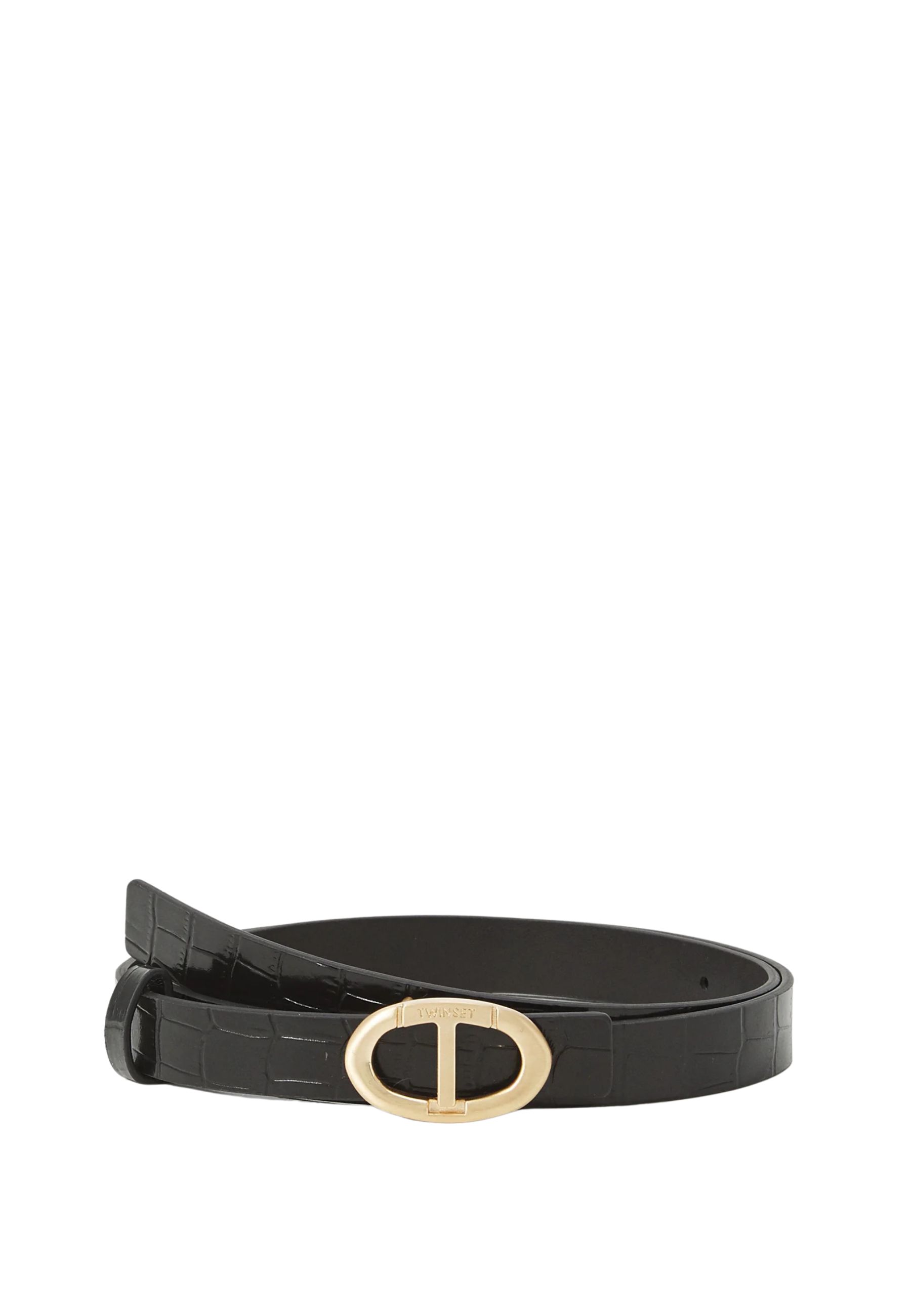 Cintura in materiale effetto pelle con stampa cocco e fibbia ovale in metallo dorato con logo Oval T inciso. Un accessorio elegante e versatile, ideale per completare look sia casual che raffinati.