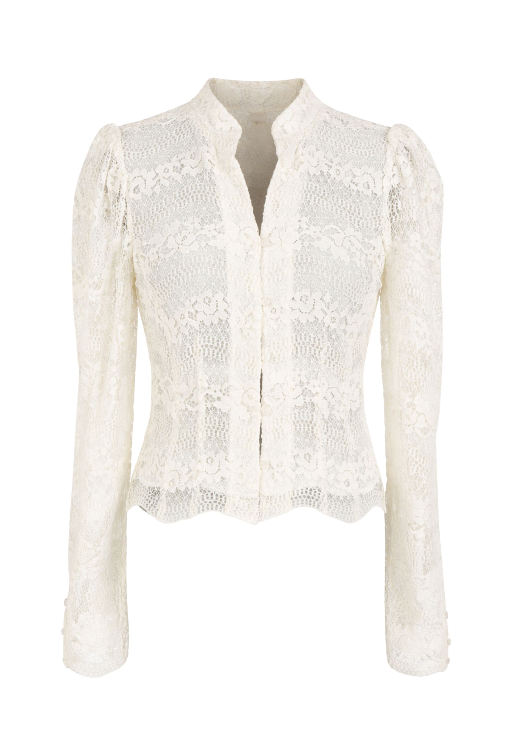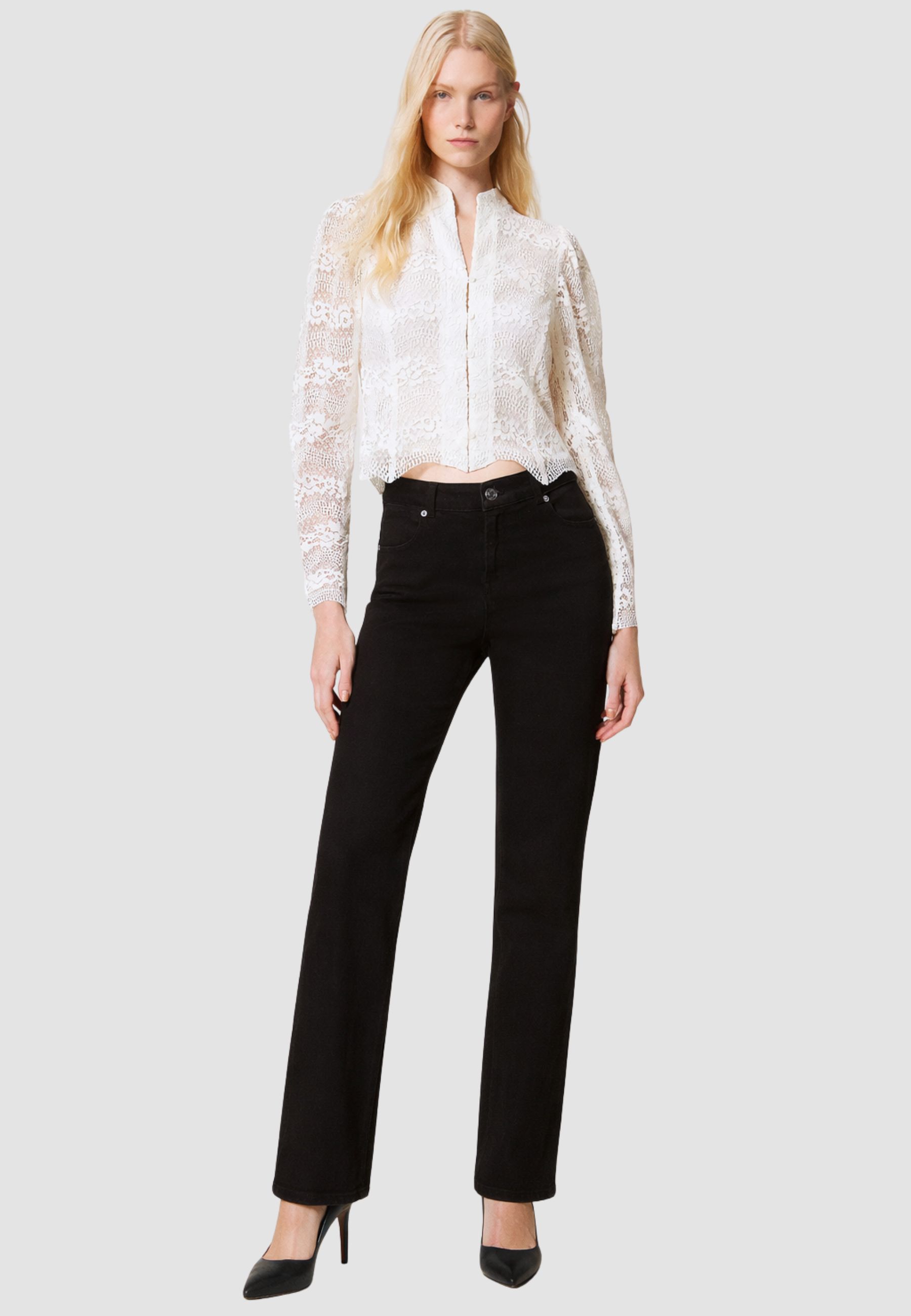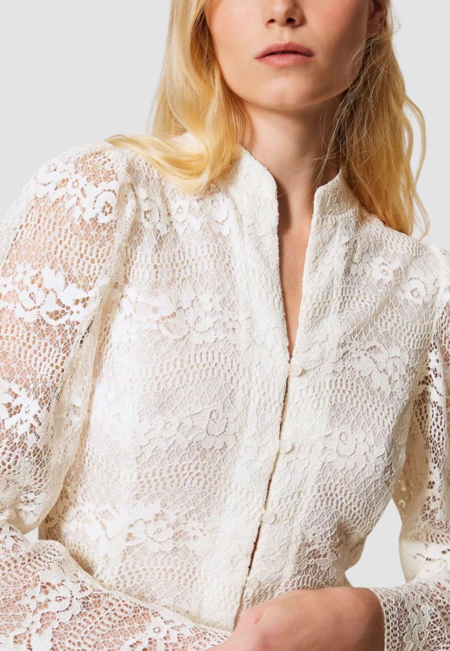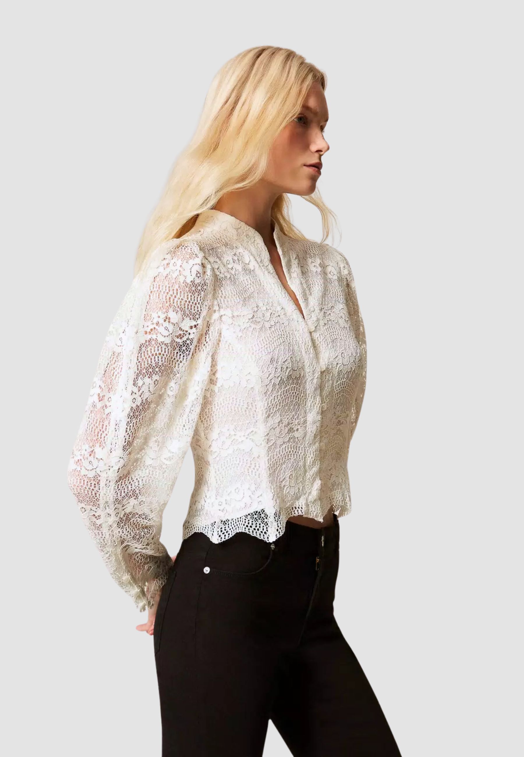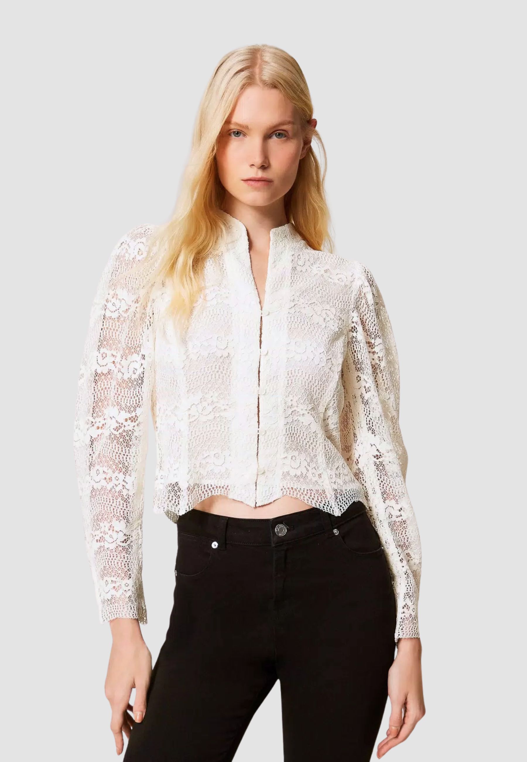 Giacca elegante e raffinata della collezione Twinset, realizzata in pizzo macramè con delicato motivo a onde che valorizza la silhouette. Il design è impreziosito da collo sagomato e chiusura frontale con bottoni, mentre le maniche lunghe in trasparenza con leggera arricciatura ai giri donano femminilità e leggerezza al capo.