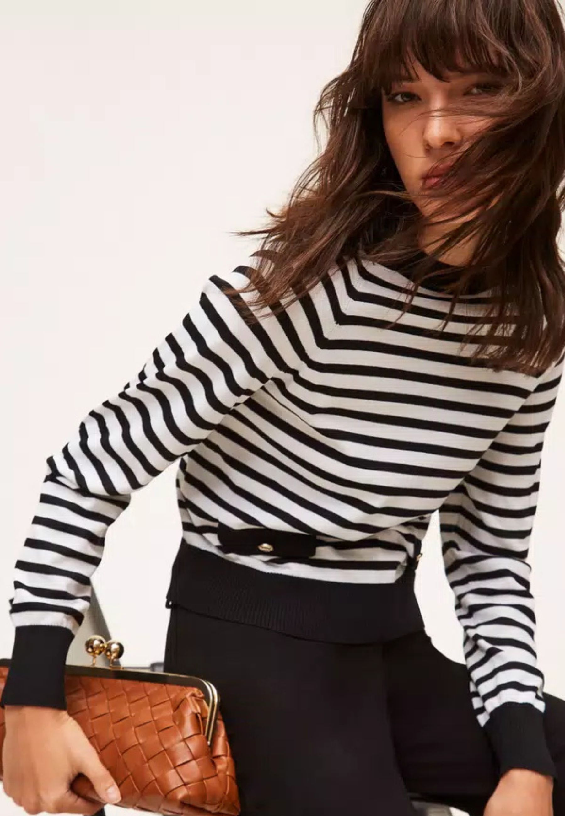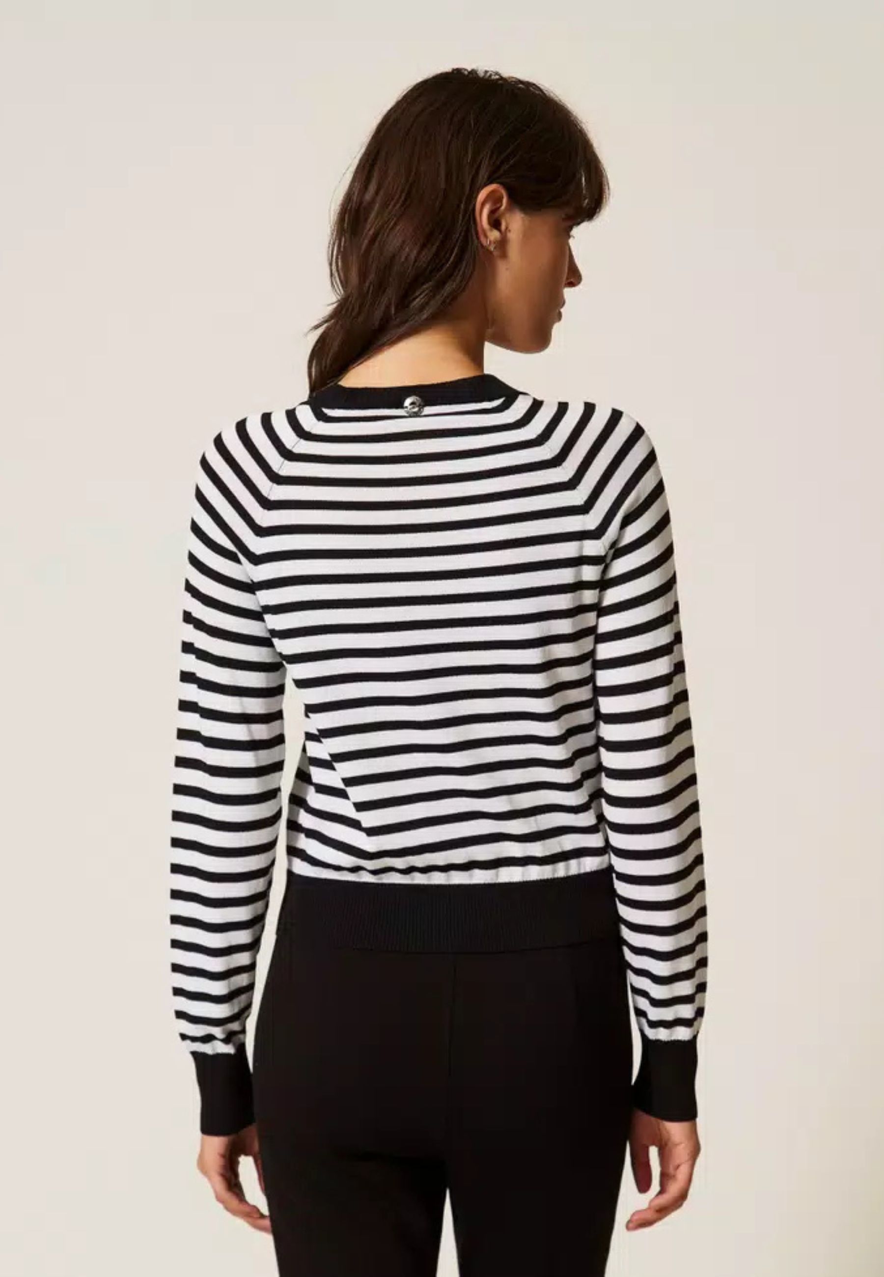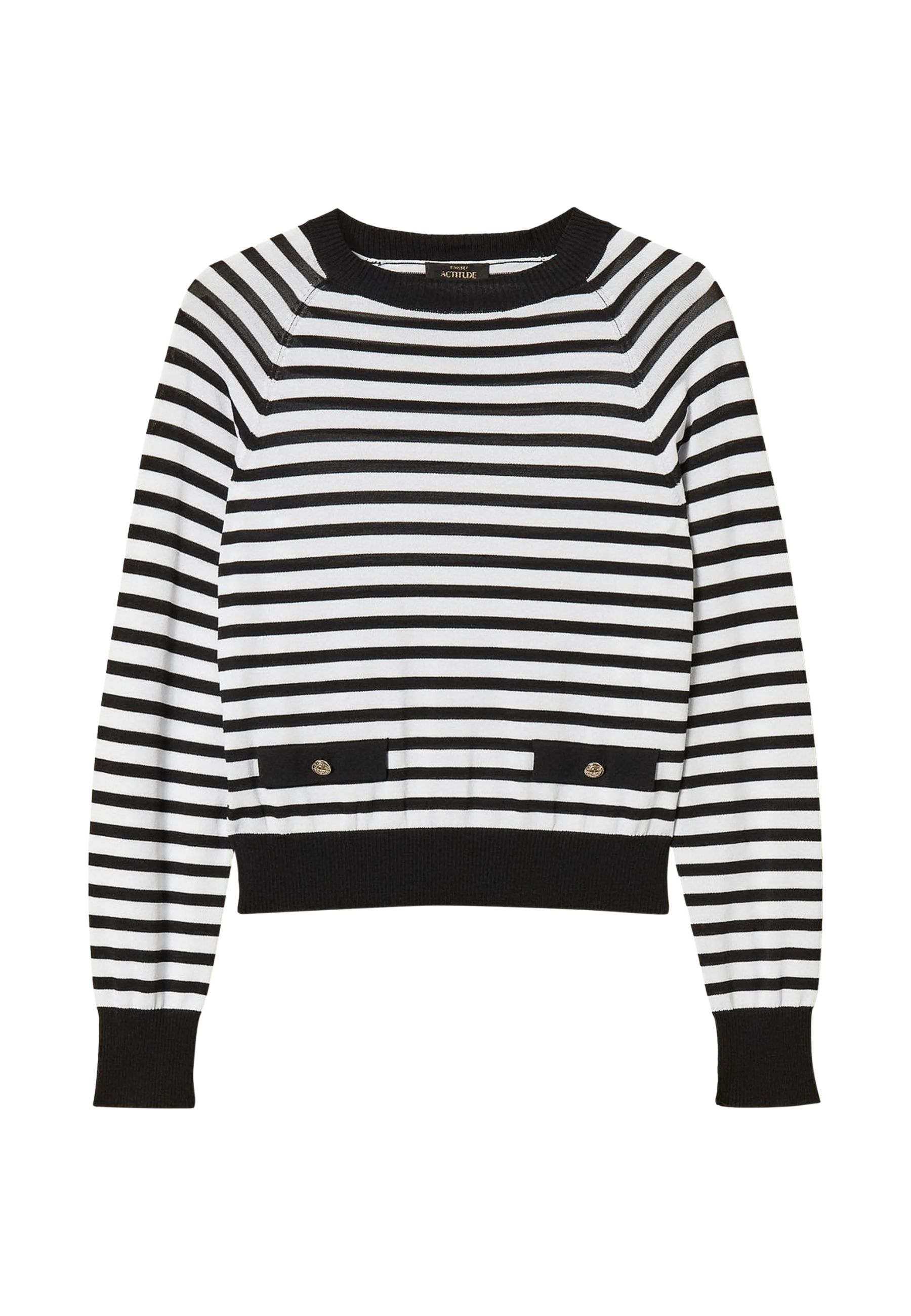 Maglia della collezione Actitude realizzata in misto viscosa a righe, caratterizzata da un design essenziale e contemporaneo. I profili rifiniti a tinta unita definiscono il capo con un contrasto elegante, valorizzando la lavorazione bicolor.