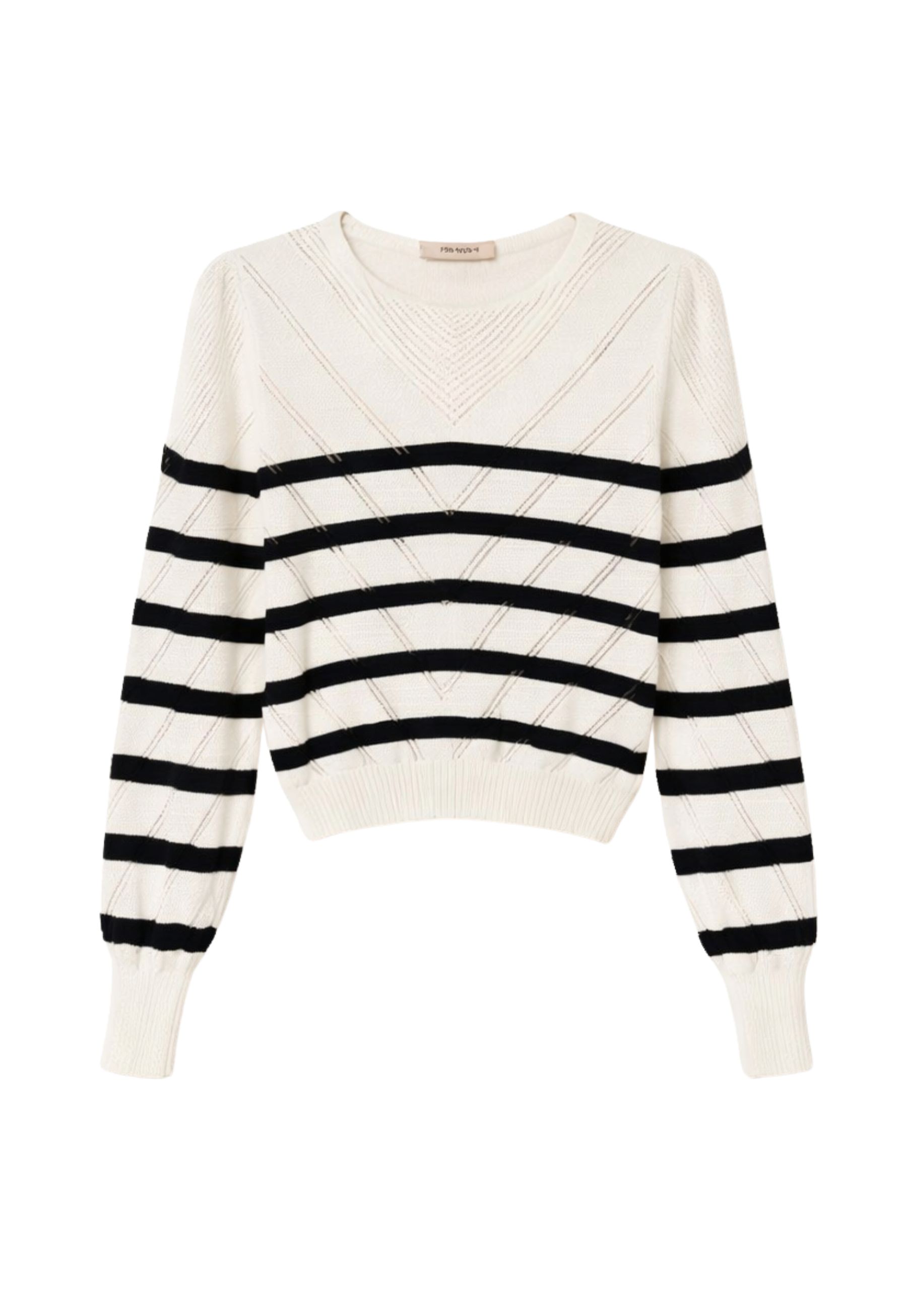 Maglia Twinset realizzata in pregiato filato di cotone biologico certificato (90%) e cashmere (10%), lavorata in Made in Italy. Il capo presenta una lavorazione punzonata parallela su base rasata a righe bicolore, che dona leggerezza visiva e un raffinato effetto texture.
