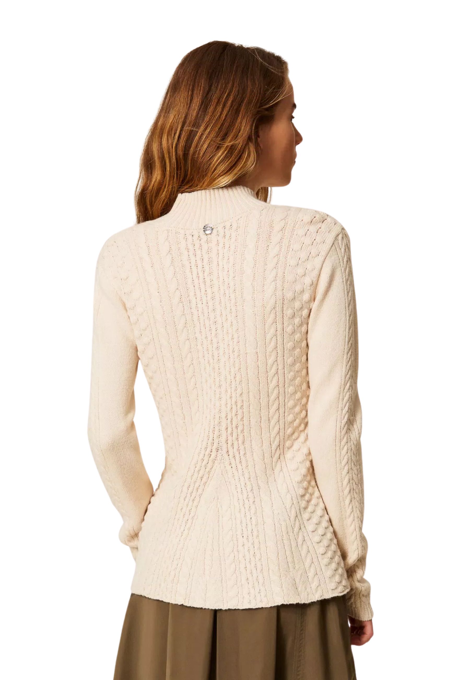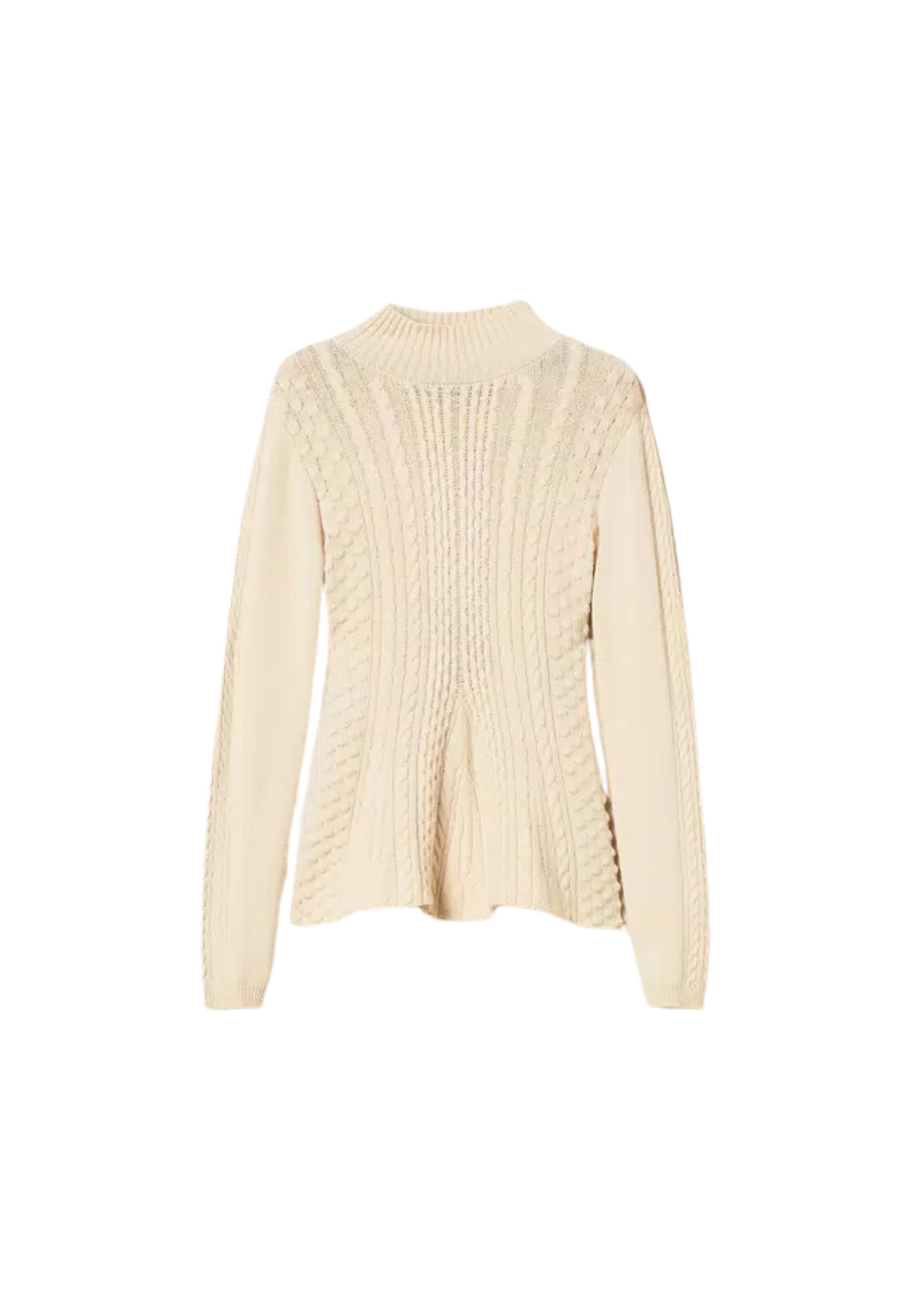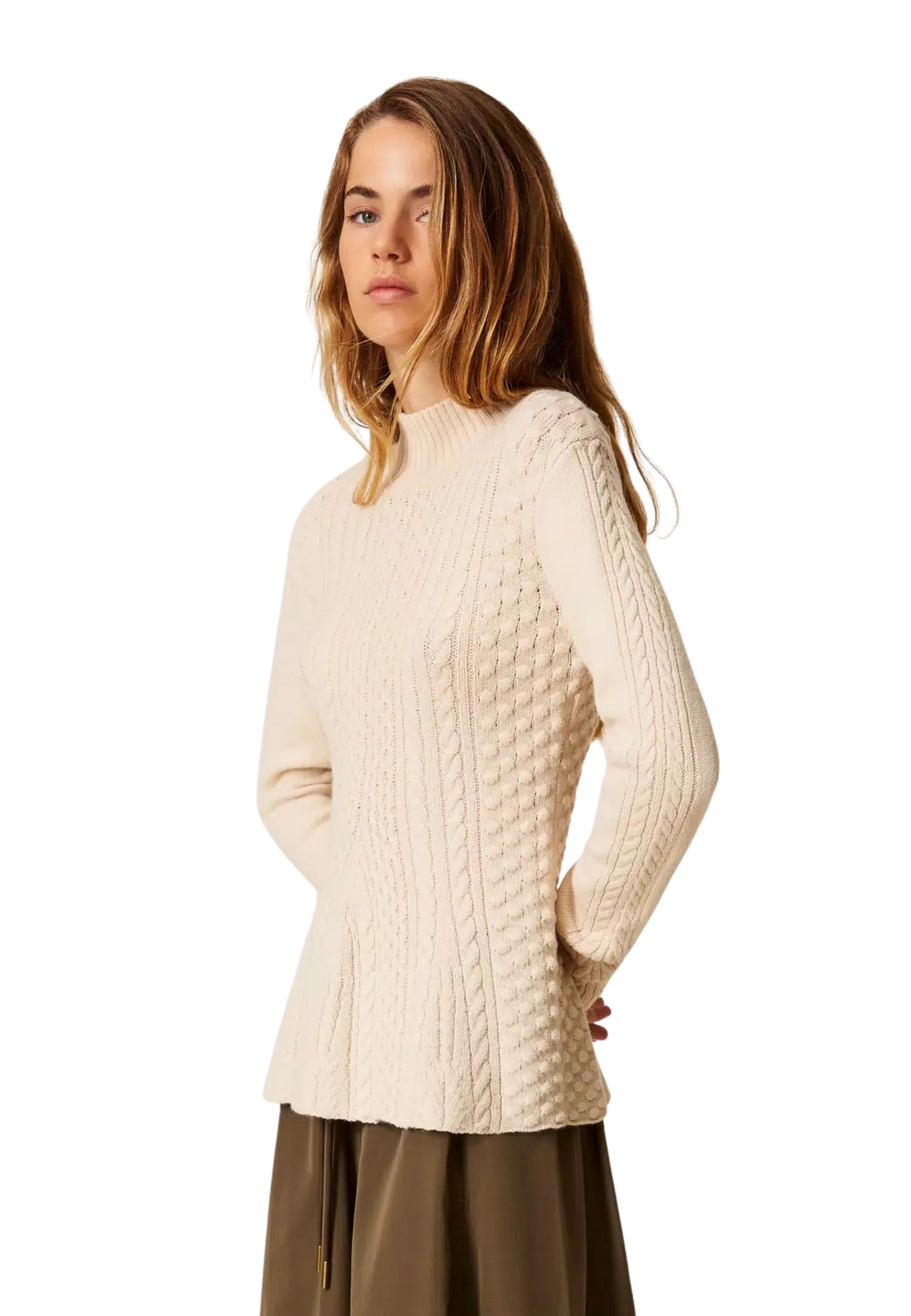 Maglia collezione Actitude in misto alpaca con tessitura a trecce e losanghe. Ha collo alto, maniche lunghe, placchetta logo in metallo, linea fitted e svasata al fondo