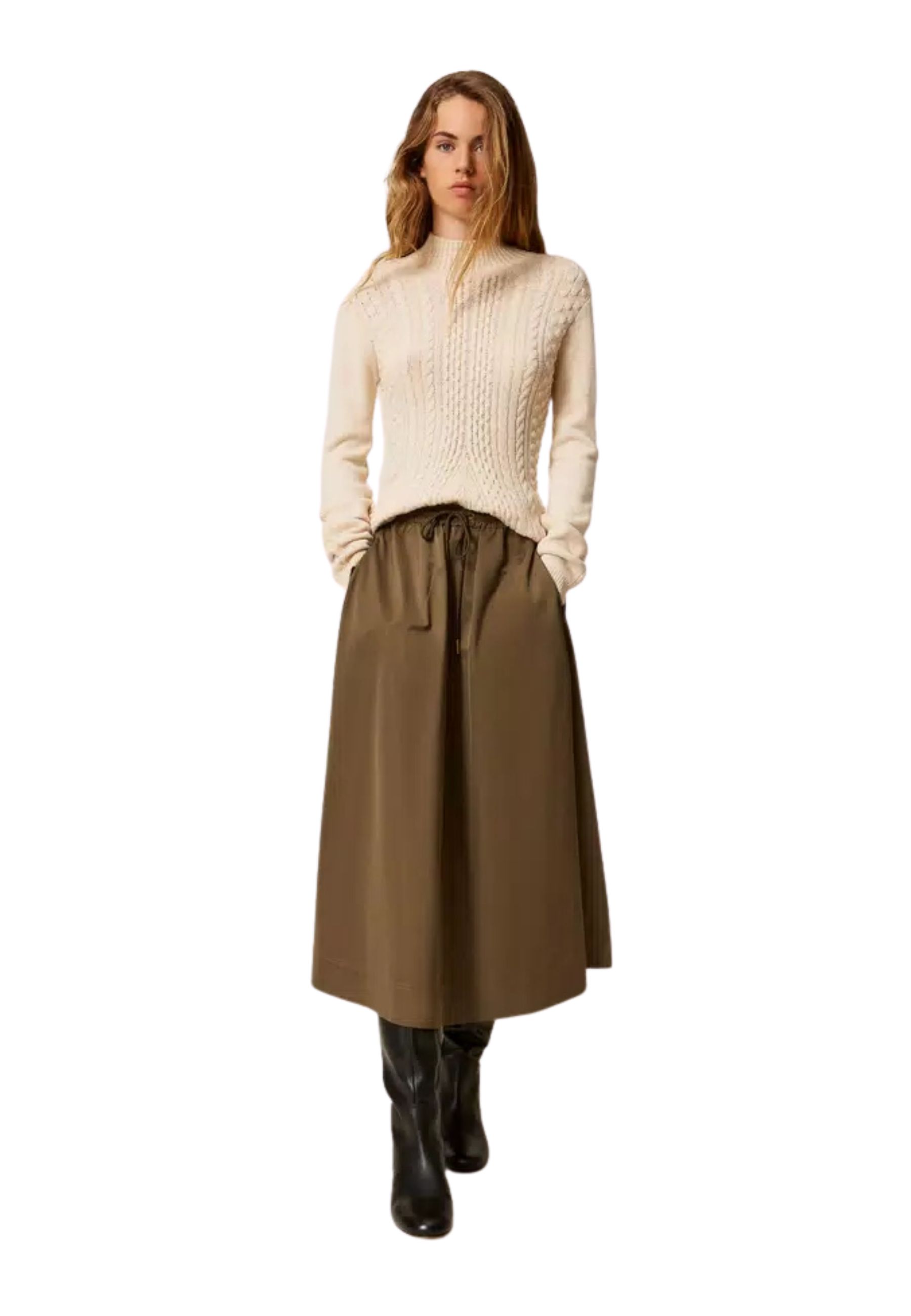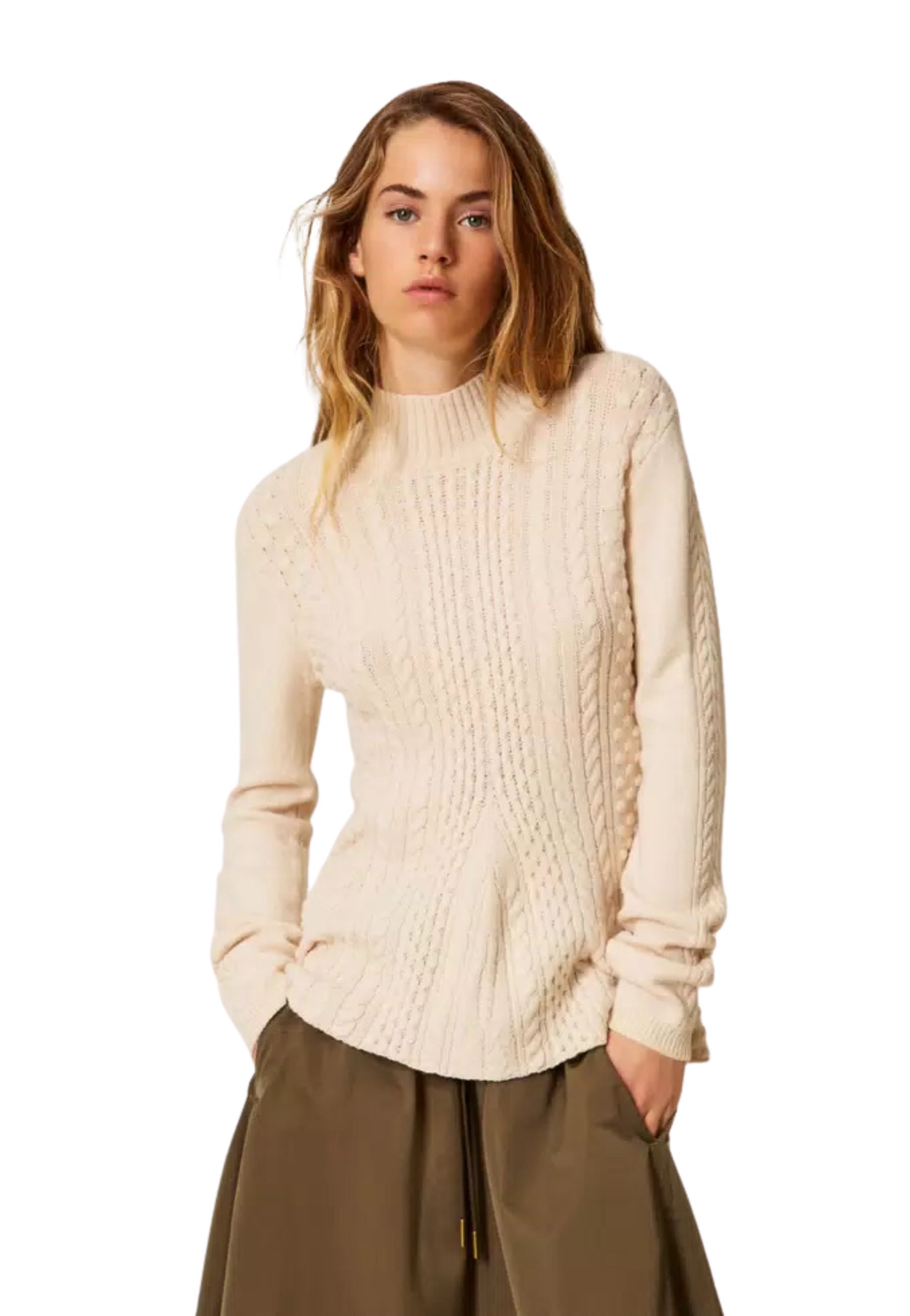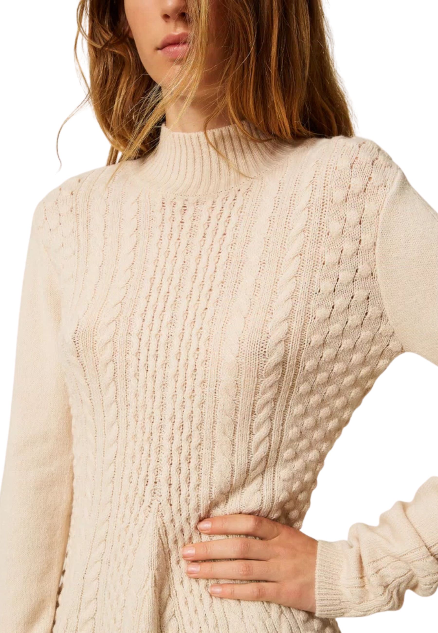 Maglia collezione Actitude in misto alpaca con tessitura a trecce e losanghe. Ha collo alto, maniche lunghe, placchetta logo in metallo, linea fitted e svasata al fondo