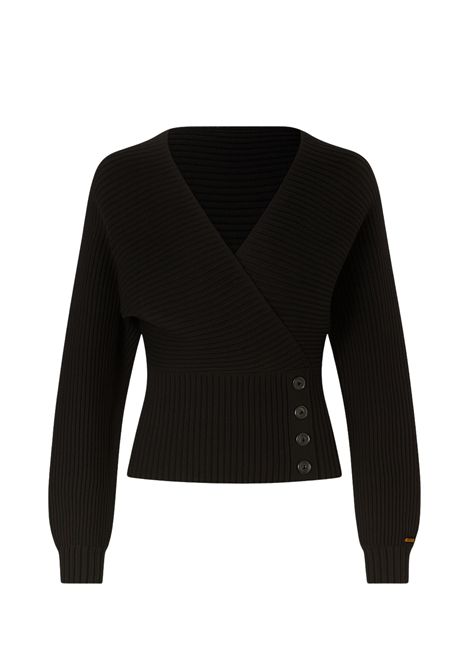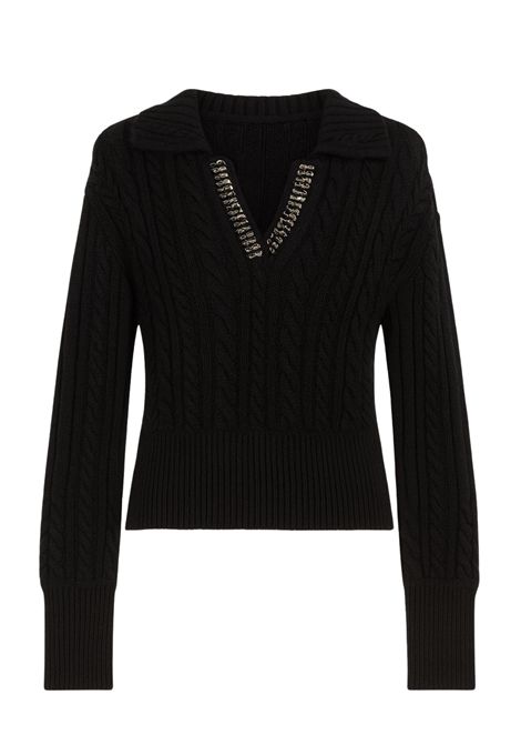 Maglia lupetto collezione Actitude in filato a coste larghe con balza inserita al collo rifinita da perline trasparenti, maniche lunghe con polsini alti, logo in metallo sul retro, linea regular.