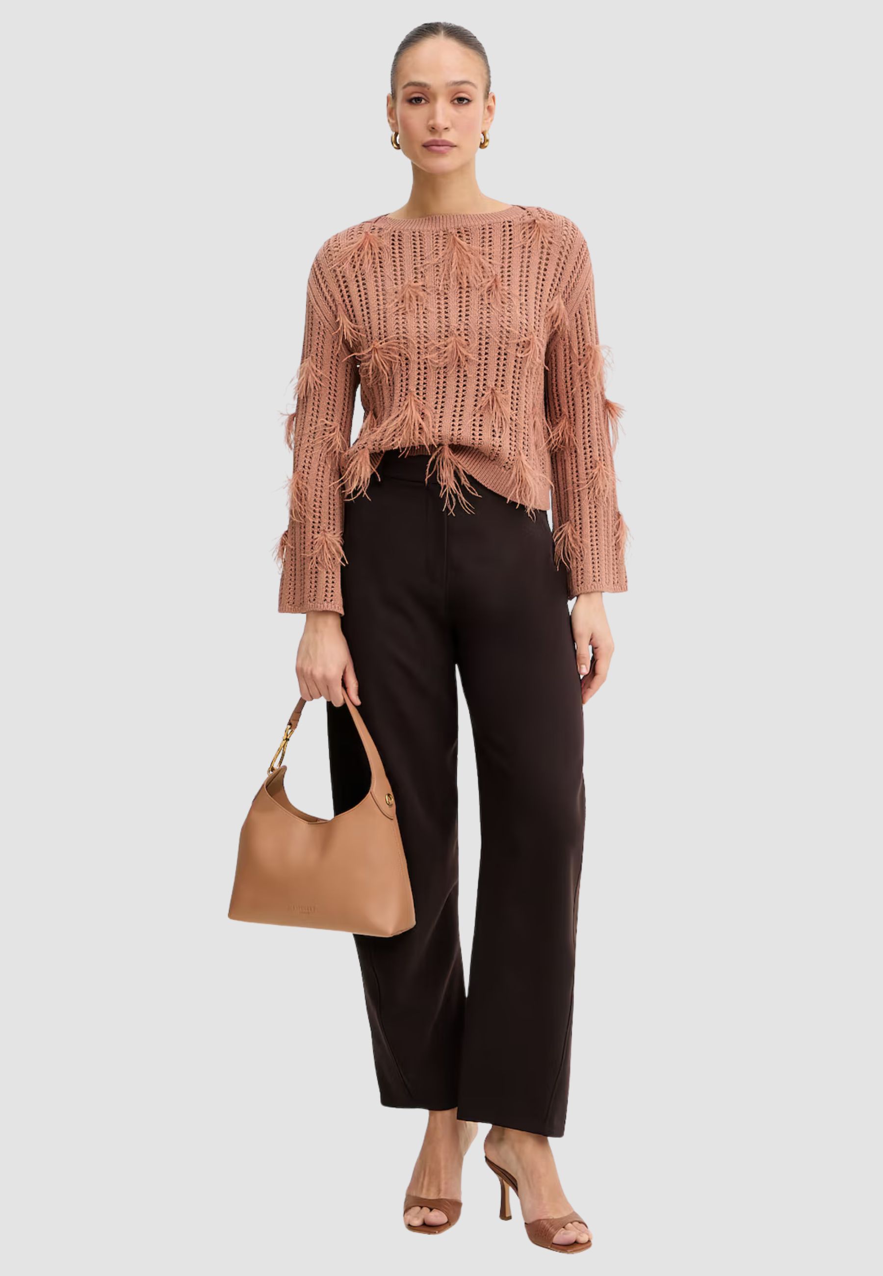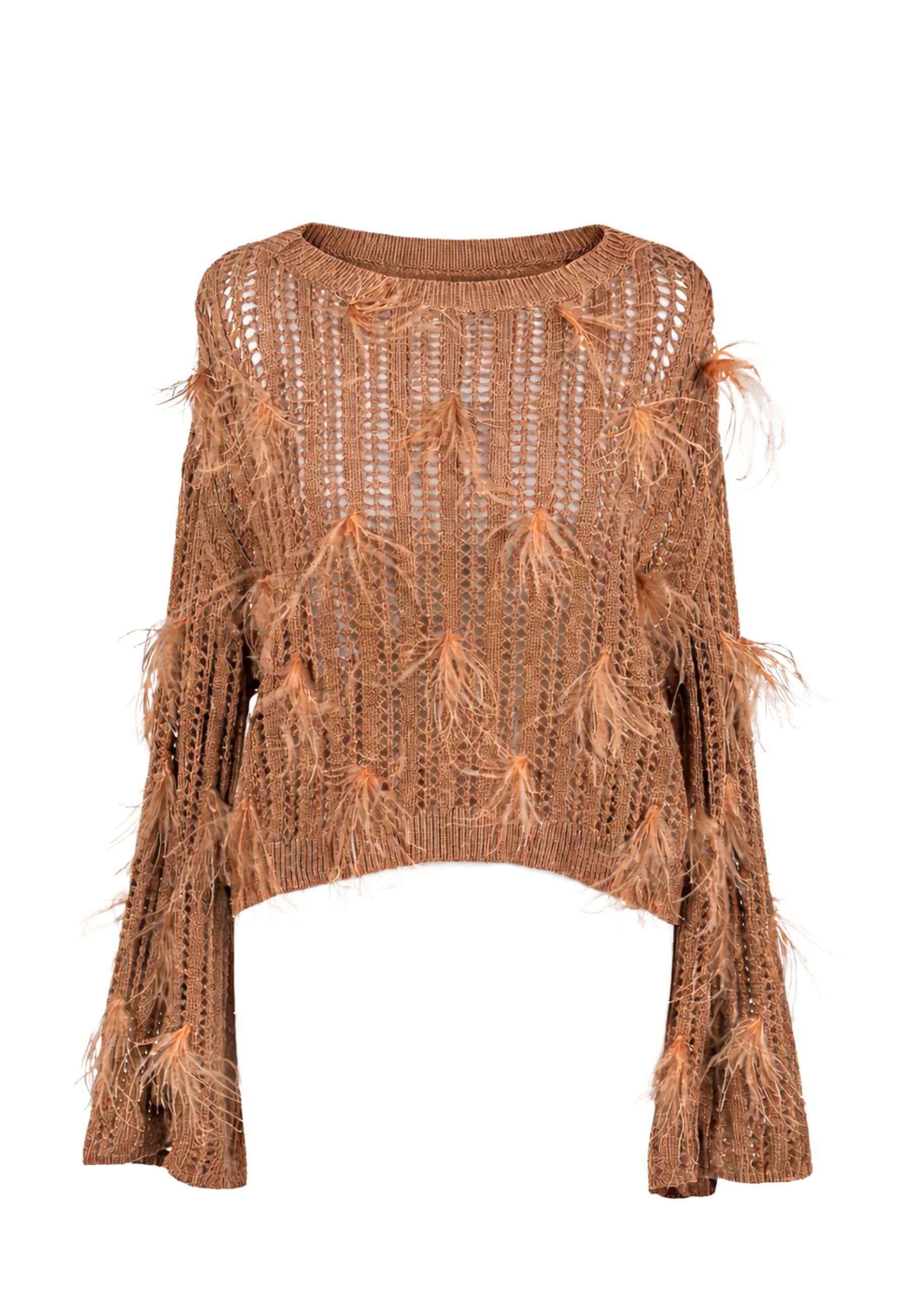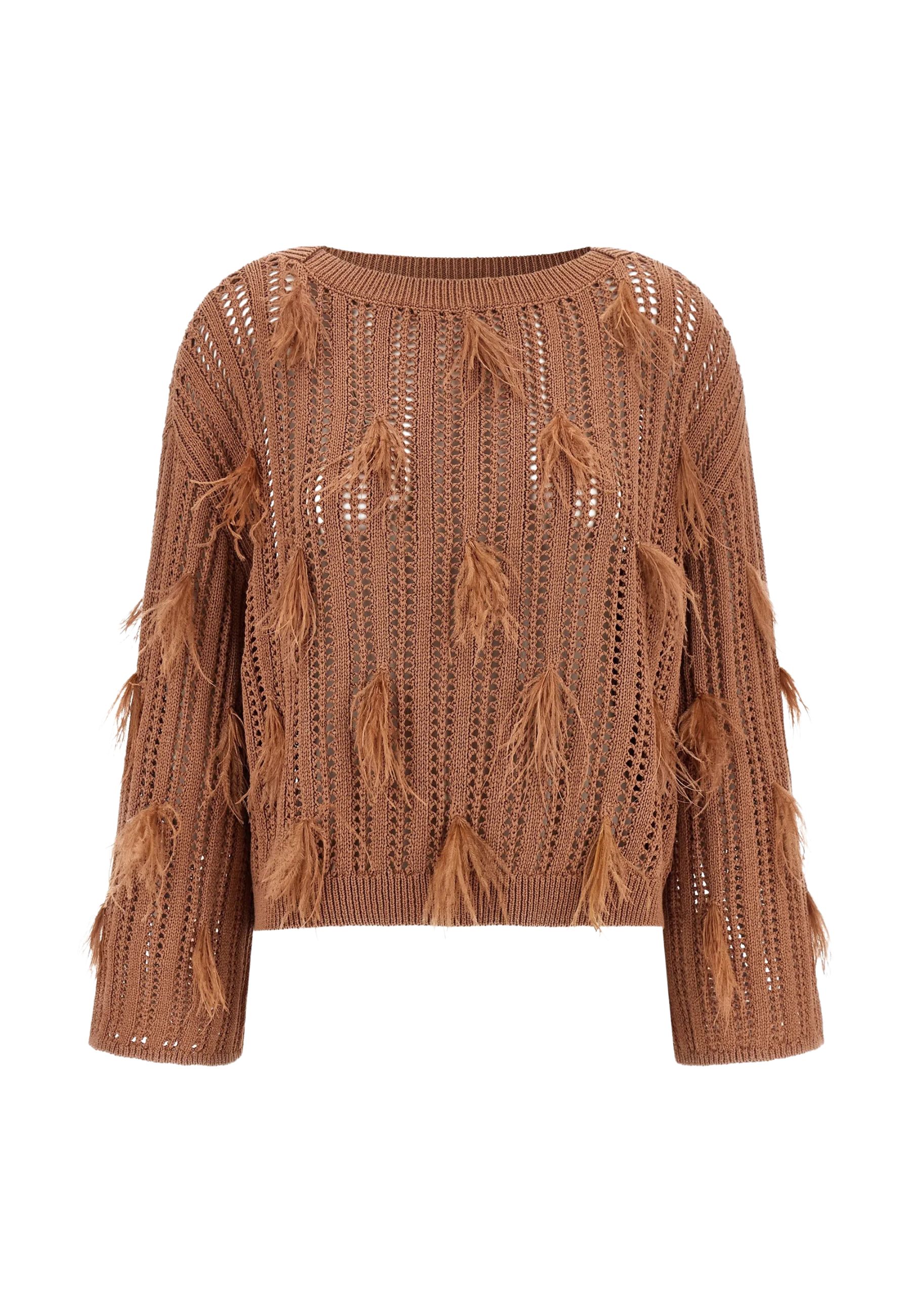 Maglione Twinset realizzato in maglia fine, caratterizzato da un design ricercato con applicazioni decorative in piume di struzzo che valorizzano il capo con un tocco distintivo e femminile. Il taglio ampio garantisce comfort e libertà di movimento, mentre la linea spalle abbassata e i polsini rifiniti contribuiscono a una vestibilità rilassata ma curata.