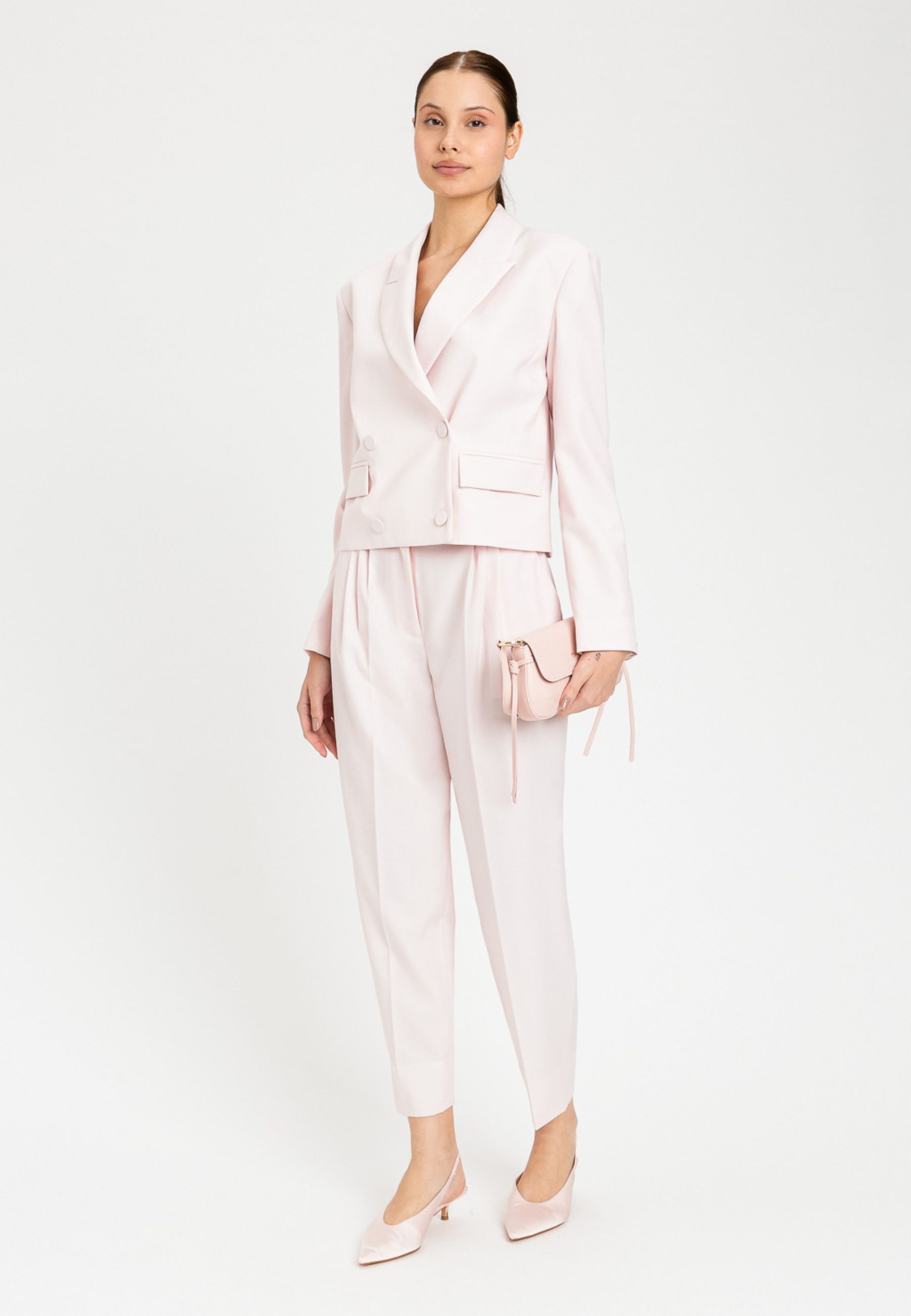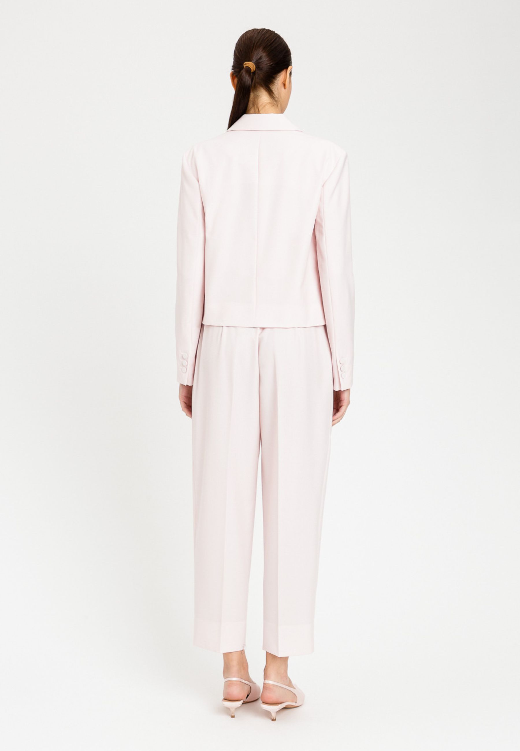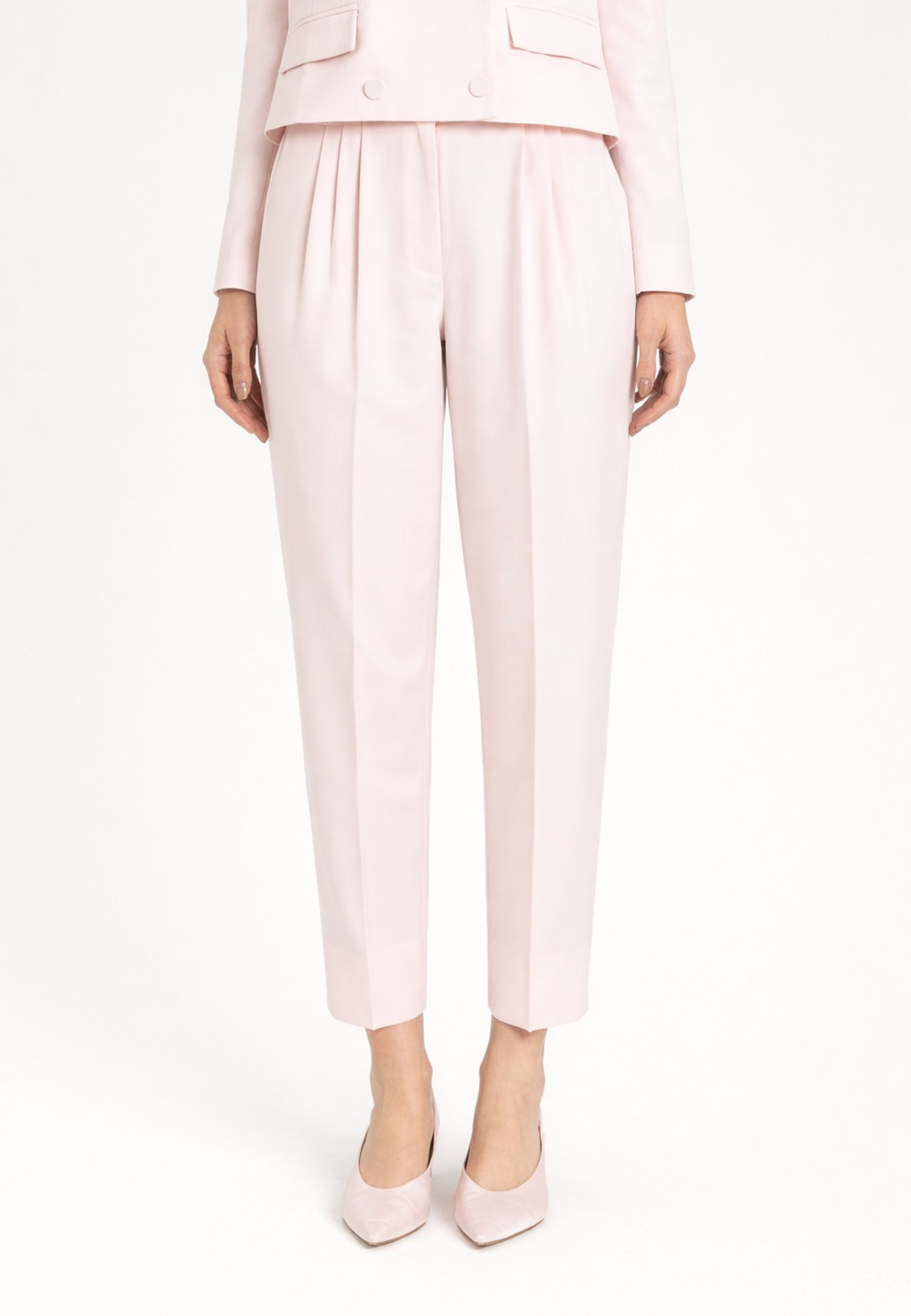 Pantaloni cropped realizzati in fresco di misto lana, caratterizzati da una linea morbida e da una costruzione raffinata con pieghe frontali che valorizzano la silhouette. La tonalità Sabbia Rosa, delicata e contemporanea, rende il capo elegante e facilmente abbinabile, ideale per look formali o outfit sofisticati da giorno.