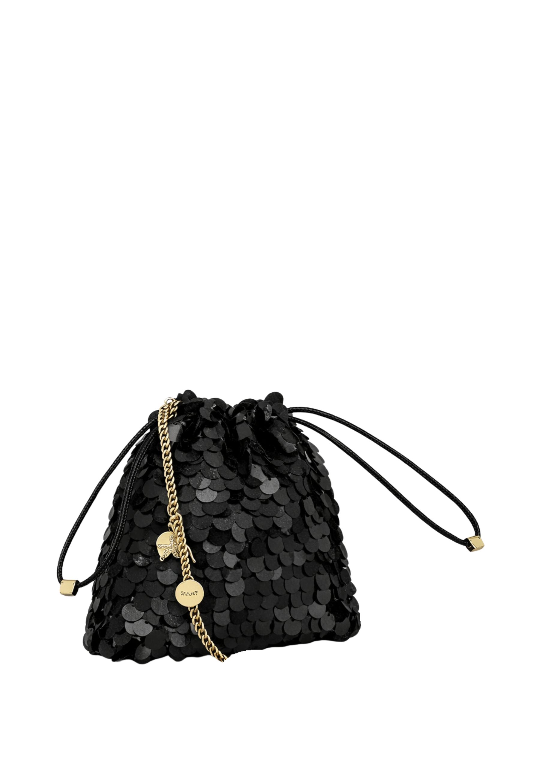 Pochette dallo stile elegante e luminoso, ideale per completare outfit serali e occasioni speciali. Il design a secchiello è valorizzato da una superficie ricoperta di paillettes tono su tono, che dona movimento e raffinatezza al modello.
