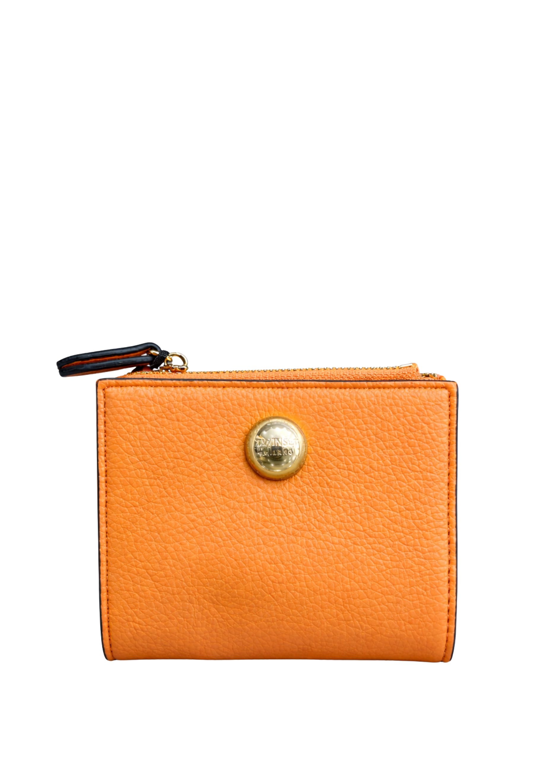 Portafoglio da donna realizzato in poliuretano effetto pelle, caratterizzato da un design compatto ed elegante. Linterno è organizzato con scomparti porta carte, tasche interne e tasca portamonete con zip. Completato dalliconico bottone logo Twinset Milano in metallo sul fronte.