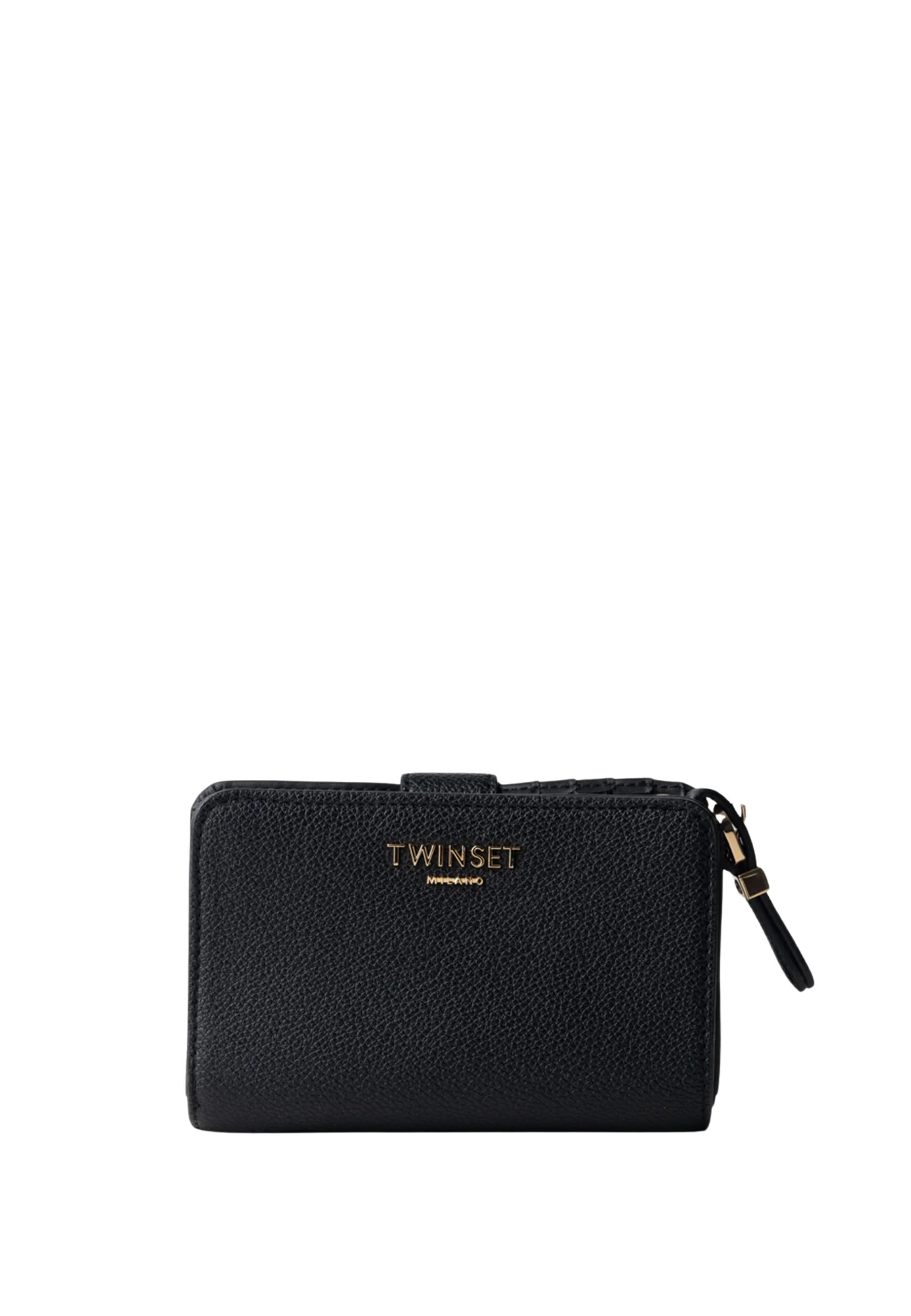 Compatto, elegante e funzionale: questo portafoglio Twinset nero è laccessorio indispensabile da portare sempre con te. Realizzato in similpelle liscia, si distingue per la silhouette pulita e raffinata, impreziosita dal logo ovale in metallo dorato con la T centrale, simbolo iconico del brand.