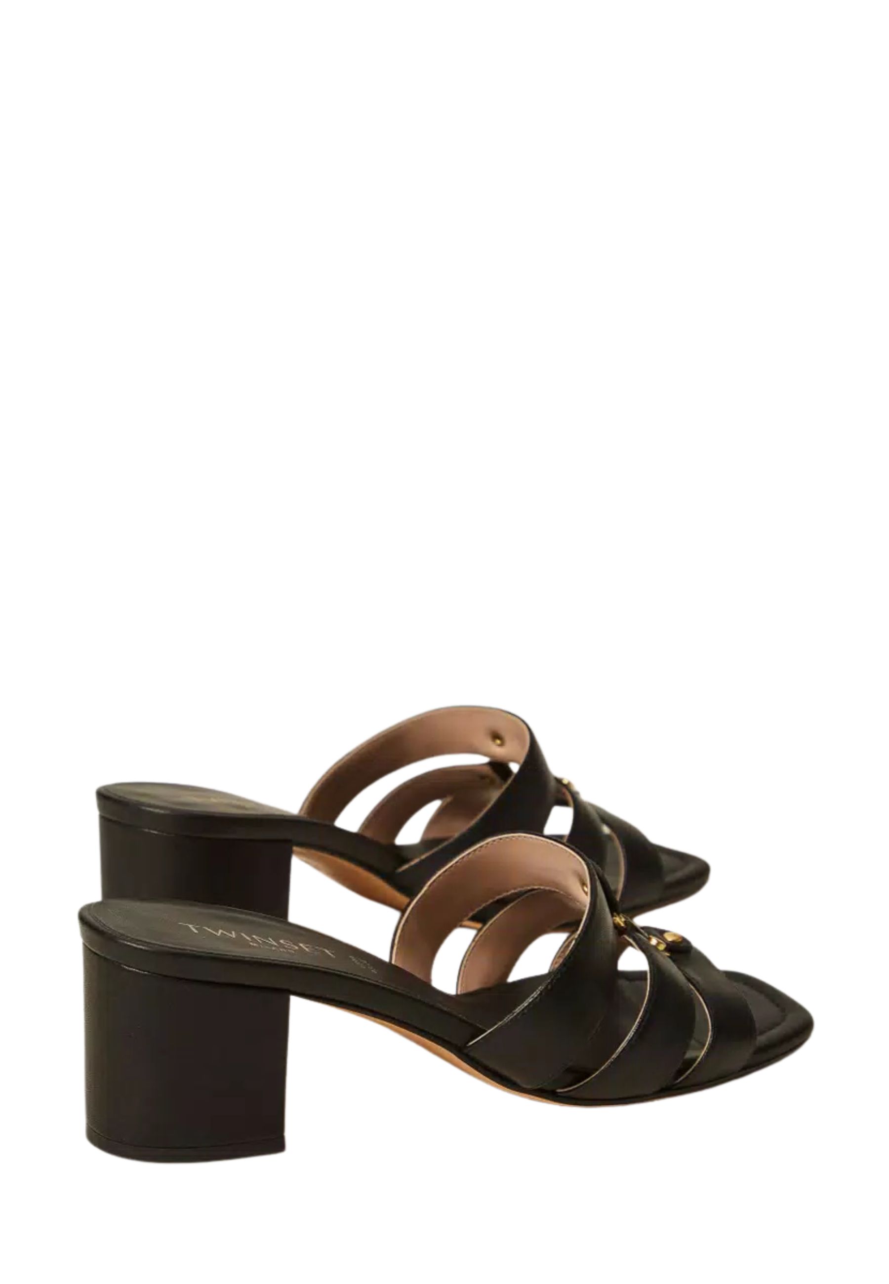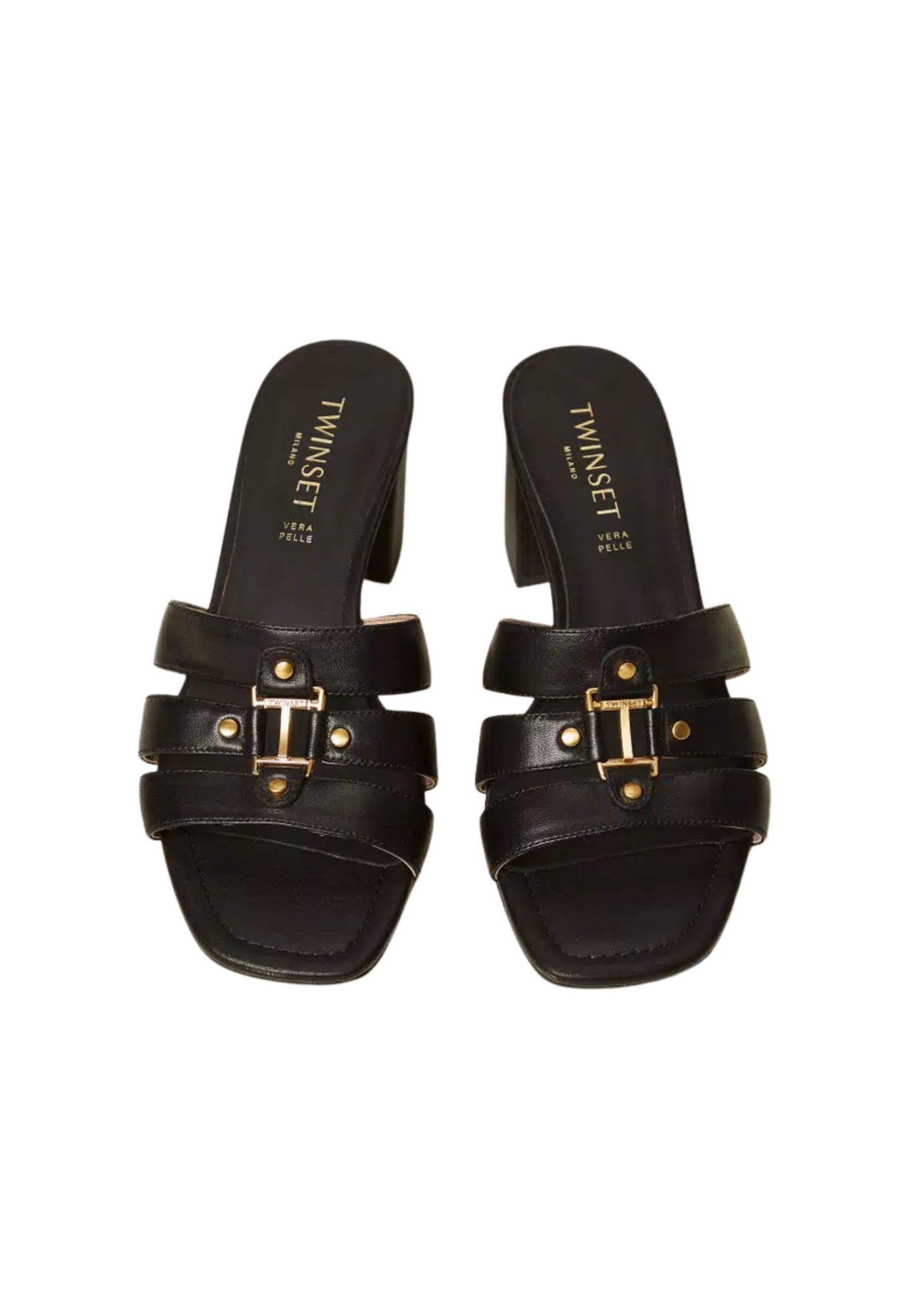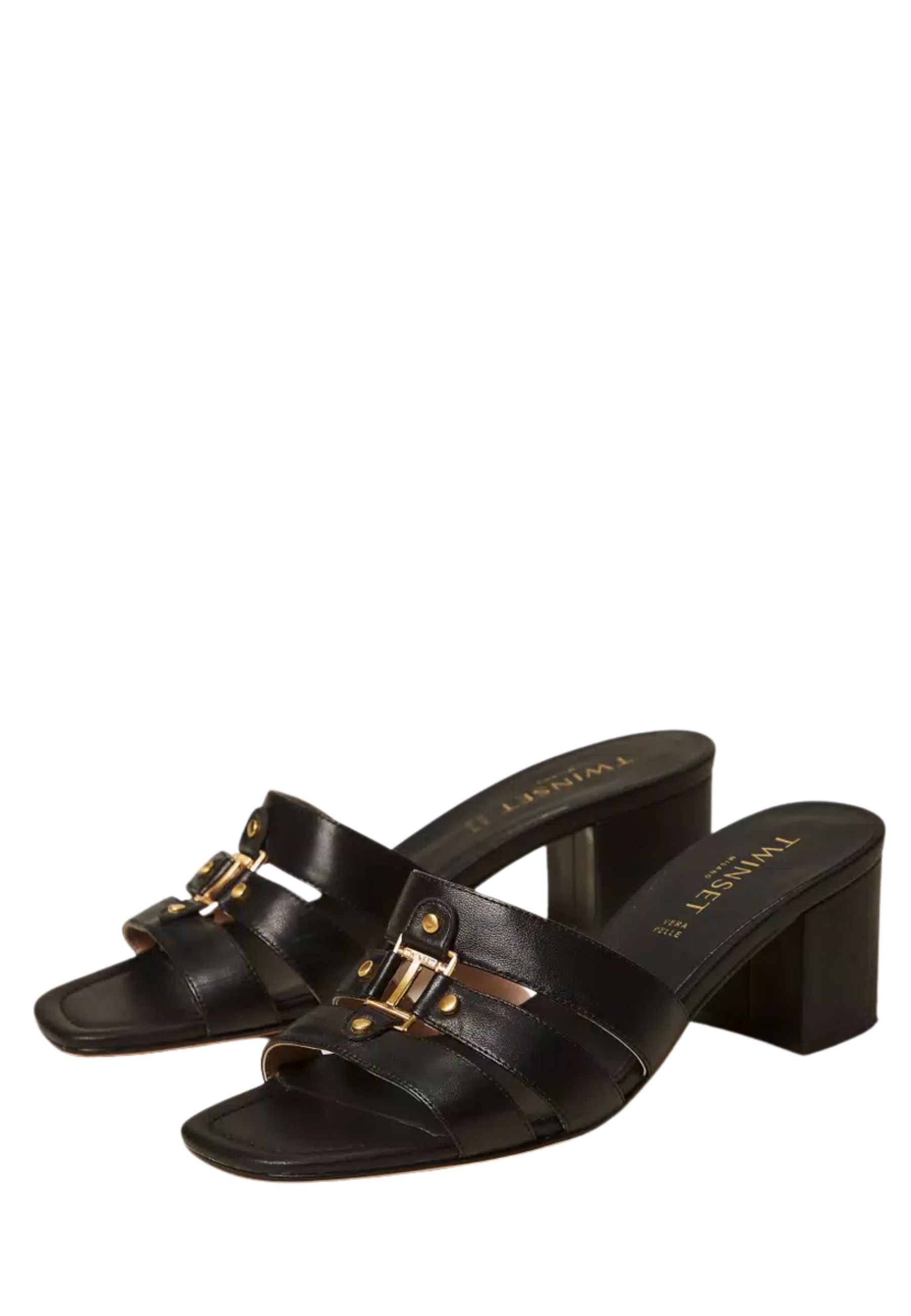 Sandali mules in pelle con logo in metallo, costruzione con listini, fondo in tunit.