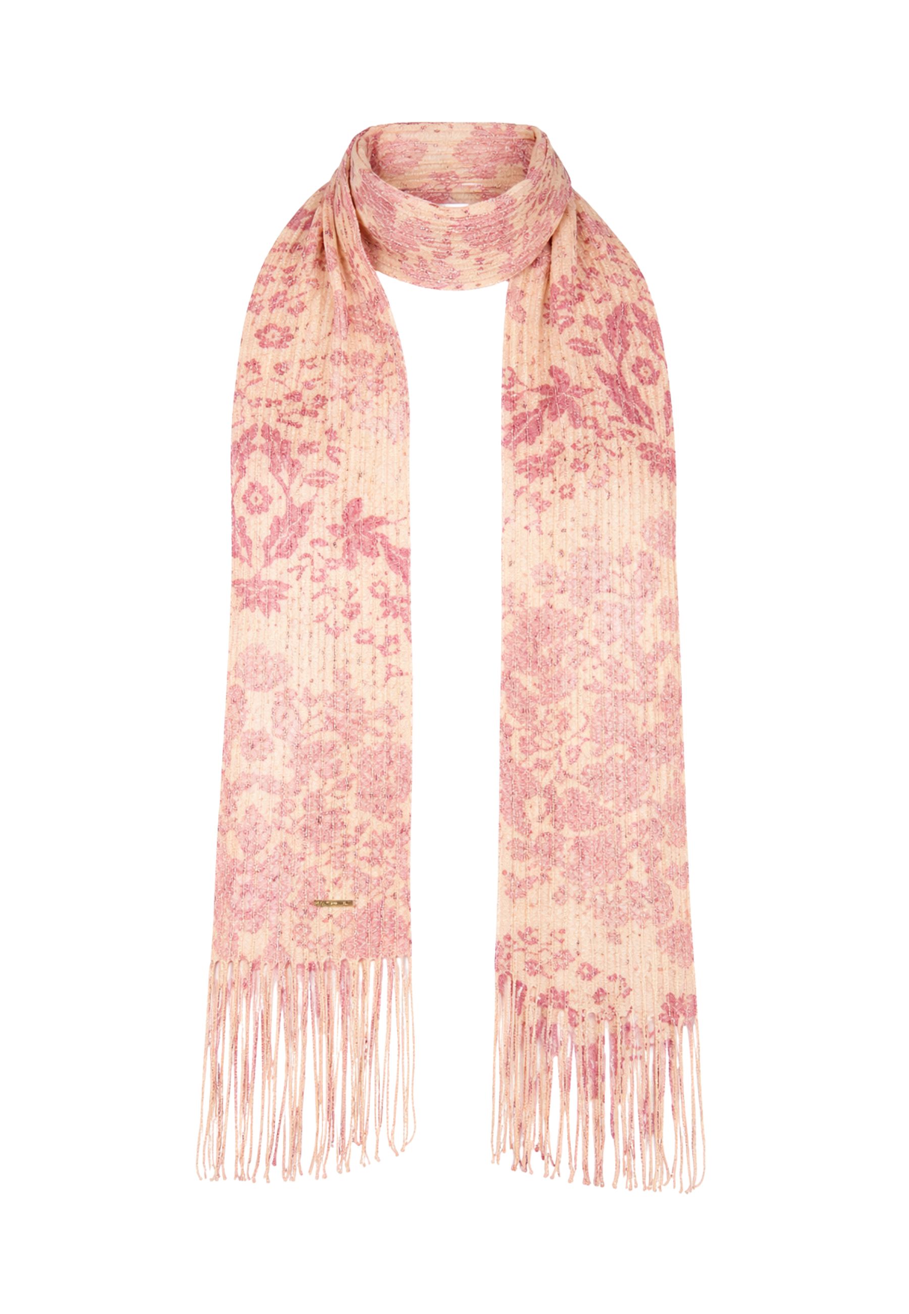 Sciarpa con frange dal design raffinato, pensata per completare look quotidiani ed eleganti con un tocco femminile. Realizzata in tessuto leggero e piacevole al tatto, è caratterizzata da una lavorazione delicata con motivo decorativo all-over e bordi rifiniti con frange sottili che donano movimento e stile.