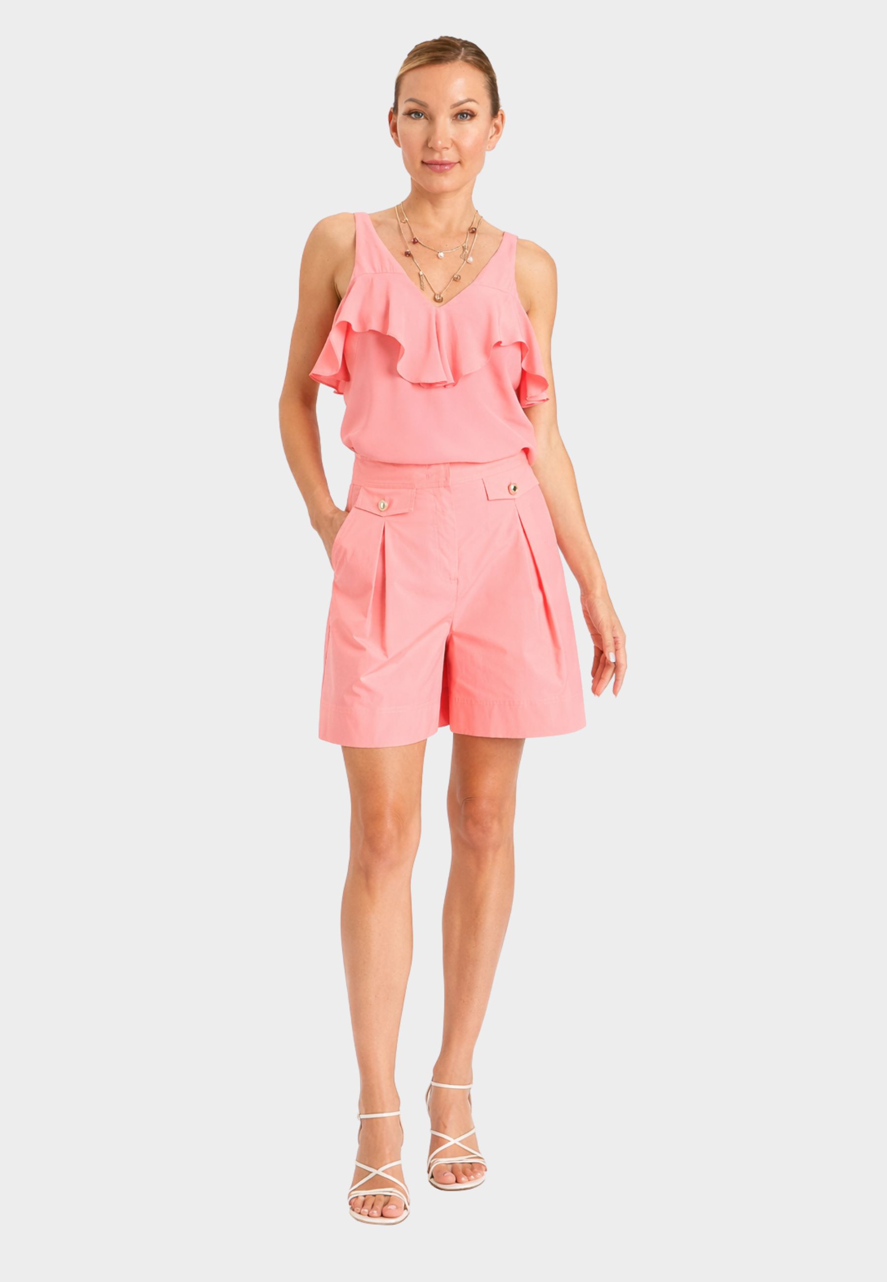 Shorts a vita alta realizzati in tessuto di cotone stretch, caratterizzati da linea morbida e costruzione strutturata con piega frontale che valorizza la silhouette. Il design è completato da patte decorative con bottone applicate sul davanti e fondo rifinito con orlo alto.