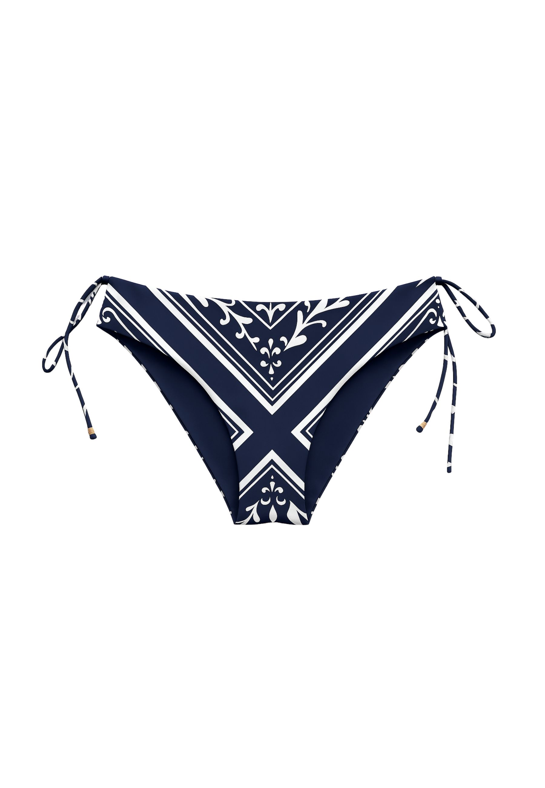 Slip da bagno a stampa foulard, fantasia esclusiva Twinset, con coulisse e laccetti regolabili ai fianchi con anelli dorati al fondo, logo a cuore sul retro.