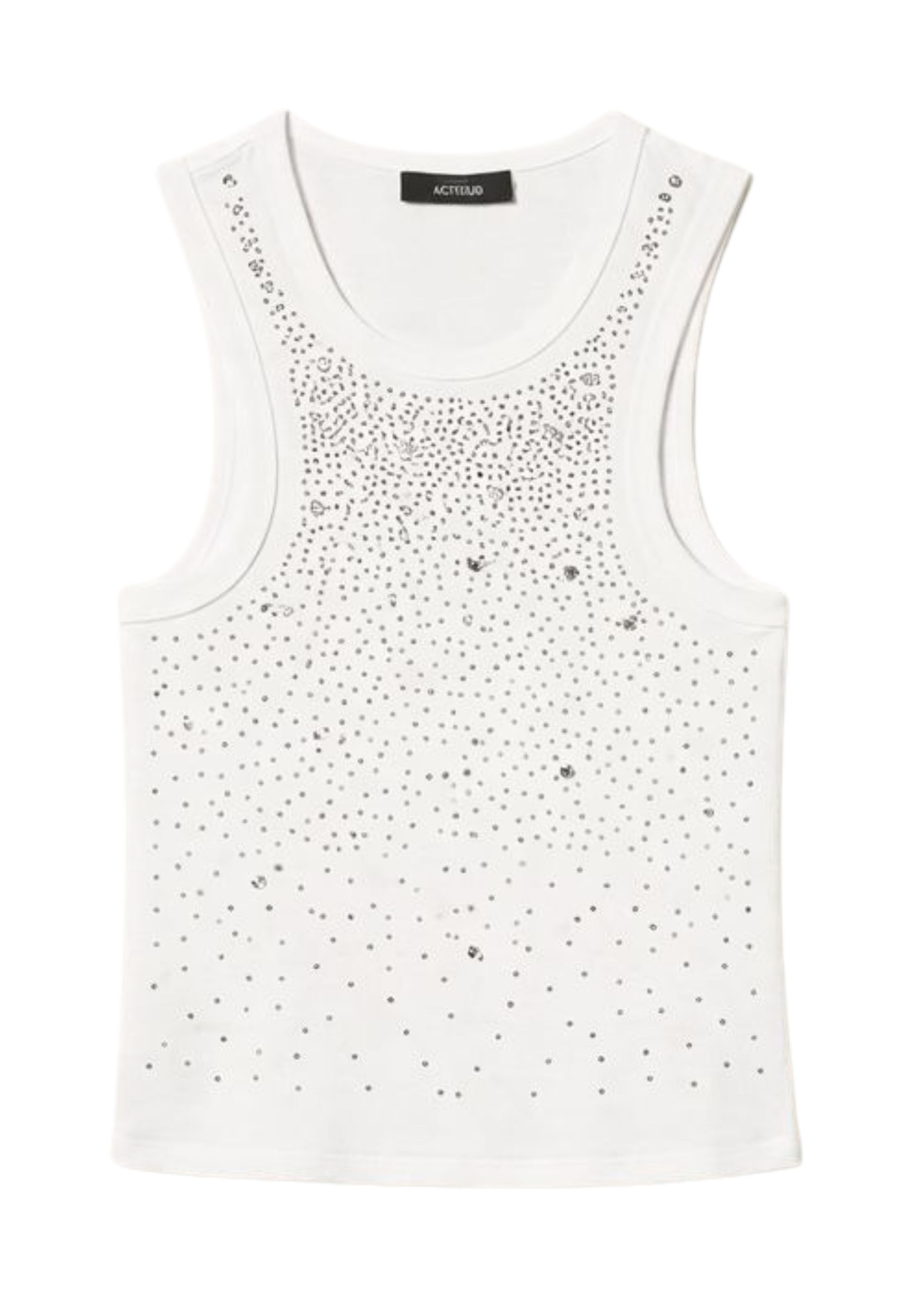 Top della collezione Actitude realizzato in misto cotone lavorato a costine, caratterizzato da una raffinata decorazione frontale con termoadesivi e castoni ricamati a mano in dégradé, che donano luminosità e un tocco contemporaneo al capo.