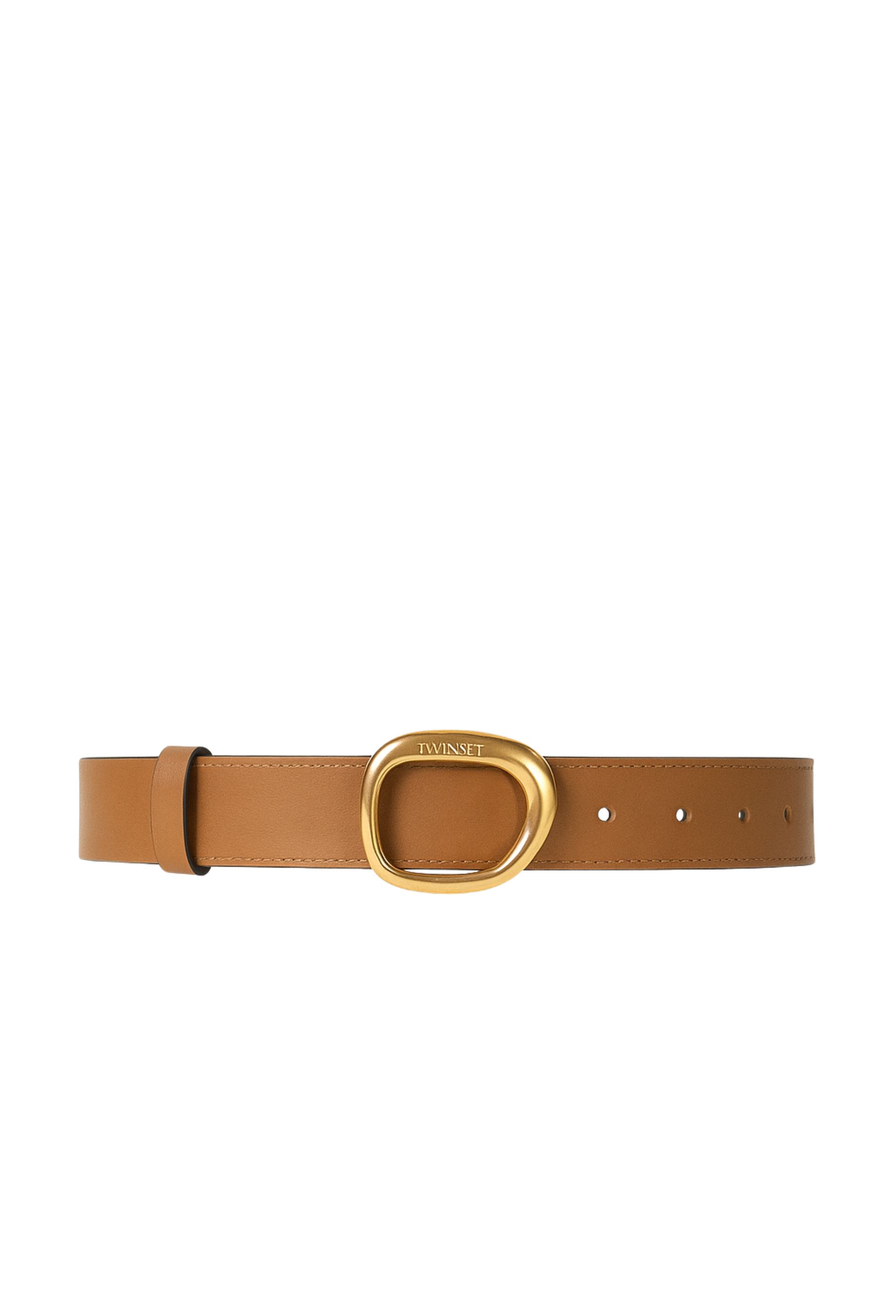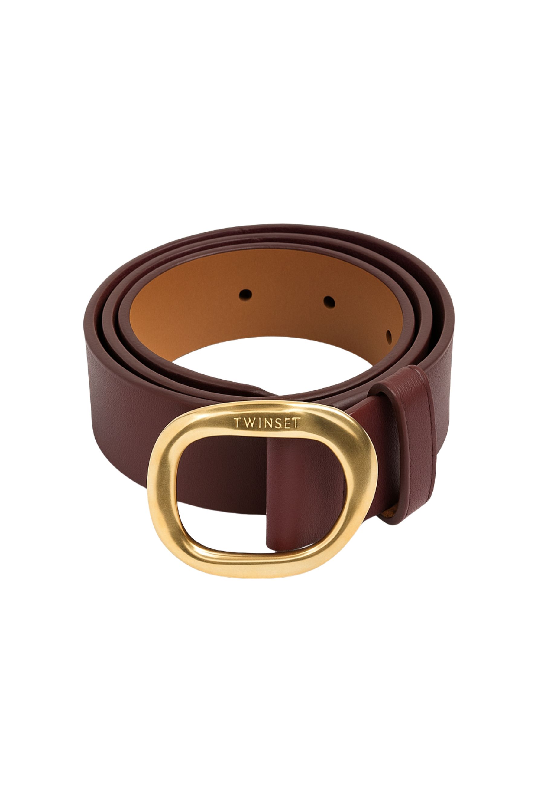 - Design: modello lineare con fibbia ovale in metallo dorato lucido, impreziosita dal logo Twinset inciso.