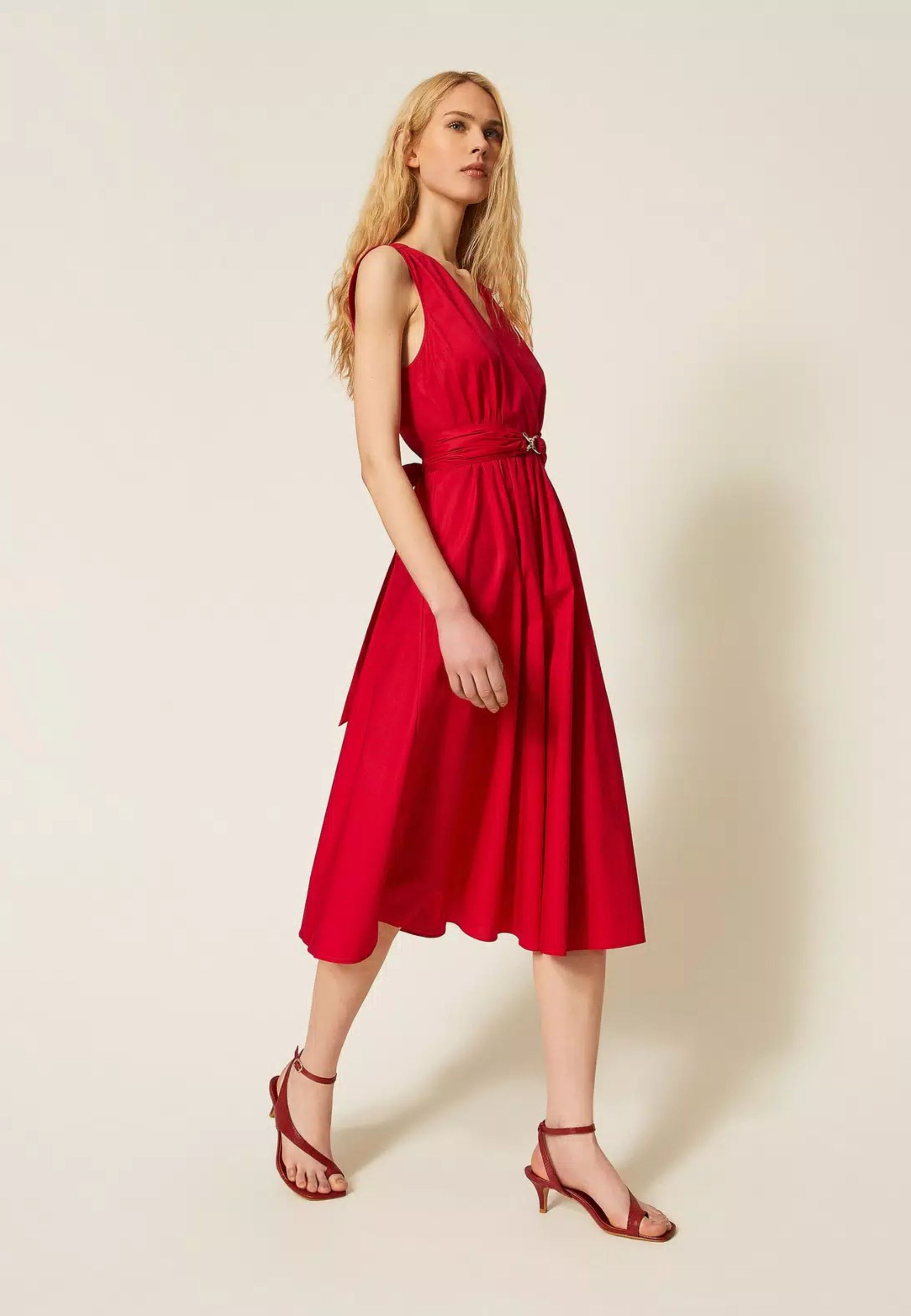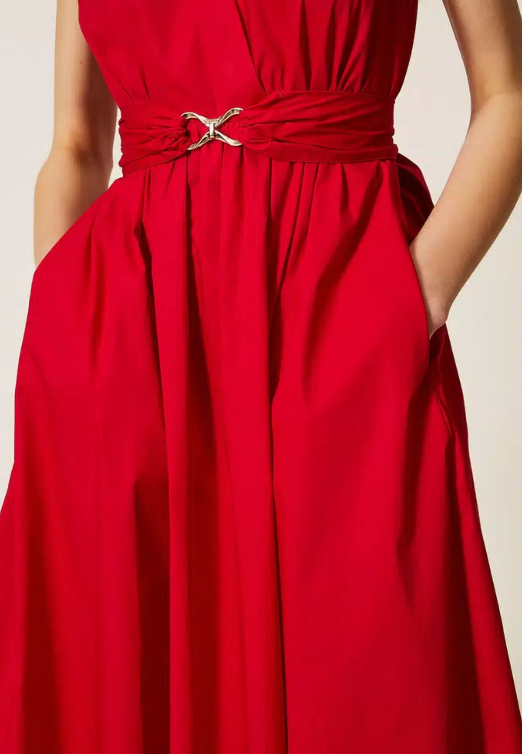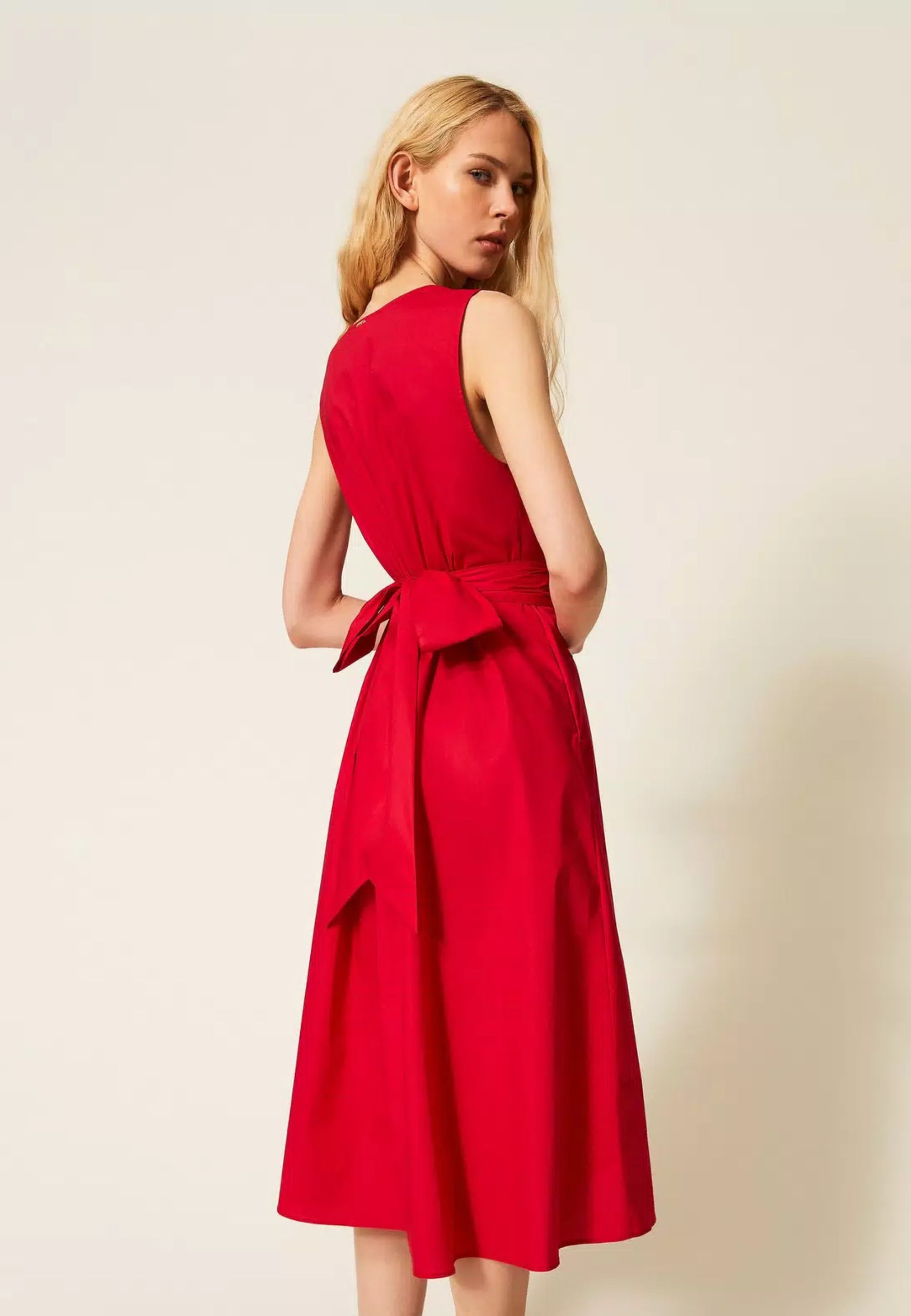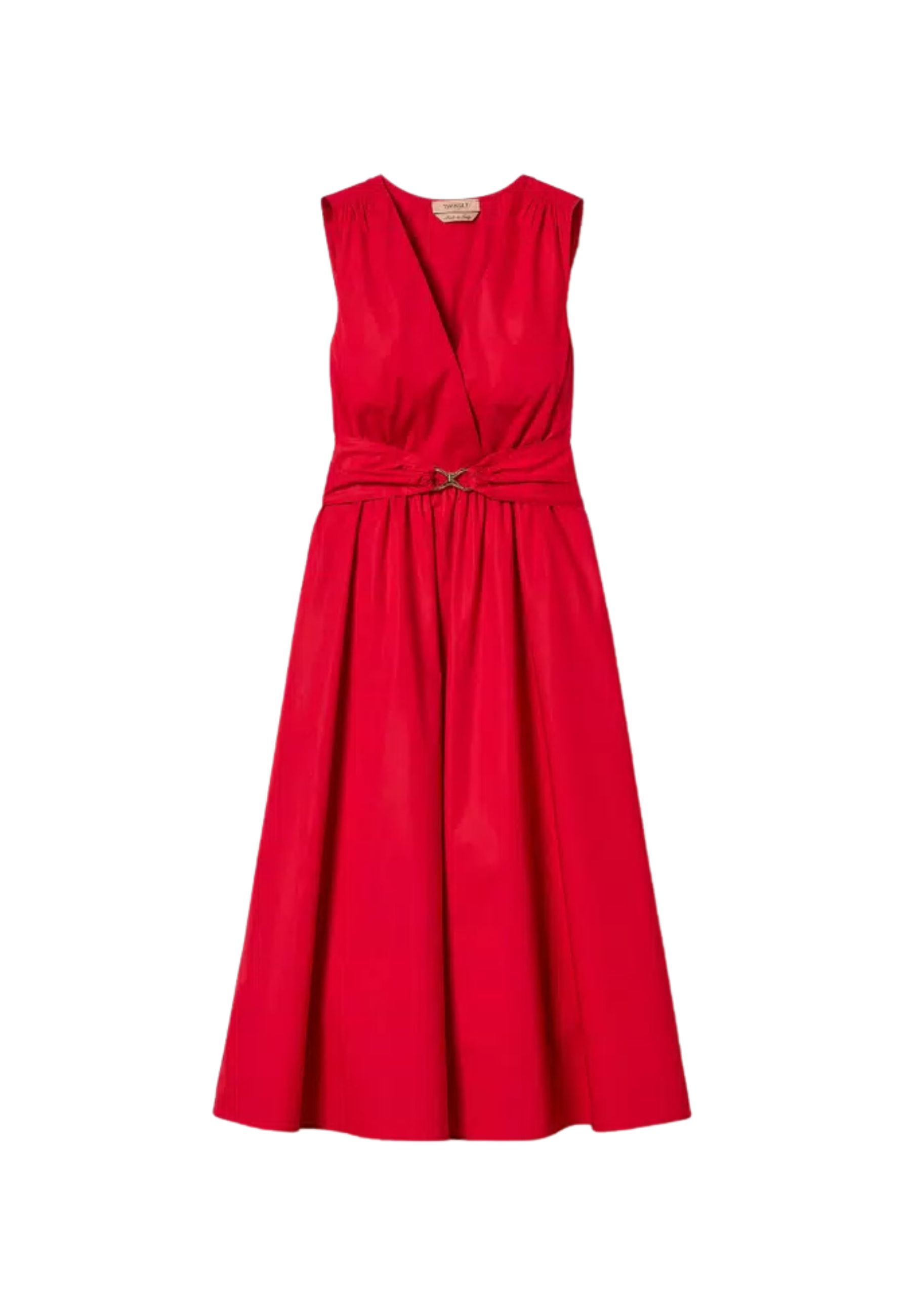 Abito Twinset Milano in popeline di cotone stretch, caratterizzato da una silhouette femminile ed elegante che valorizza la figura con naturalezza. Il modello presenta scollo a V incrociato, senza maniche e taglio in vita con arricciatura, che crea volume e movimento nella gonna longuette.