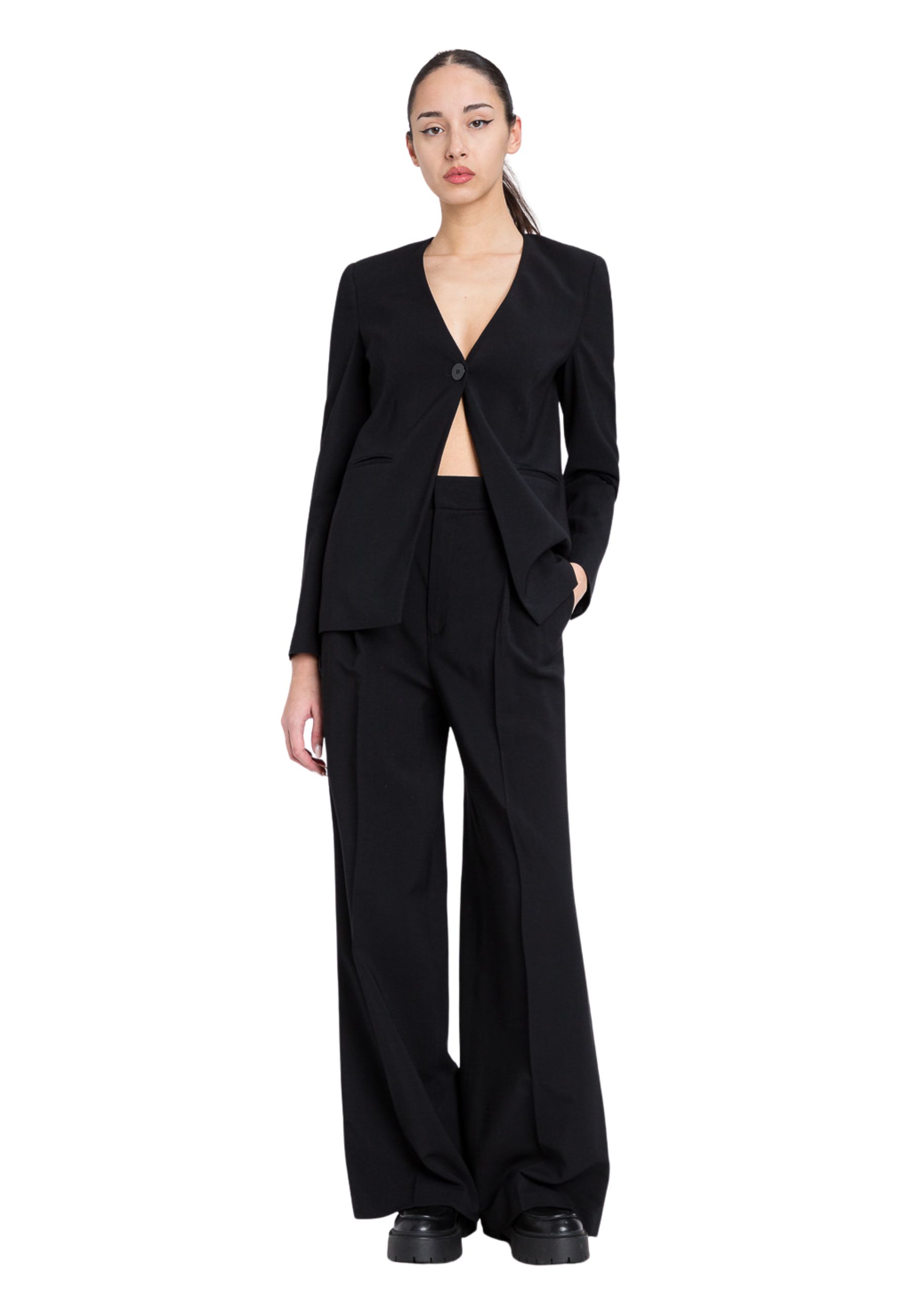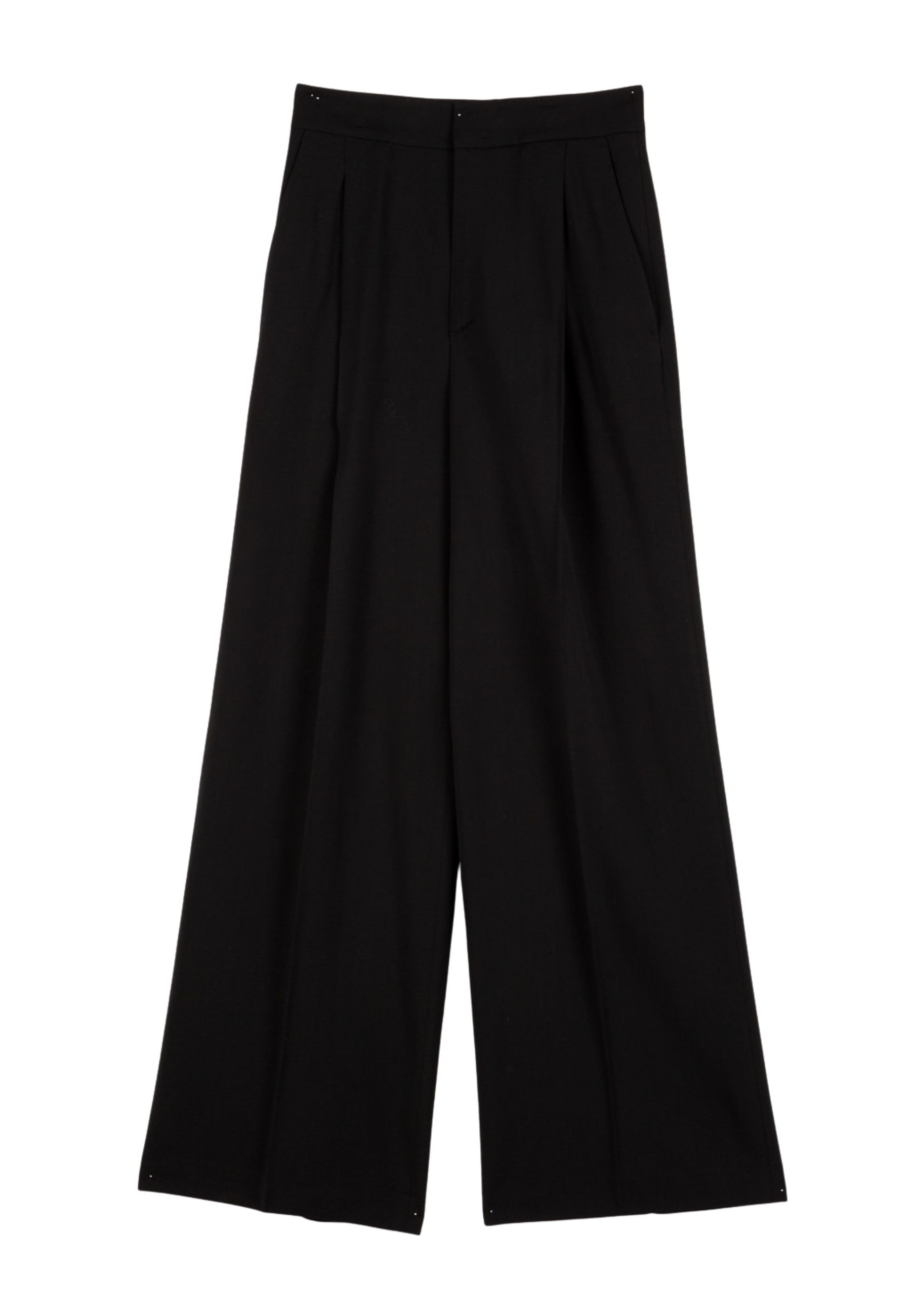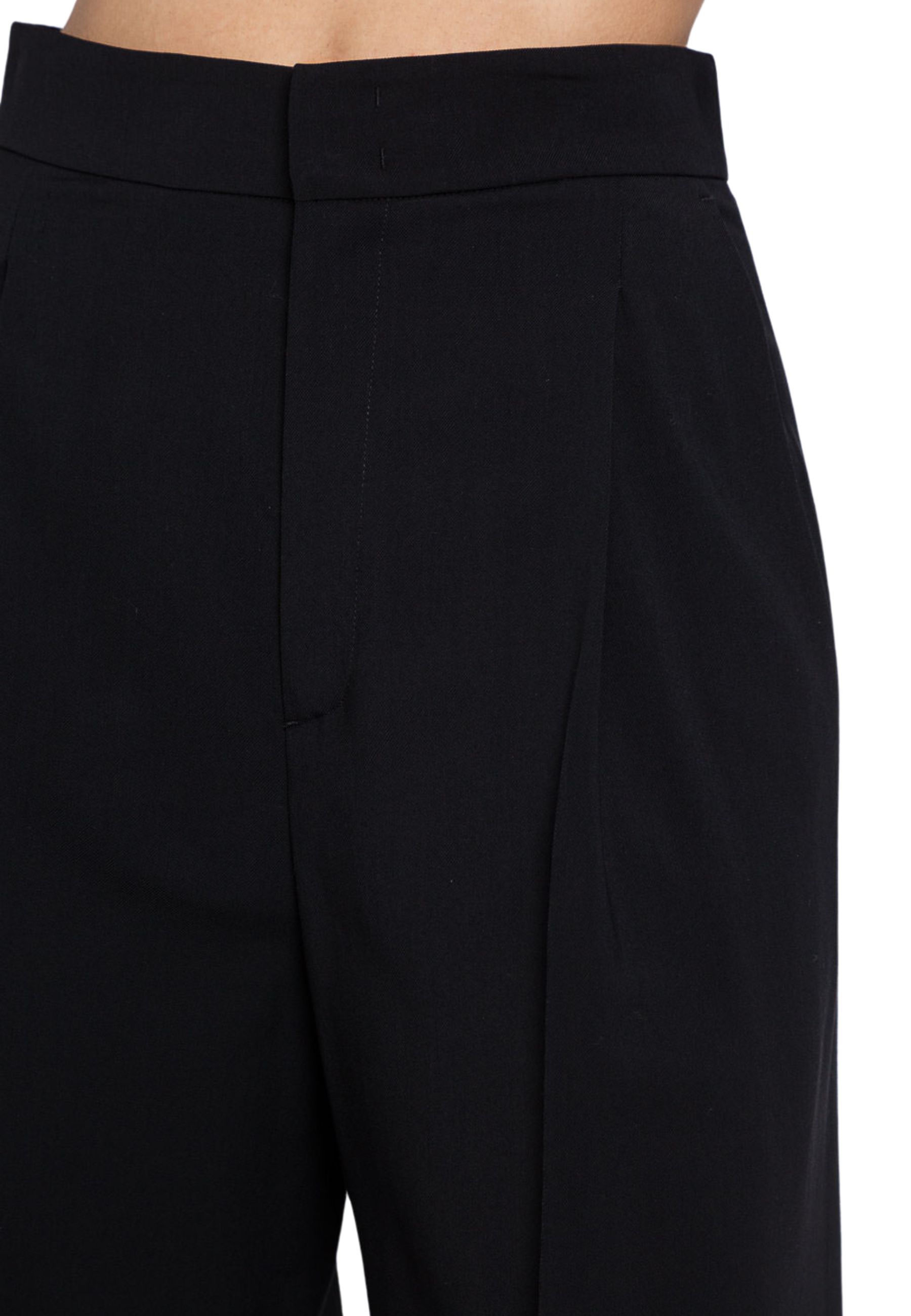 - Dettagli: vita regolare, pieghe frontali, gamba ampia, tasche laterali.