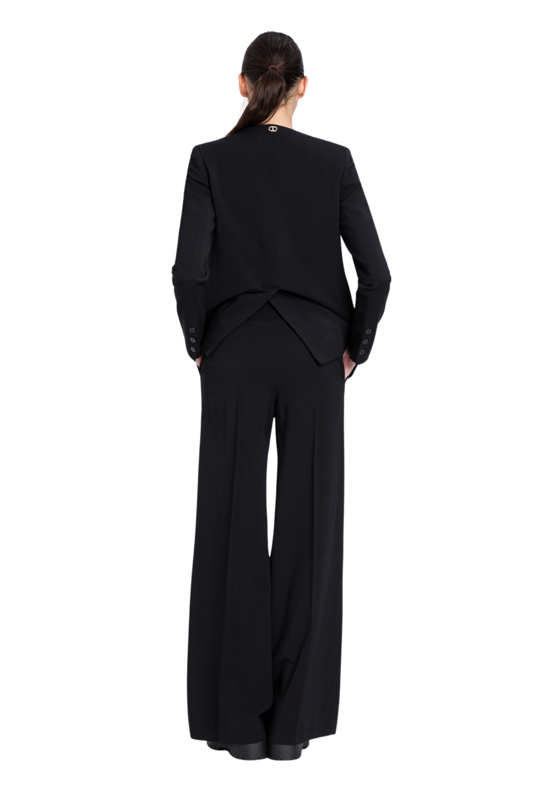 Pantaloni dal fascino elegante firmati Twinset Milano, realizzati in tessuto fluido che assicura comfort e stile. Presentano vita regolare, pieghe frontali che donano struttura e gamba ampia che slancia la silhouette. Un modello versatile, perfetto per look sofisticati e contemporanei.
