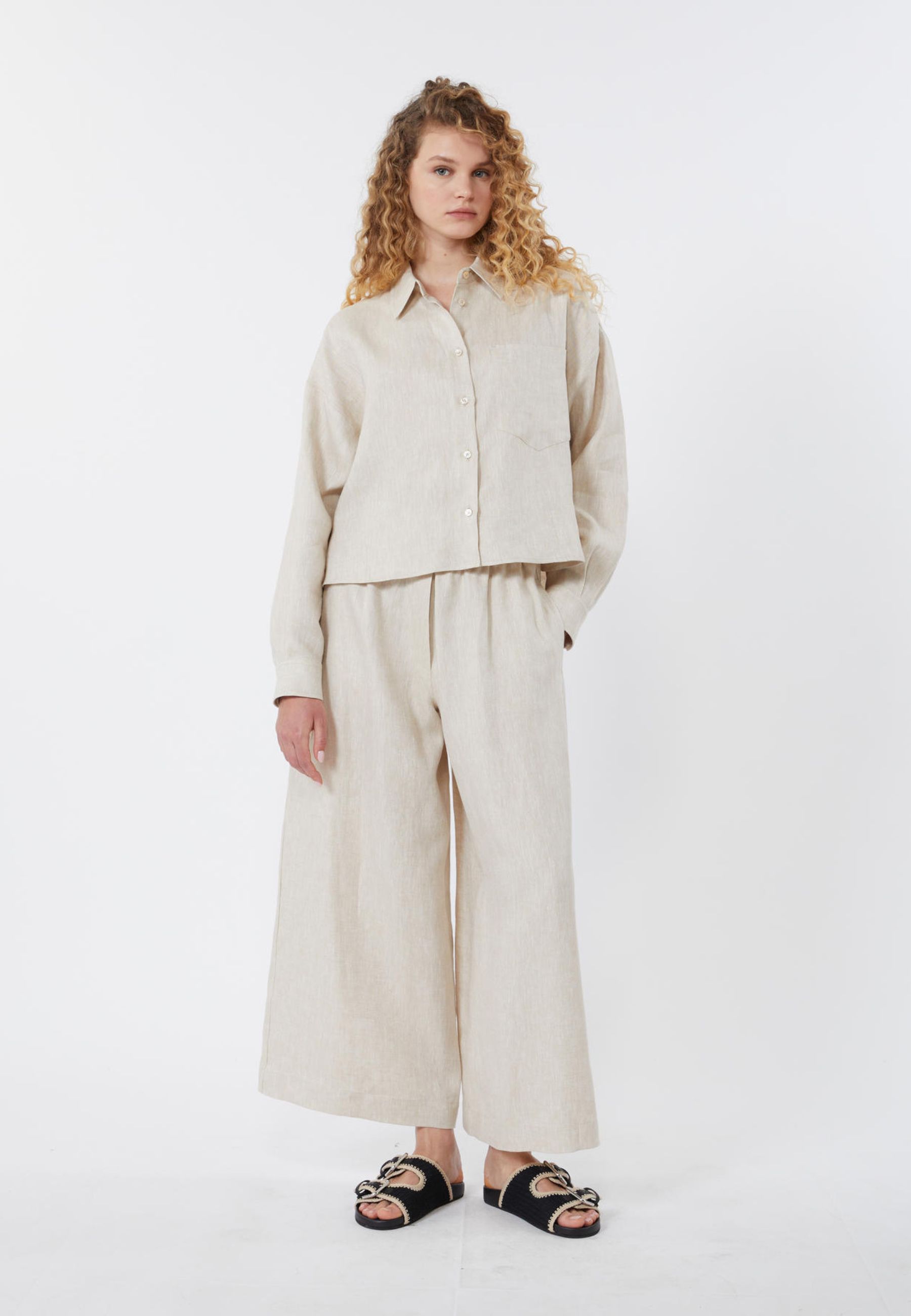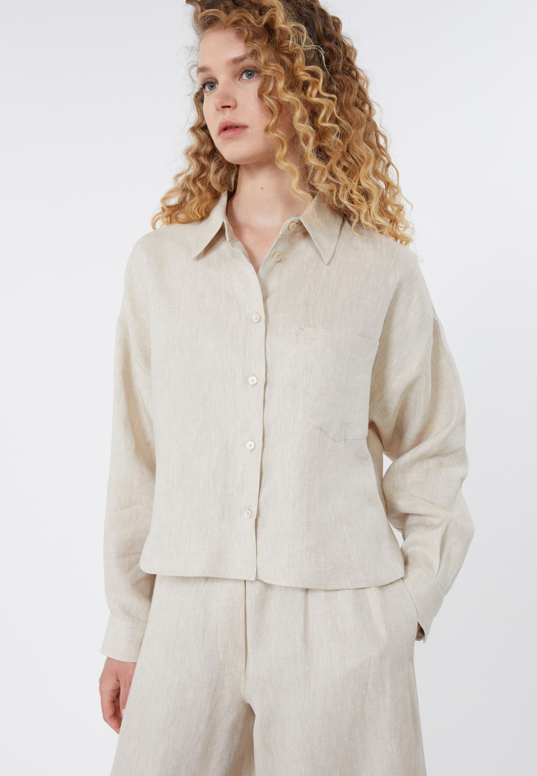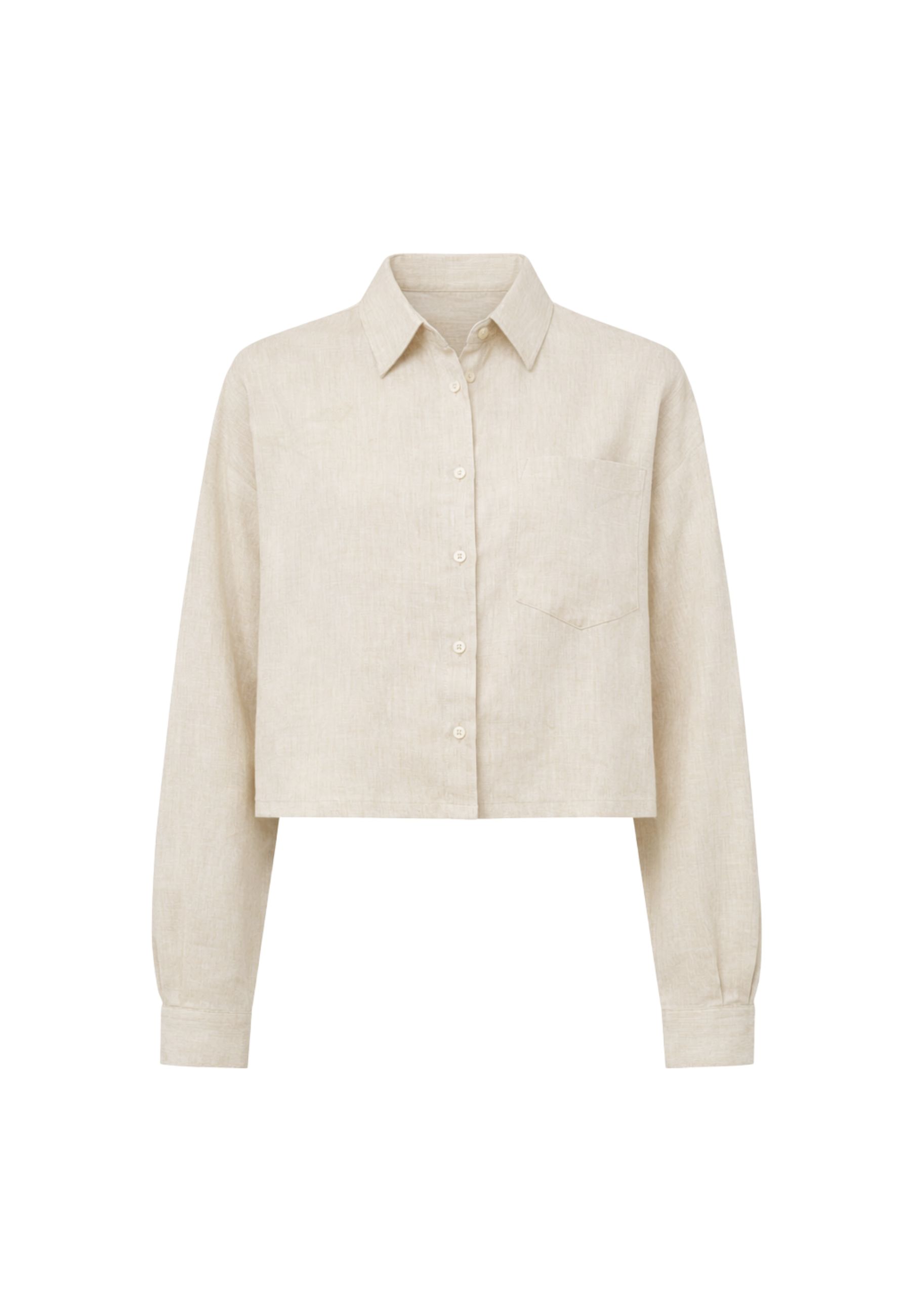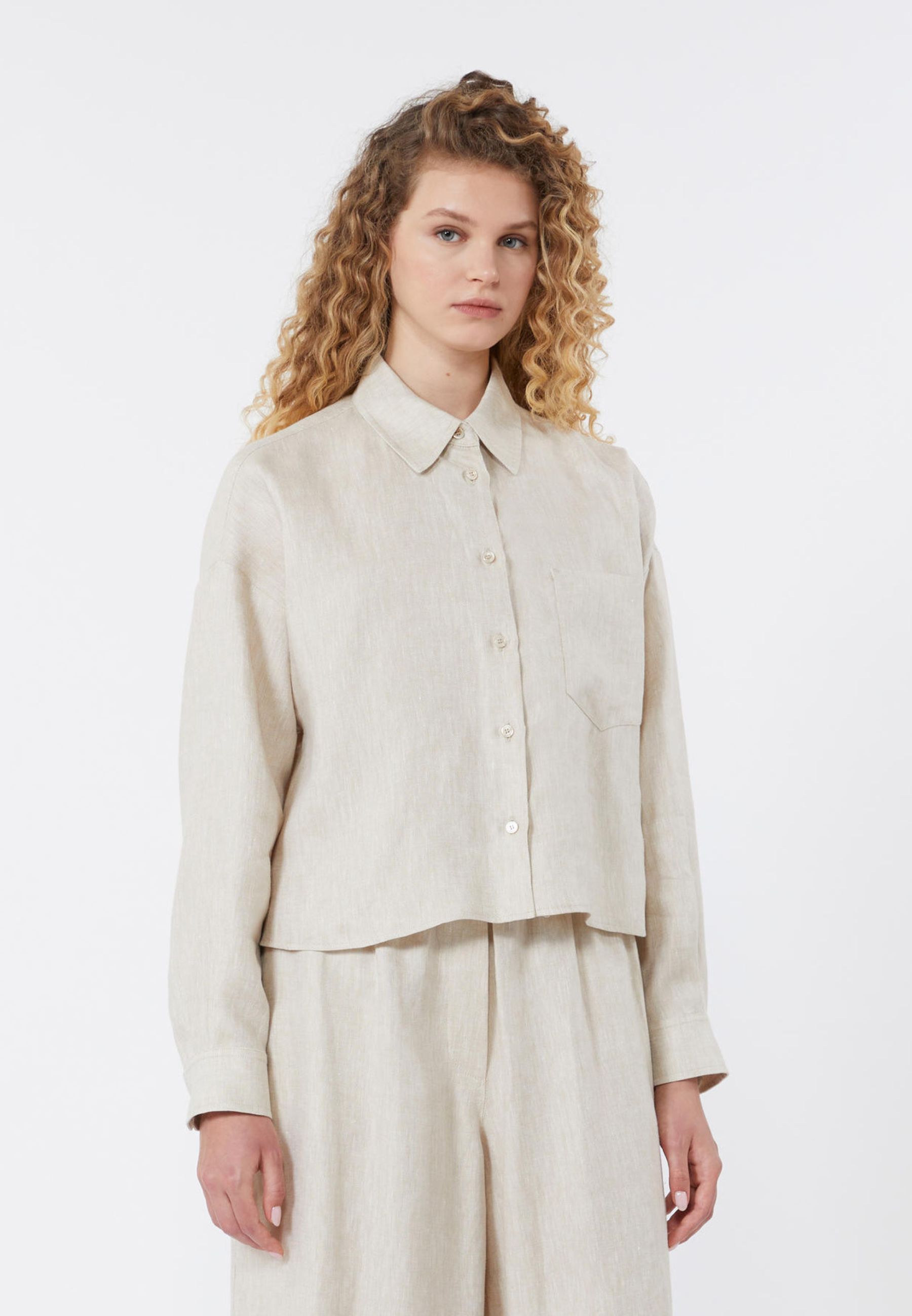 Giacca crop firmata Max Mara, caratterizzata da una linea ispirata alla camicia e realizzata in canvas di puro lino, un tessuto naturale leggero e traspirante ideale per la stagione primaverile ed estiva. Il design presenta una vestibilità boxy contemporanea con fondo asimmetrico leggermente più lungo sul retro, che dona movimento e modernità alla silhouette.