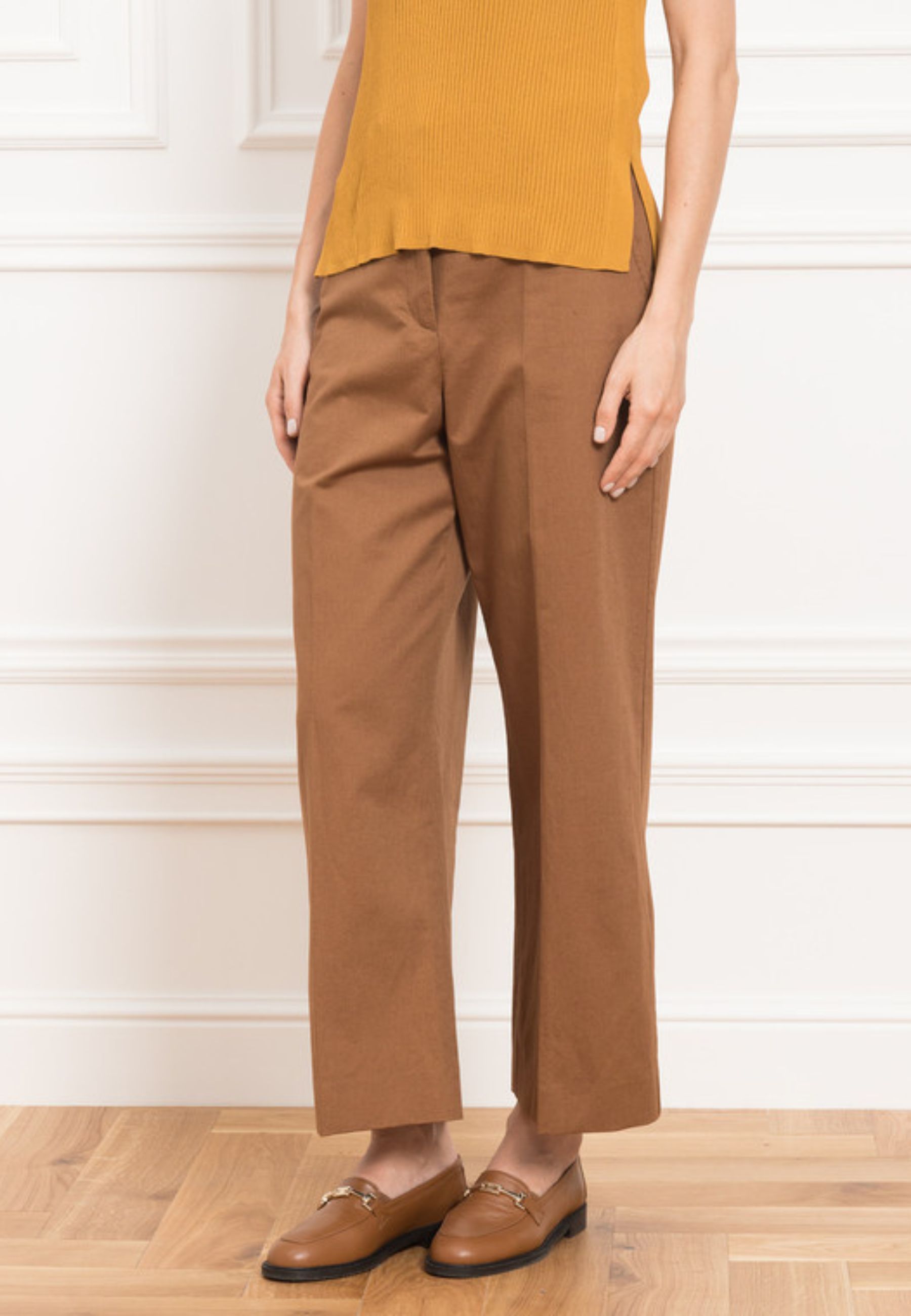 ~Pantaloni donna realizzati in pregiato tessuto misto cotone e lino, ideali per la stagione primavera-estate. Il modello Zircone si distingue per la linea wide leg ampia, elegante e fluida, valorizzata dalla piega stirata sia sul davanti che sul retro, che conferisce struttura e raffinatezza al capo.