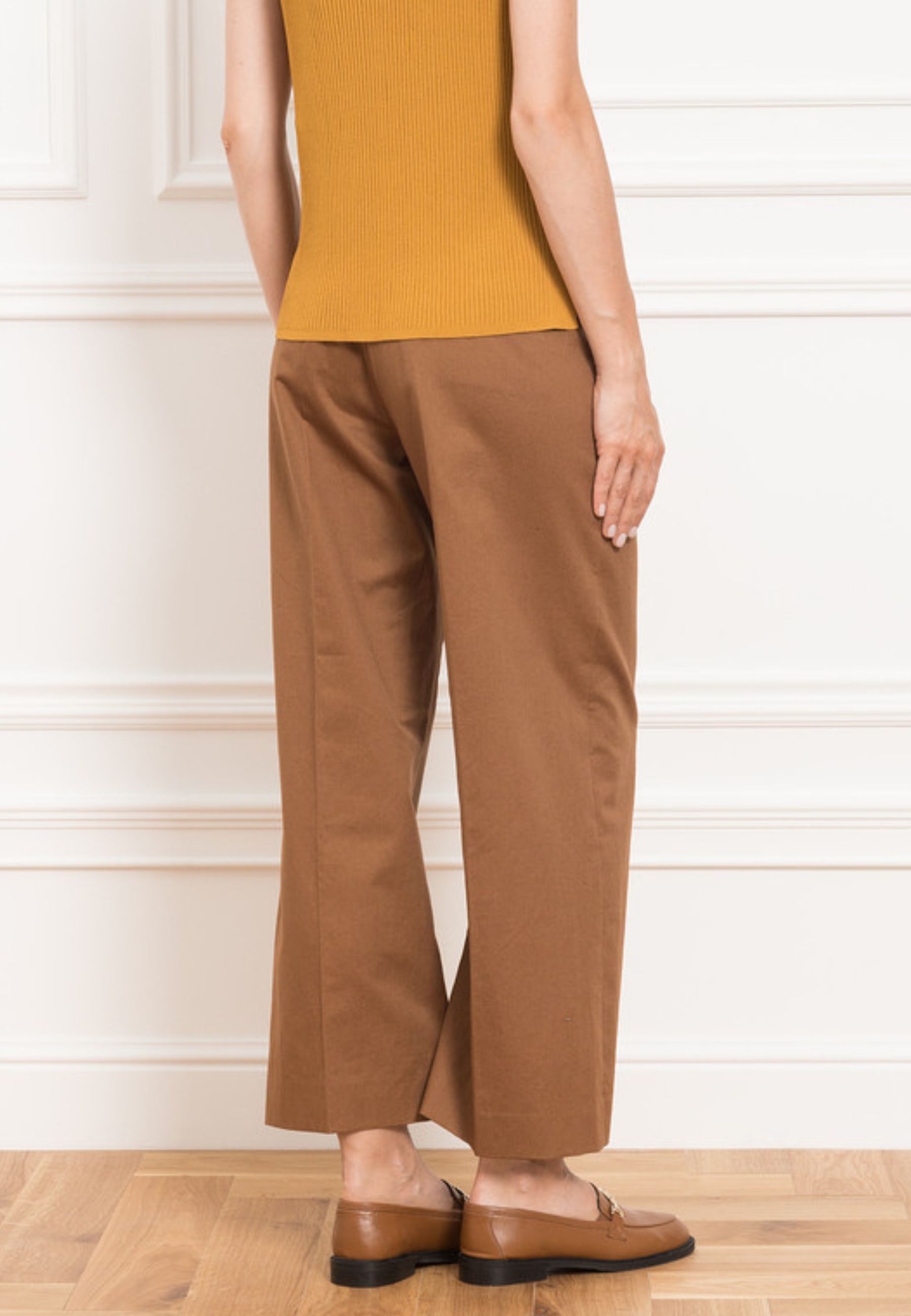 La chiusura con gancio e zip nascosta assicura una vestibilità pulita e ordinata. Completano il design le tasche alla francese sul davanti e le tasche a filetto sul retro, per un perfetto equilibrio tra funzionalità e stile sartoriale. Un pantalone versatile, pensato per look formali e casual chic, da abbinare a blazer coordinati, camicie leggere o top essenziali.