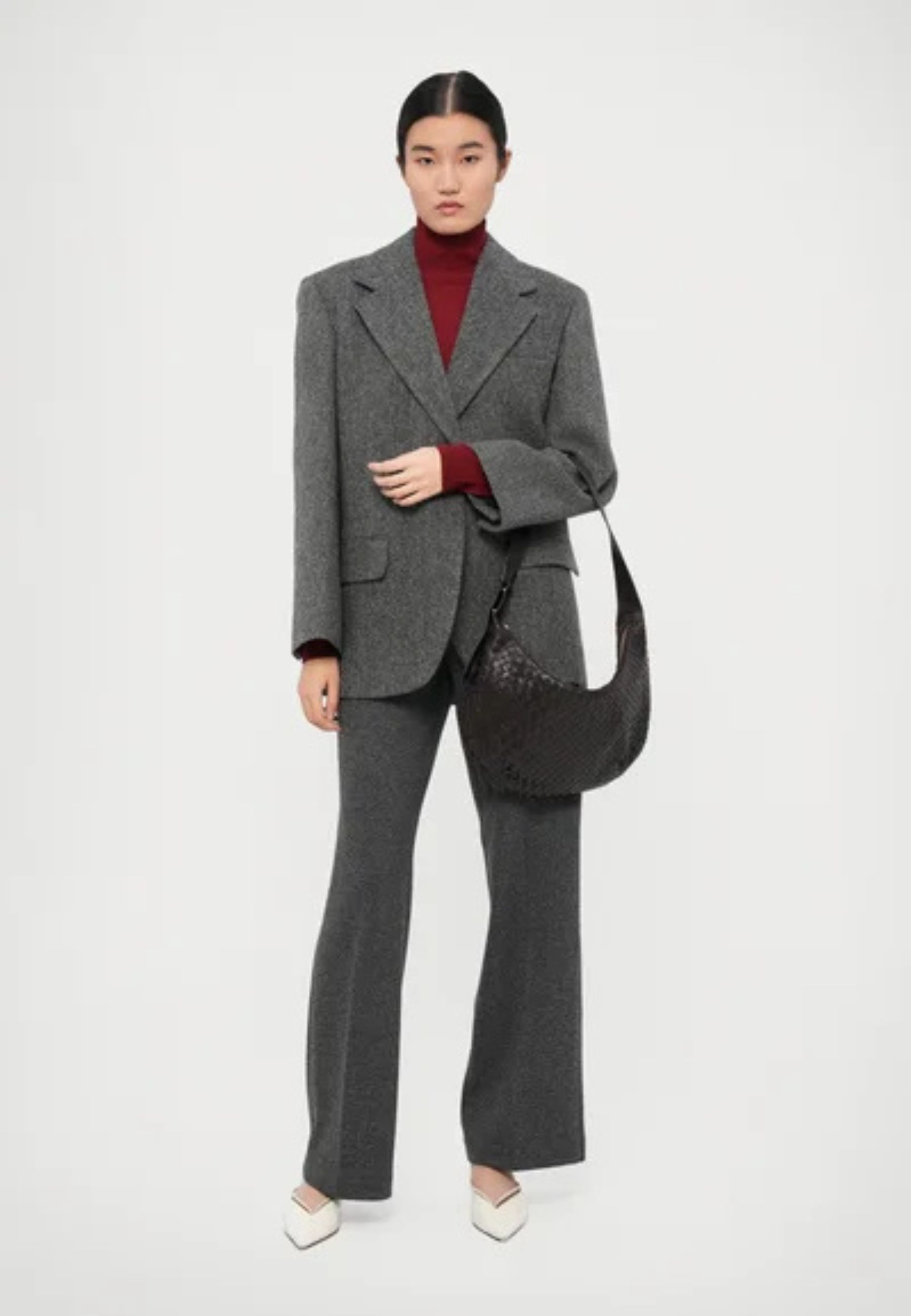 La struttura del blazer è valorizzata da spalline imbottite che definiscono la silhouette e da un classico colletto con rever, elemento distintivo del tailoring femminile del brand. La chiusura frontale con bottone mantiene la linea pulita e minimal, mentre le tasche con patta sui fianchi e la tasca sul petto aggiungono funzionalità e carattere sartoriale.