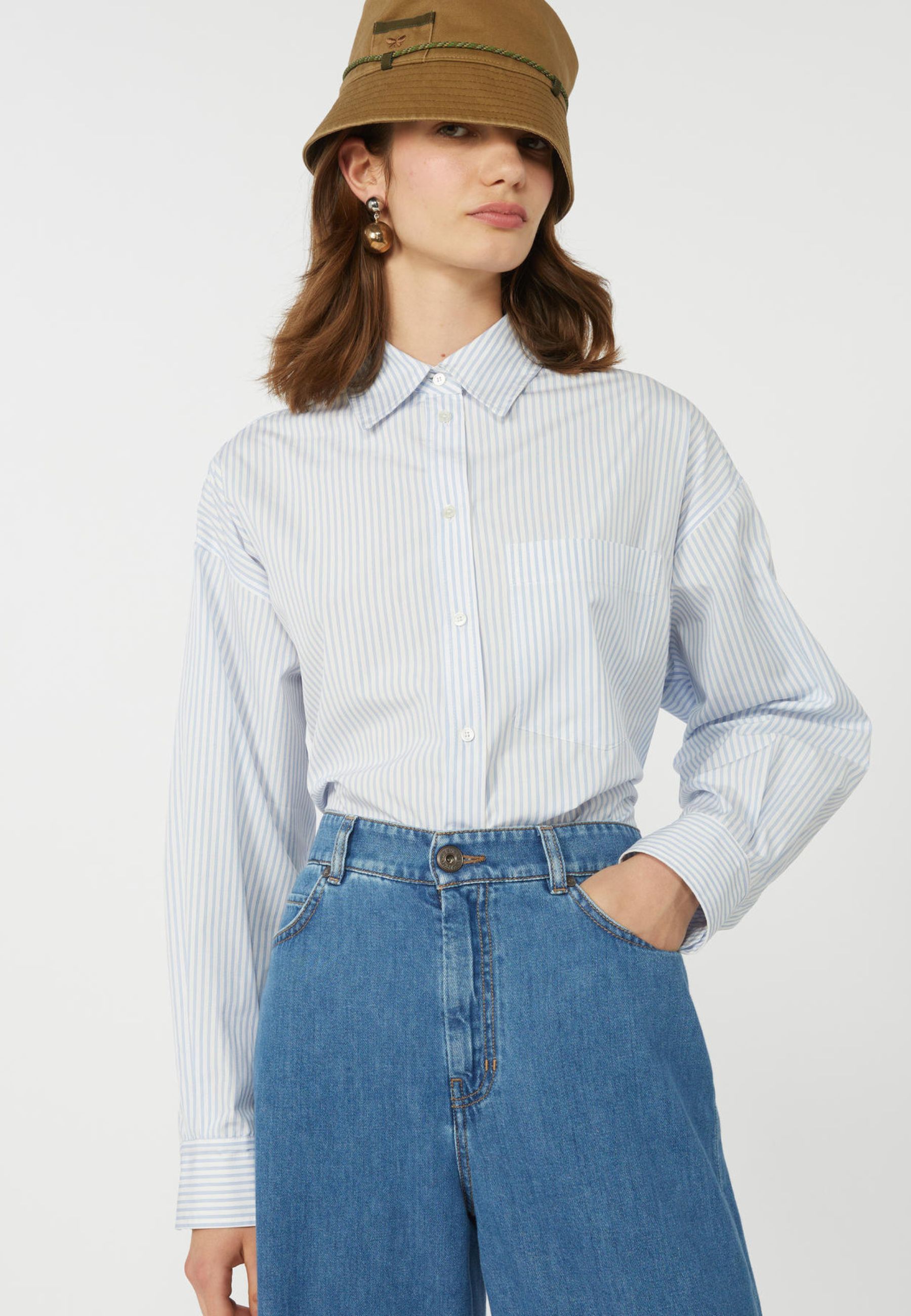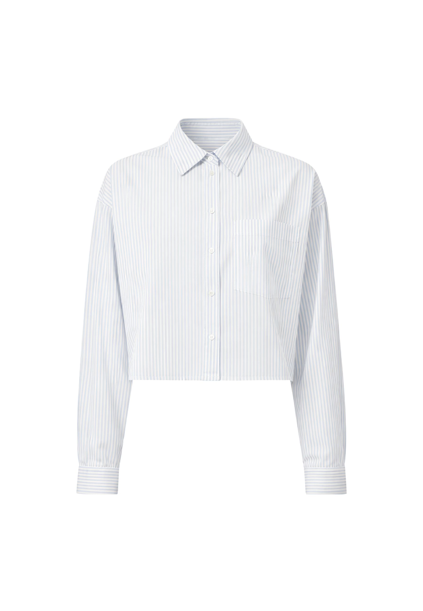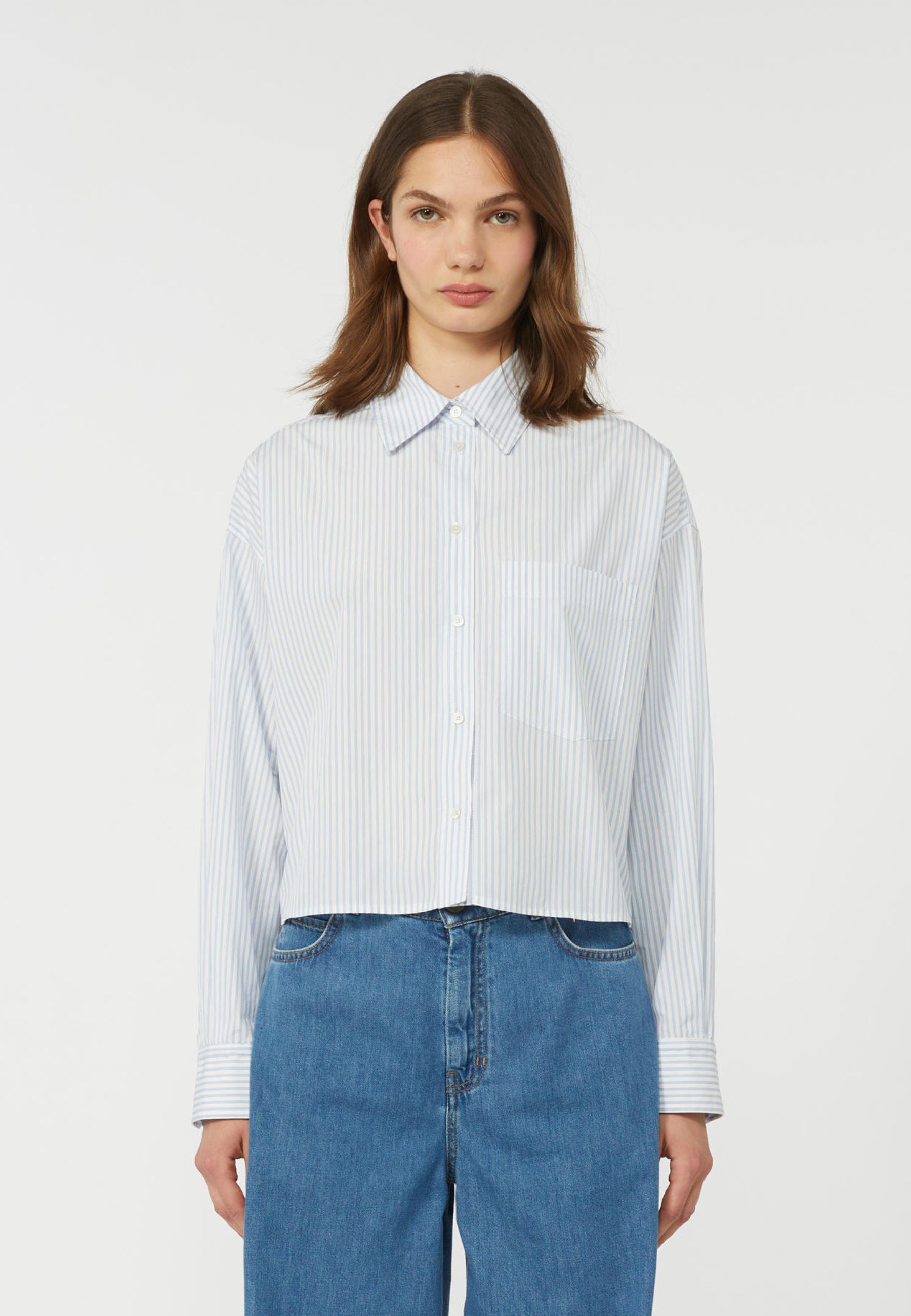 Camicia crop firmata Weekend Max Mara, ispirata alla classica camicia sartoriale e reinterpretata con una silhouette contemporanea. Realizzata in popeline di puro cotone, presenta un motivo rigato elegante e un tessuto leggero e traspirante, realizzato con cotone proveniente da agricoltura biologica.