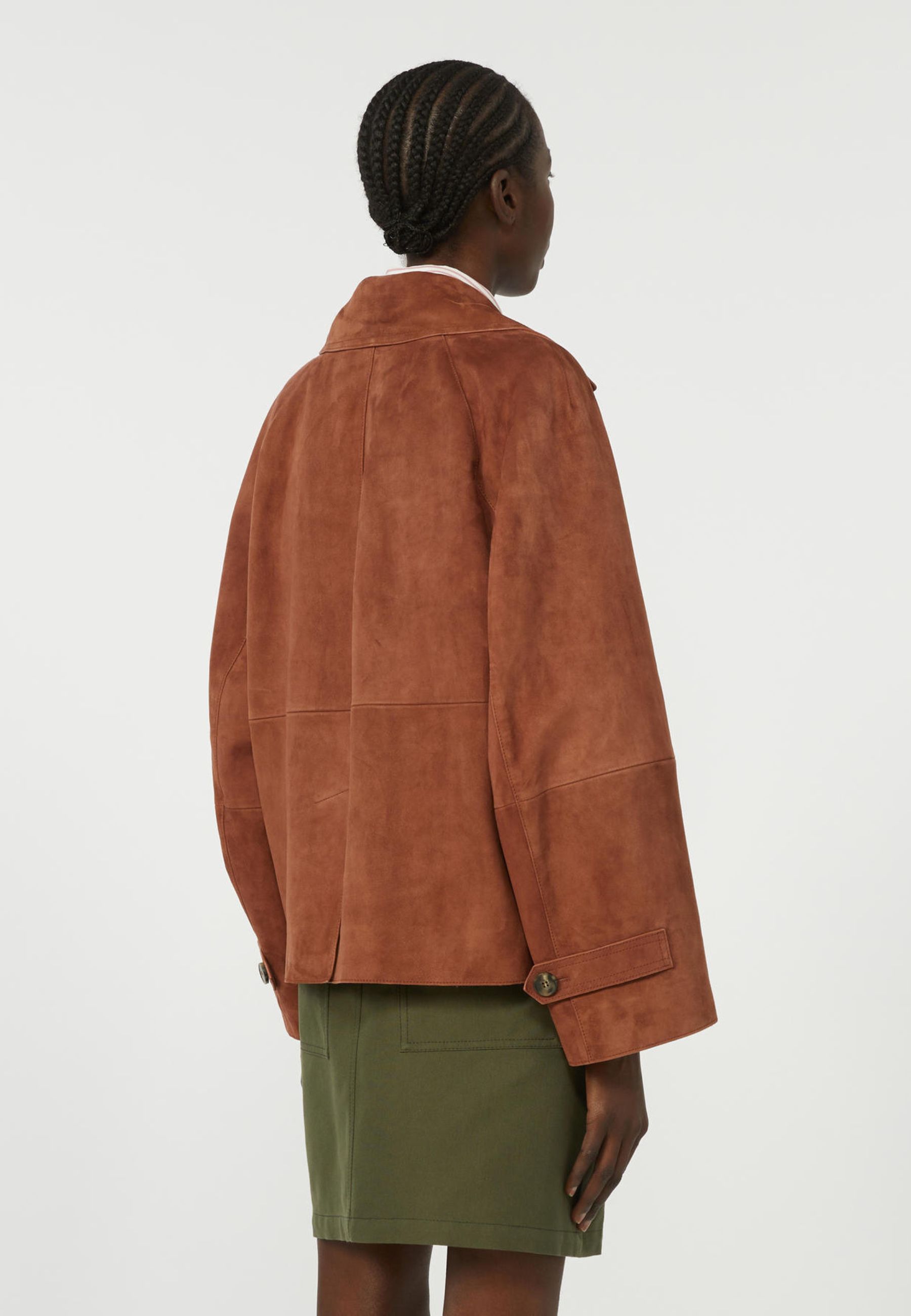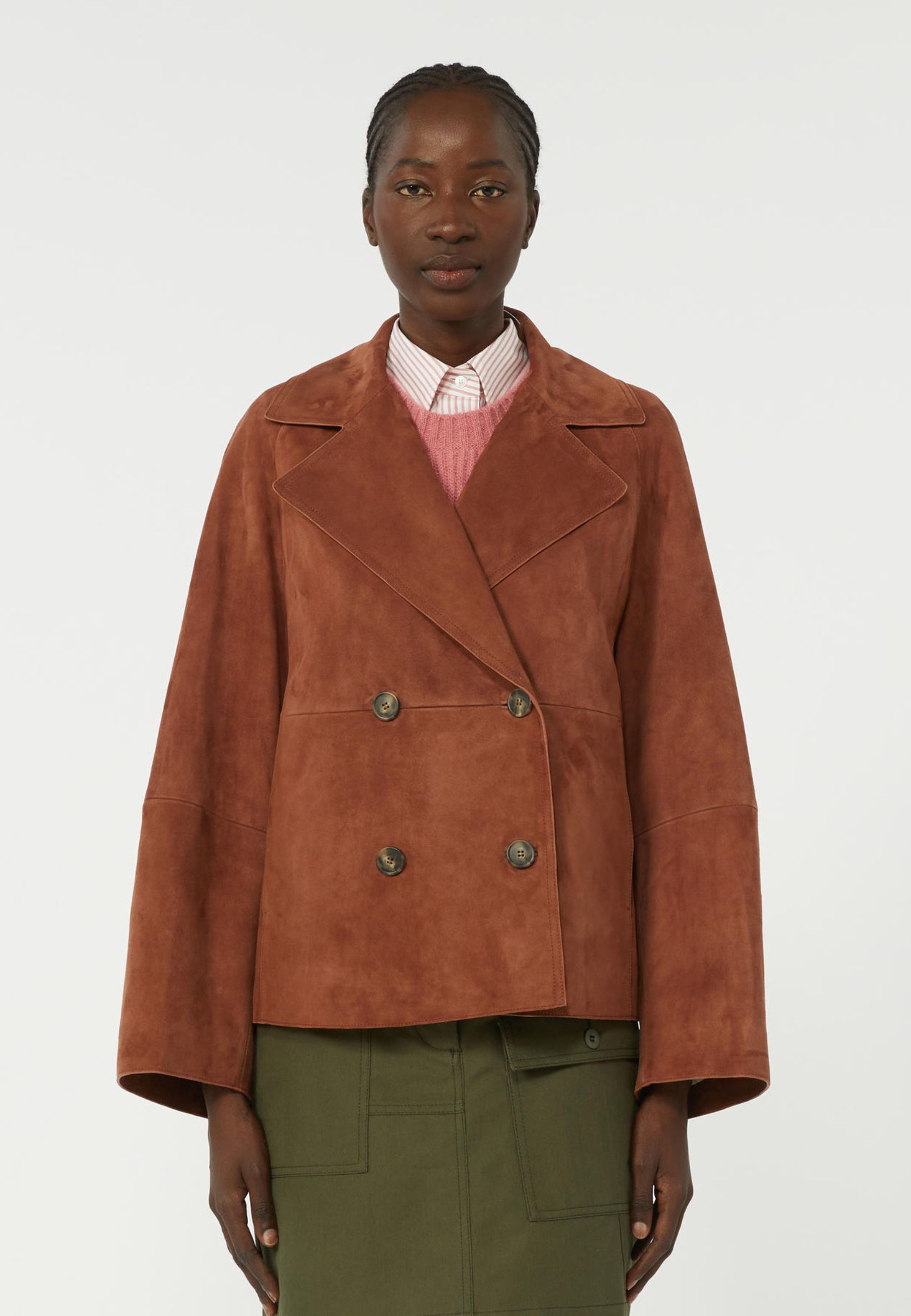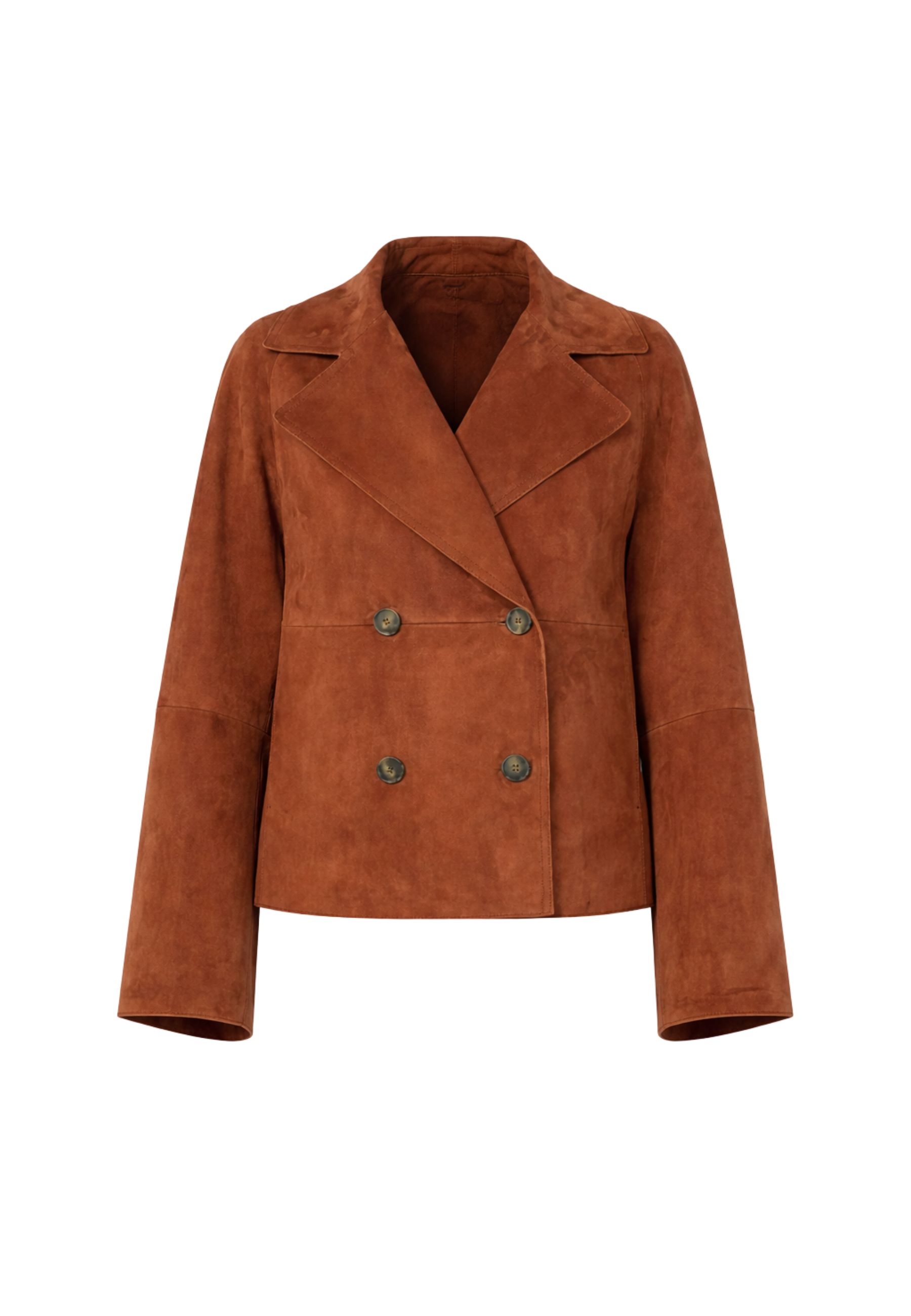 Giacca doppiopetto dal carattere raffinato e contemporaneo, ispirata alle linee iconiche del trench coat. Realizzata in morbida pelle scamosciata di capra, si distingue per la texture vellutata e la costruzione sartoriale che valorizza la silhouette con eleganza.