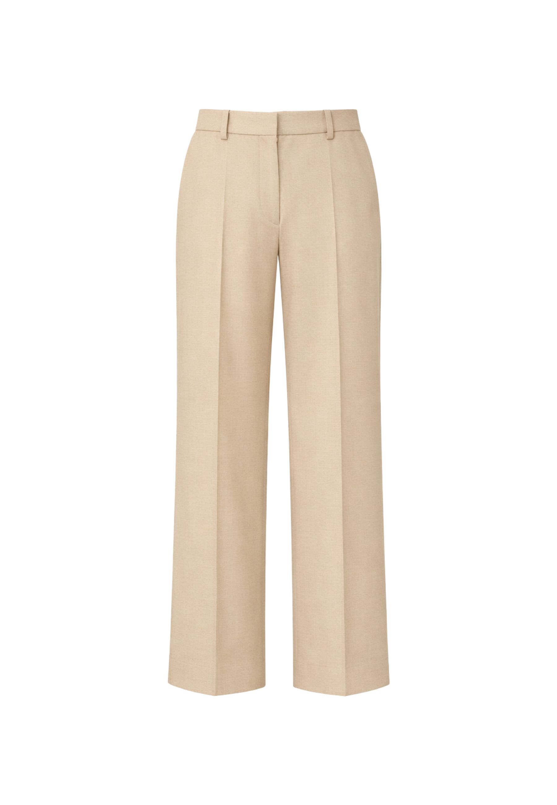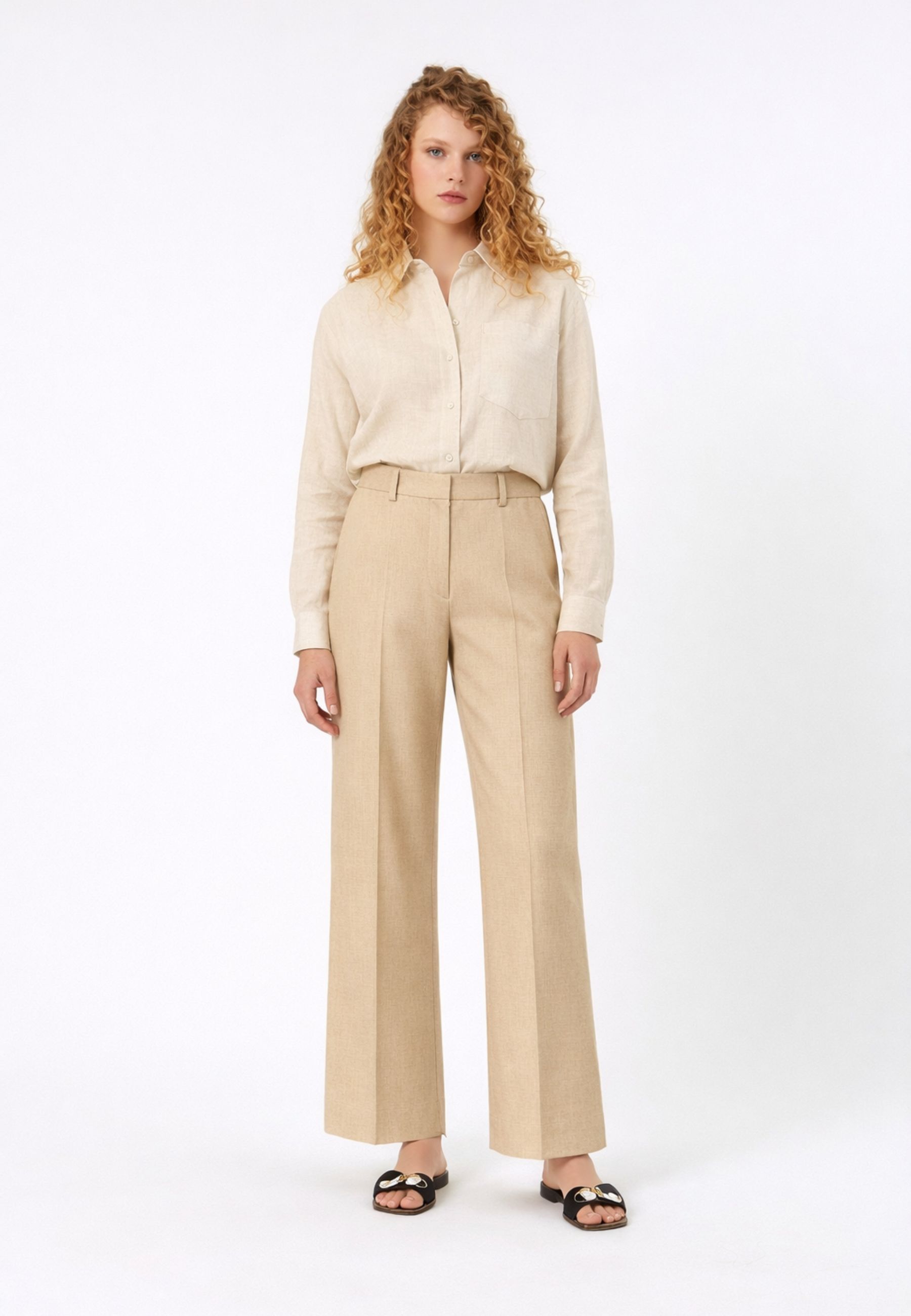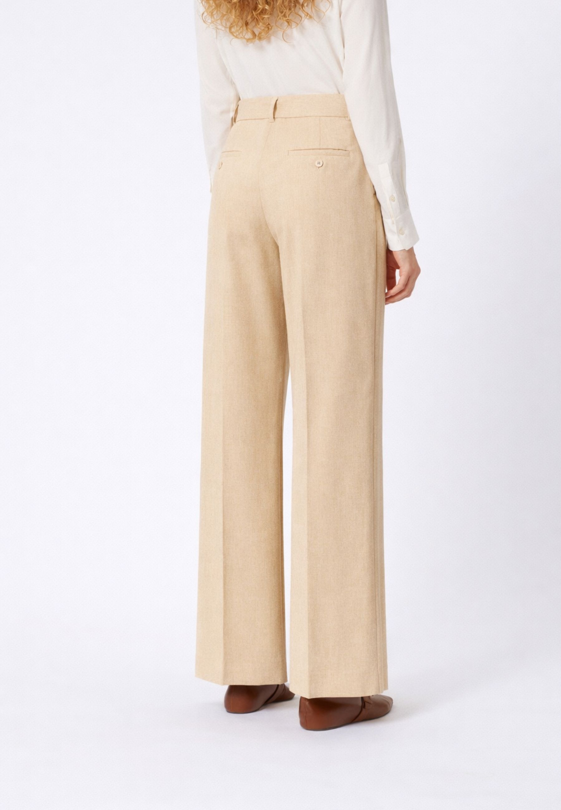 Il modello presenta gamba ampia e linea fluida, valorizzata dalla piega stirata centrale che slancia la figura. La costruzione è completata da listino alto in vita con passanti per cintura, chiusura con zip coperta da patta e gancetto e tasche alla francese sui fianchi. Sul retro sono presenti tasche a filetto con bottone, dettaglio classico ispirato alla sartoria maschile.