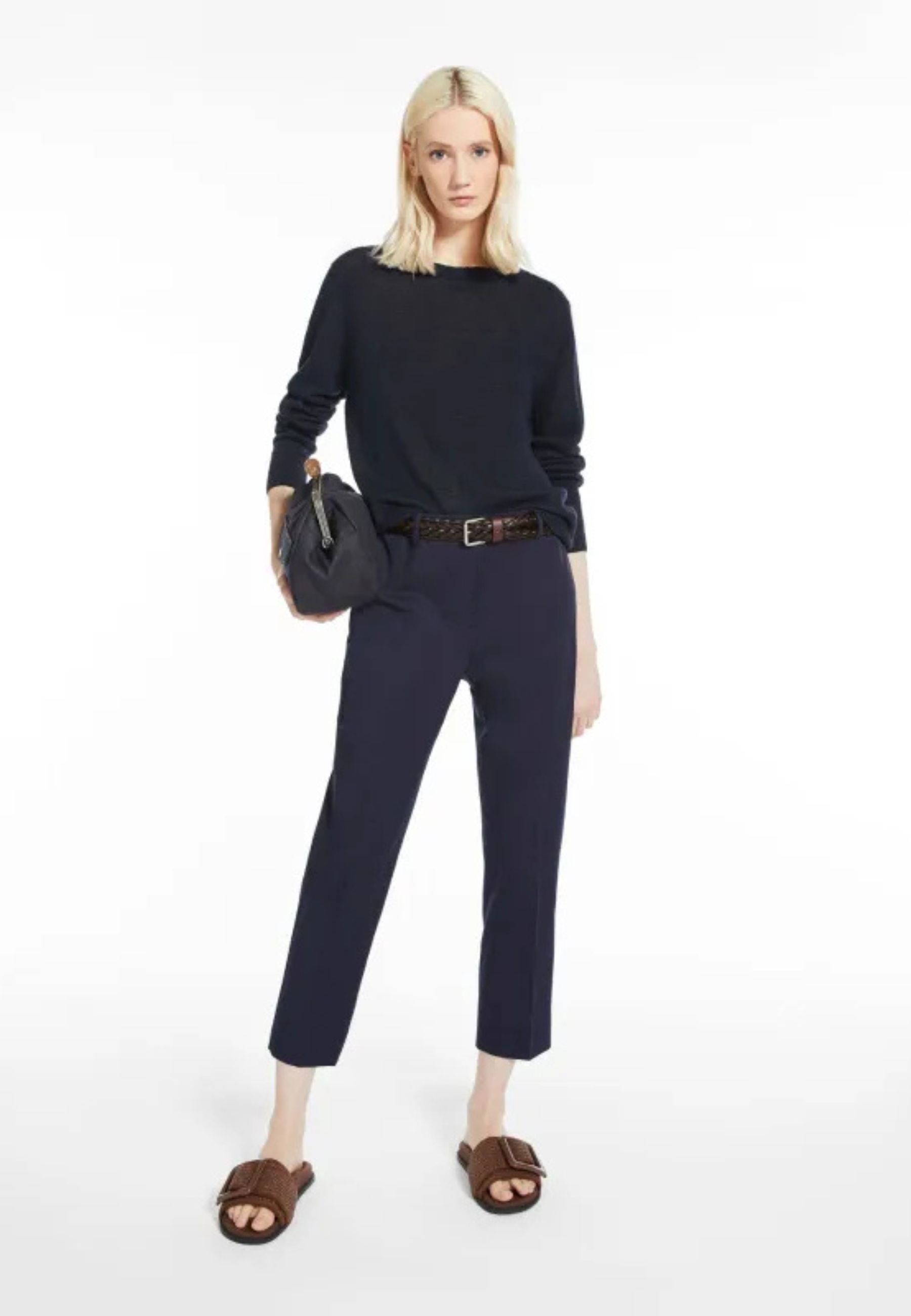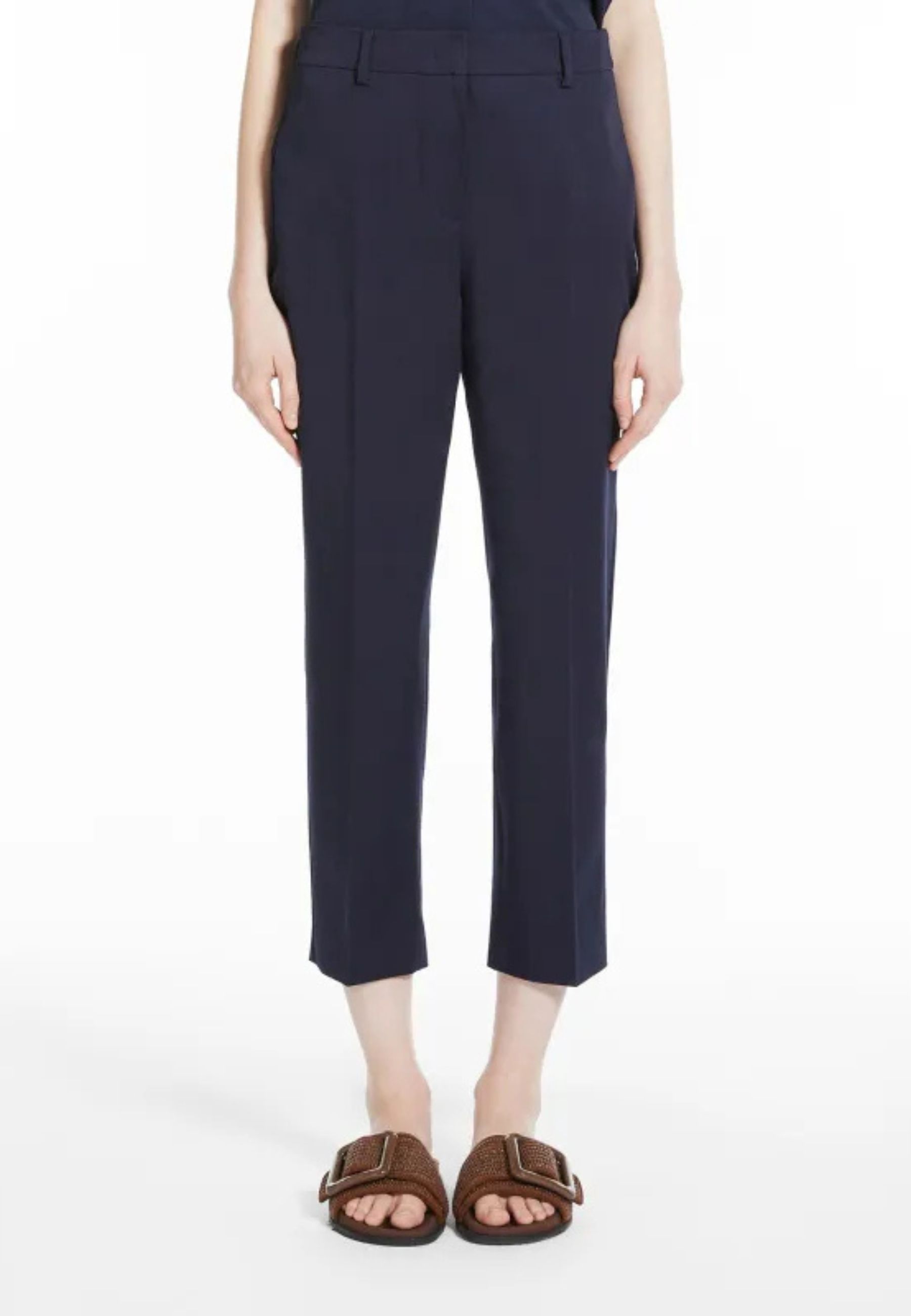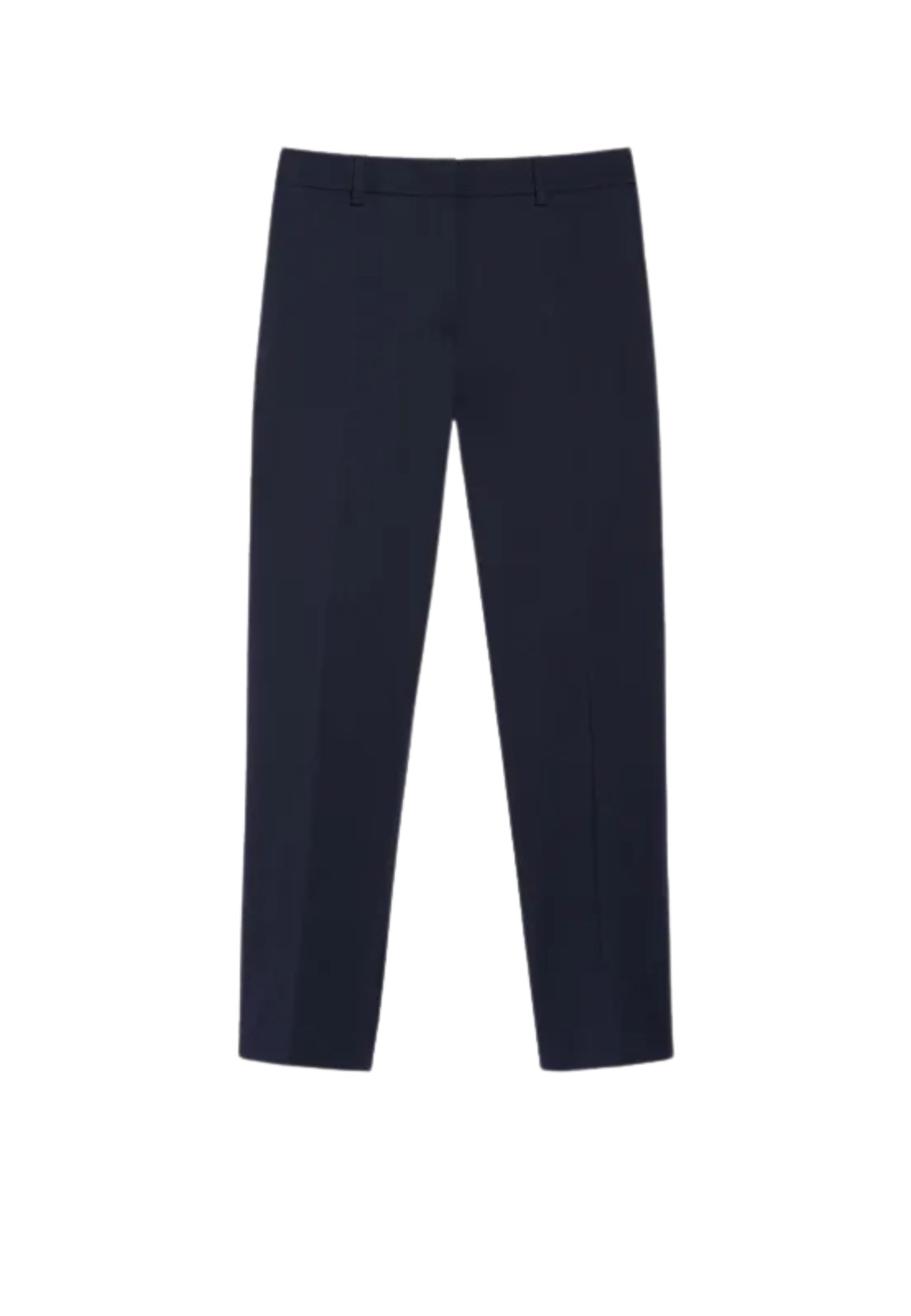 Pantaloni slim in gabardina di cotone stretch con piega stirata al centro e tasche a filetto sul retro. Chiusura con zip nascosta e gancio sul davanti. Linea dritta.